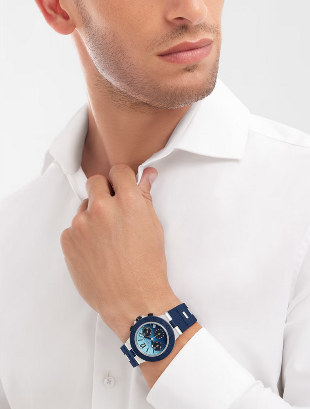 镜面 材质 | 蓝宝石水晶玻璃 | 表盘 | 铝钛金属表壳 带“Aluminium GMT”字样的蓝色表盘;镀铑时标,时针与分针覆以Super-LumiNova夜光涂层;黄色镀铑秒针;24小时刻度圈位于表盘外缘,以黑色和黄色显示,箭头形GMT(两地时)指针覆以Super-LumiNova夜光涂层 蓝色橡胶表圈,DLC涂层钛金属表冠 密底,镌刻训练舰名“Nave Scuola Amerigo Vespucci”及其格言的黑色DLC涂层钛金属表背 |