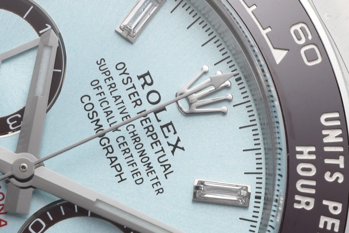表盘蓝色太阳纹普刻区别于钻刻,蓝色太阳纹更加沉稳大气。