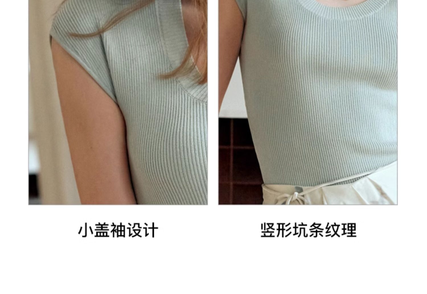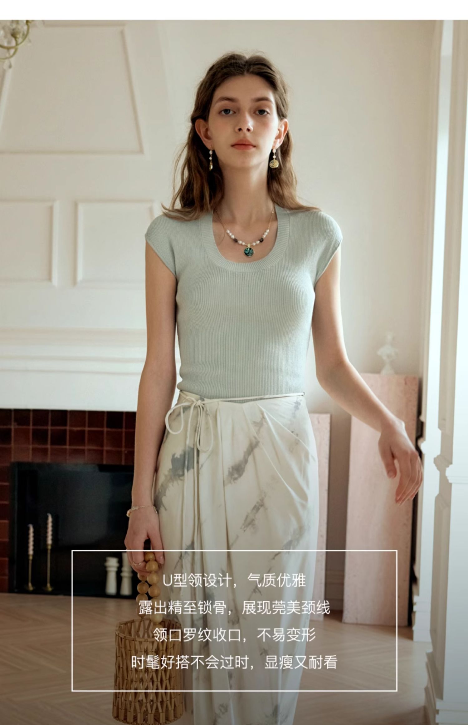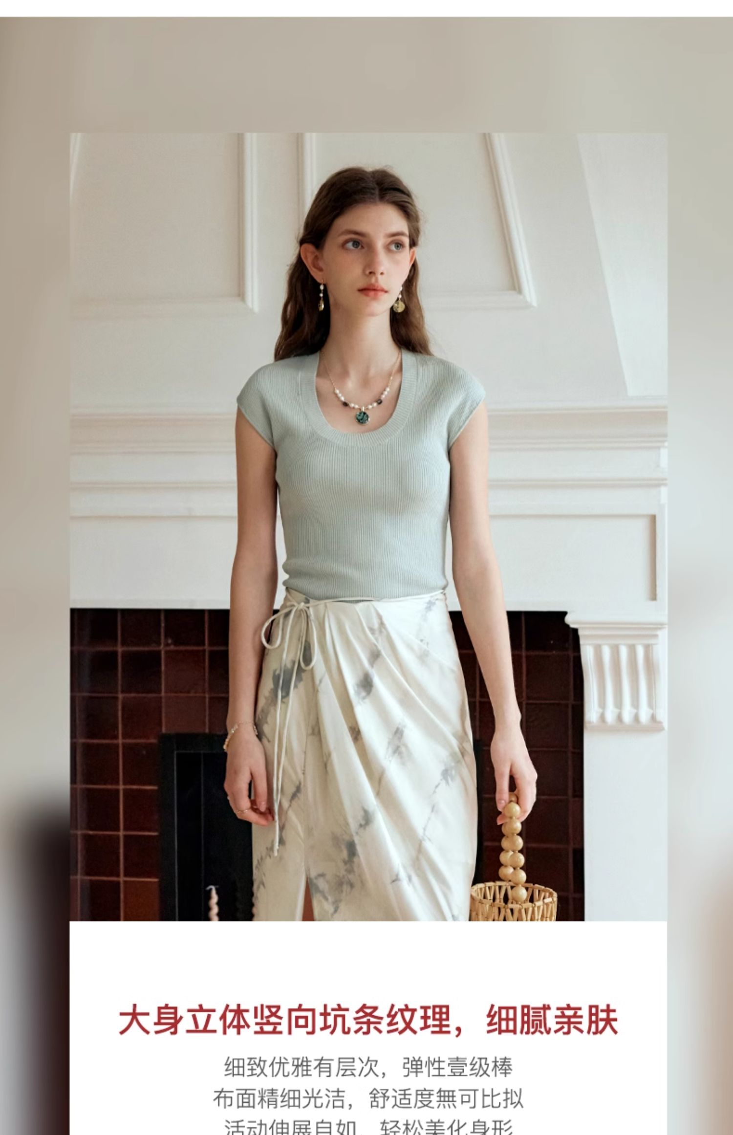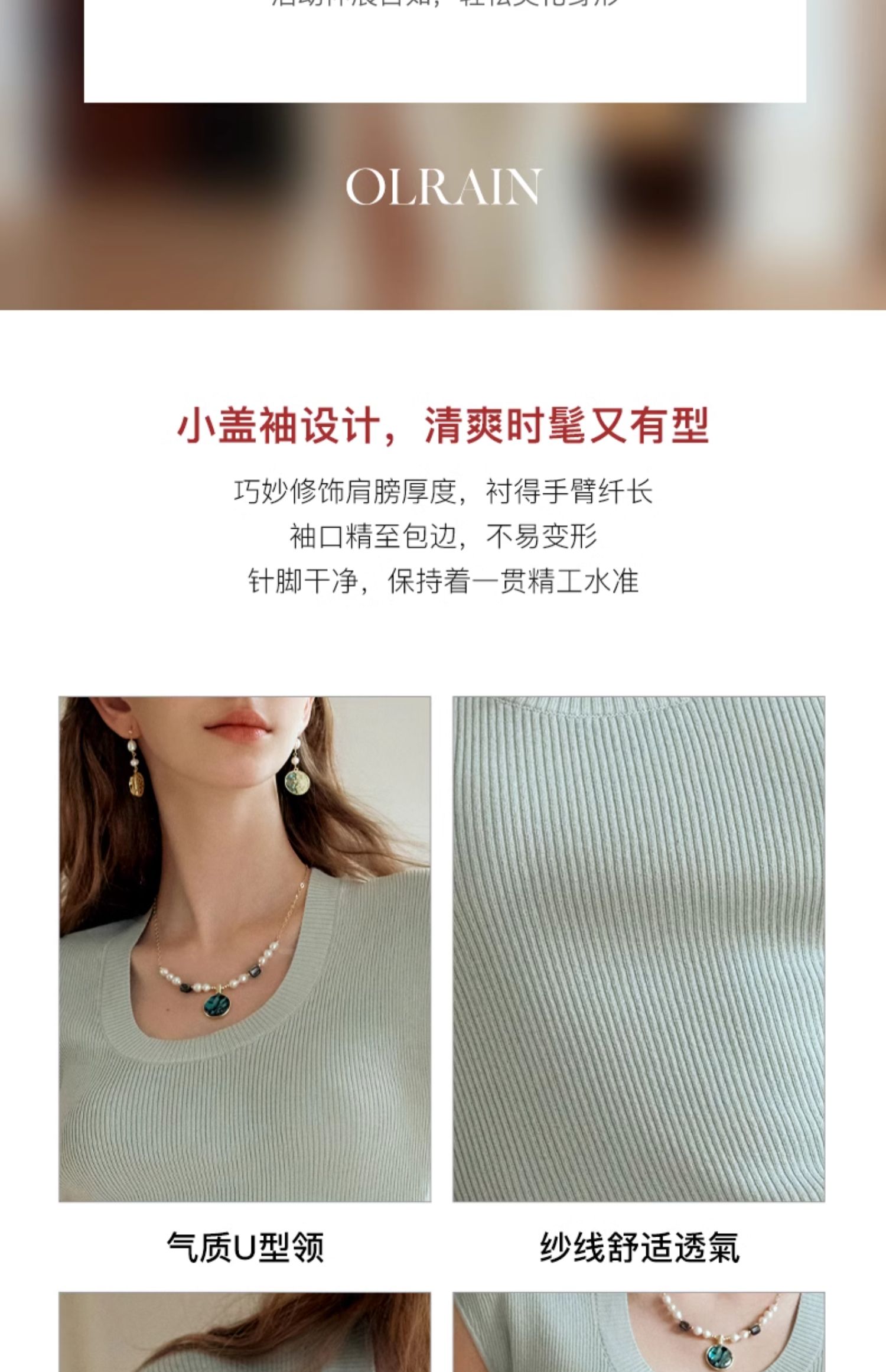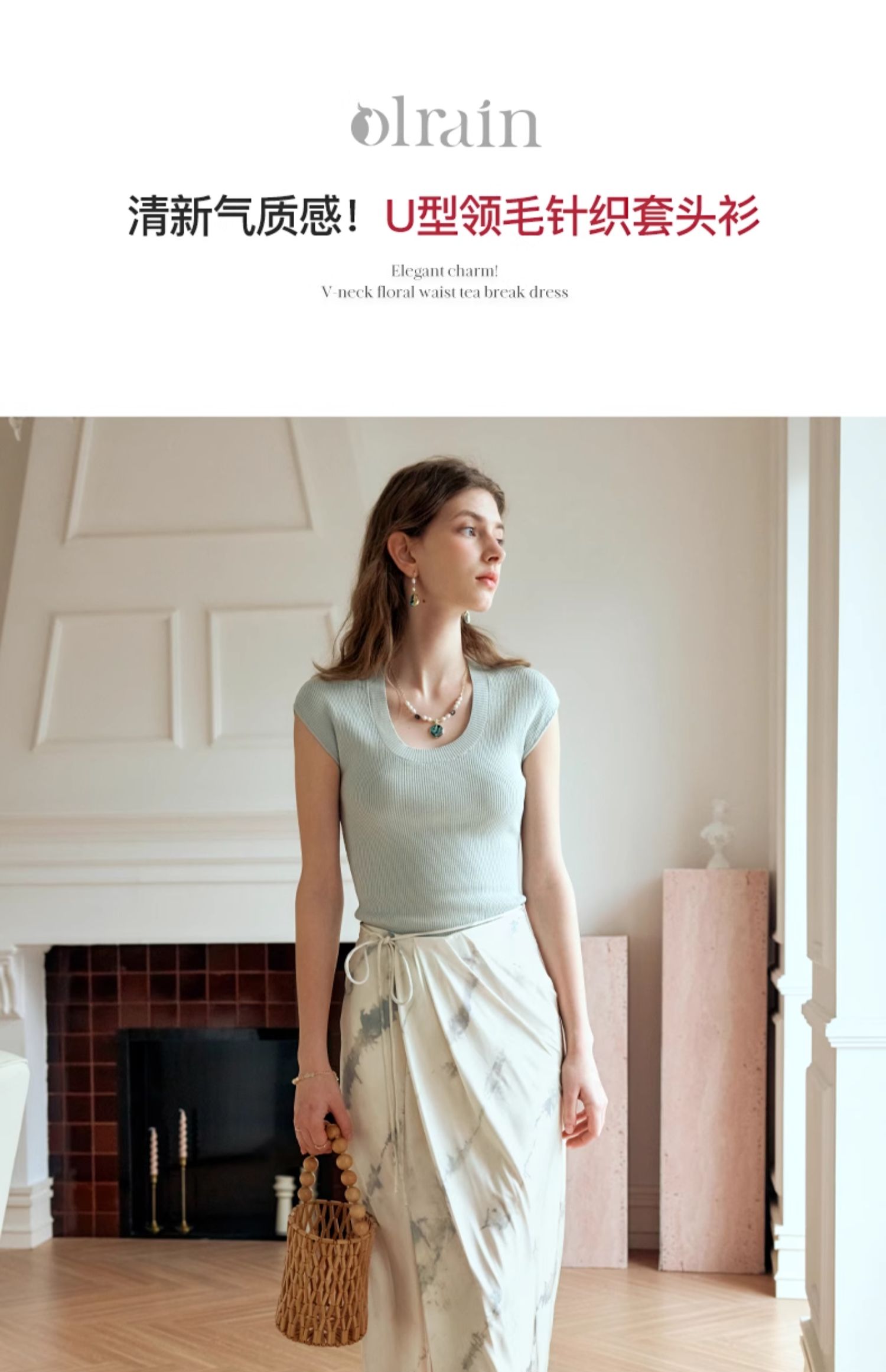 OLrain欧芮儿U型领针织衫女夏季2024年新款纯色小盖袖套头上衣