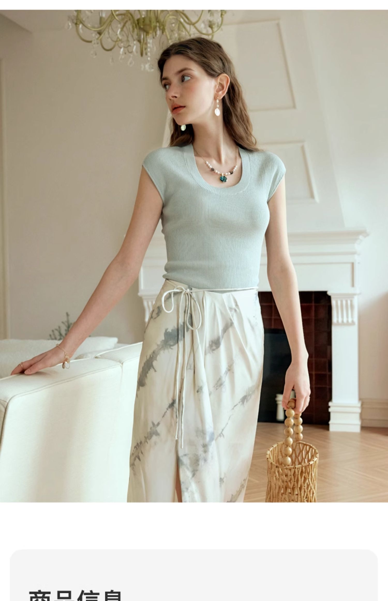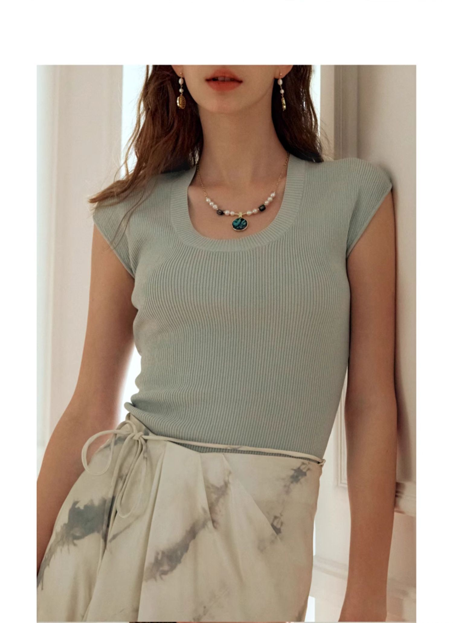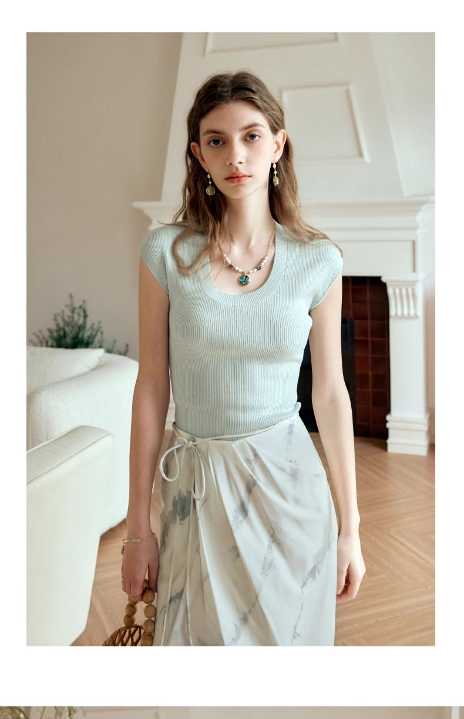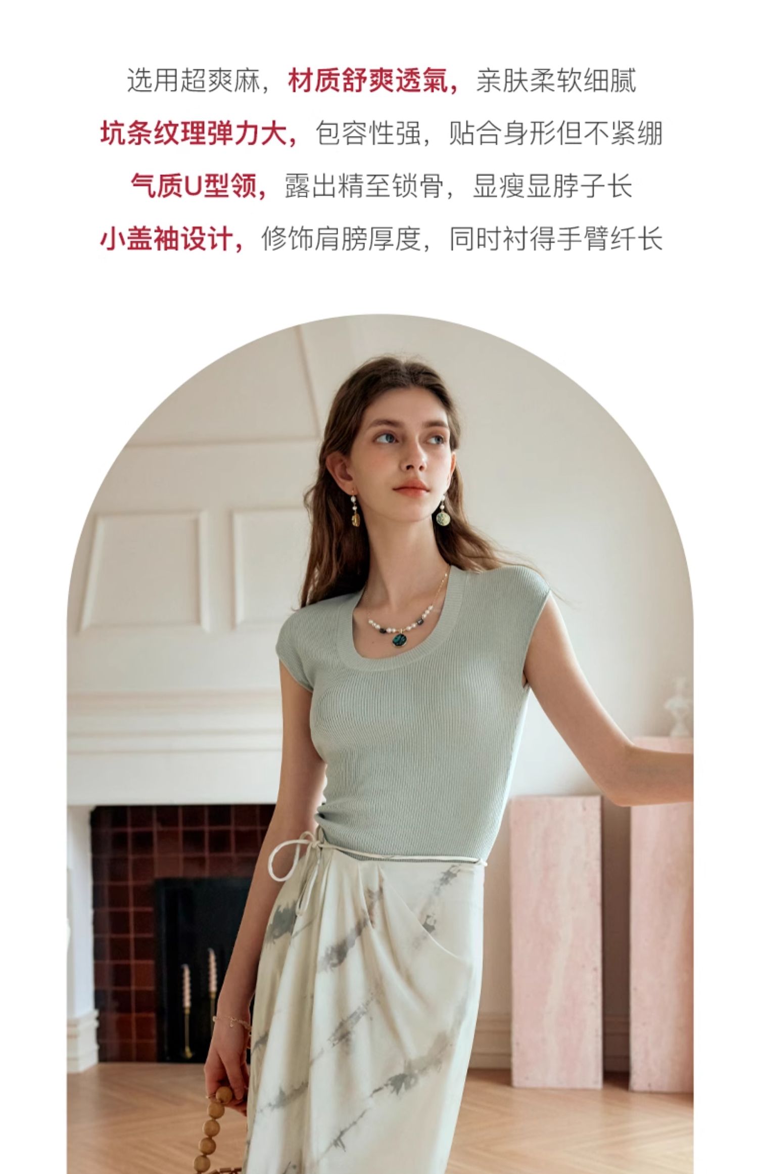 OLrain欧芮儿U型领针织衫女夏季2024年新款纯色小盖袖套头上衣