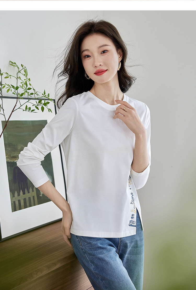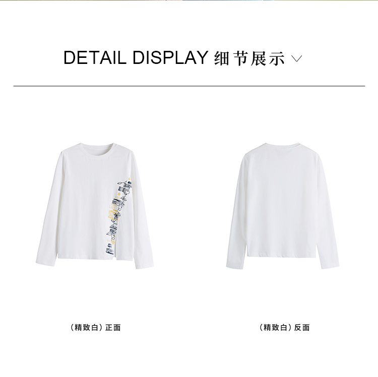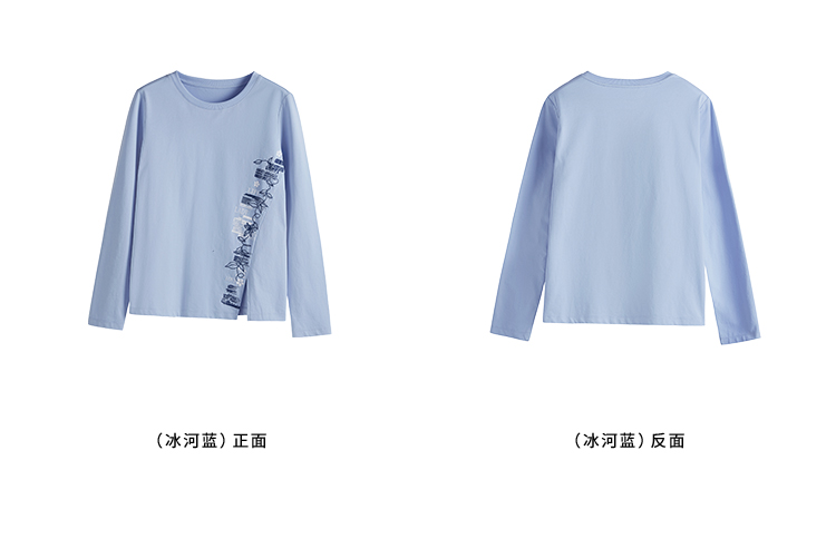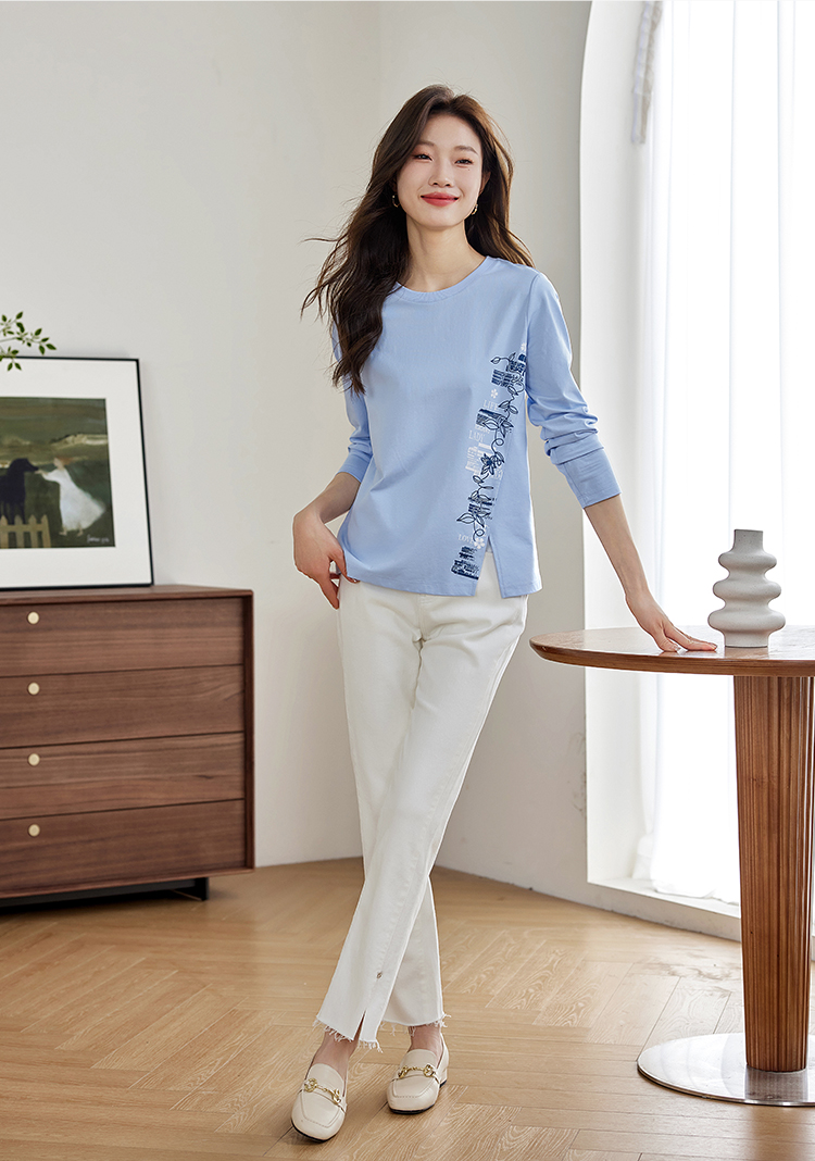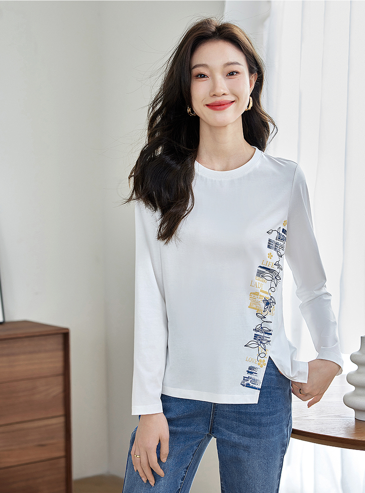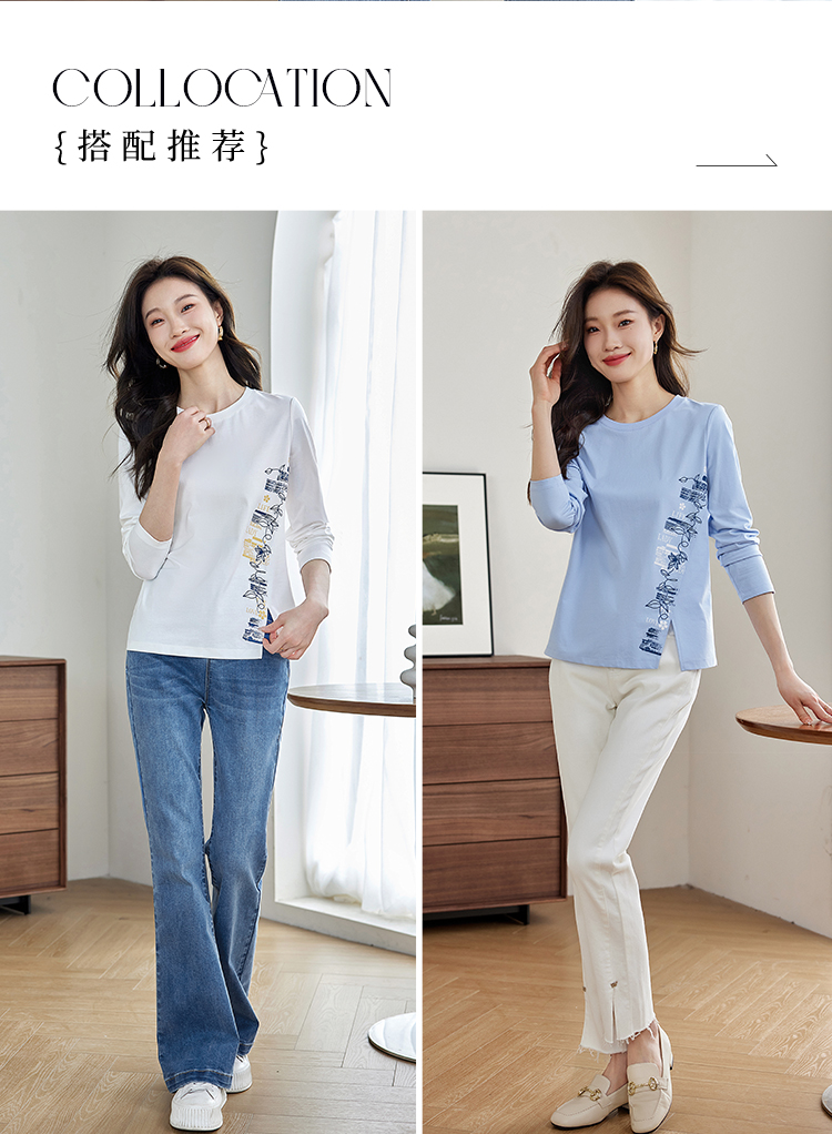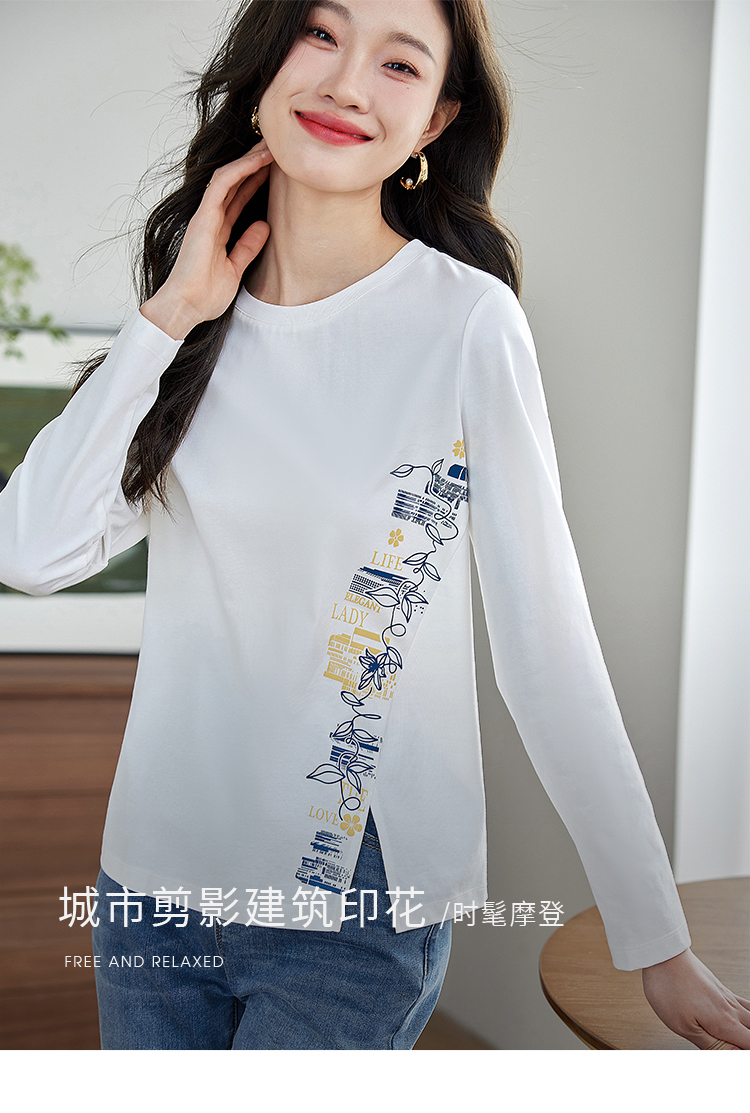 【1件77折】熙世界设计感T恤摩登视觉显瘦印花开叉圆领长袖上衣2025秋新款