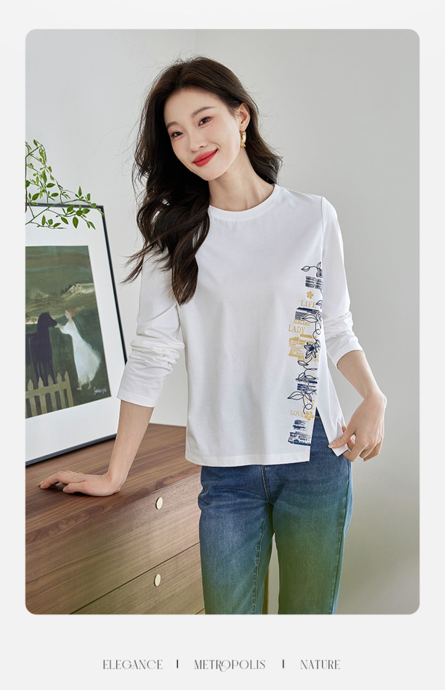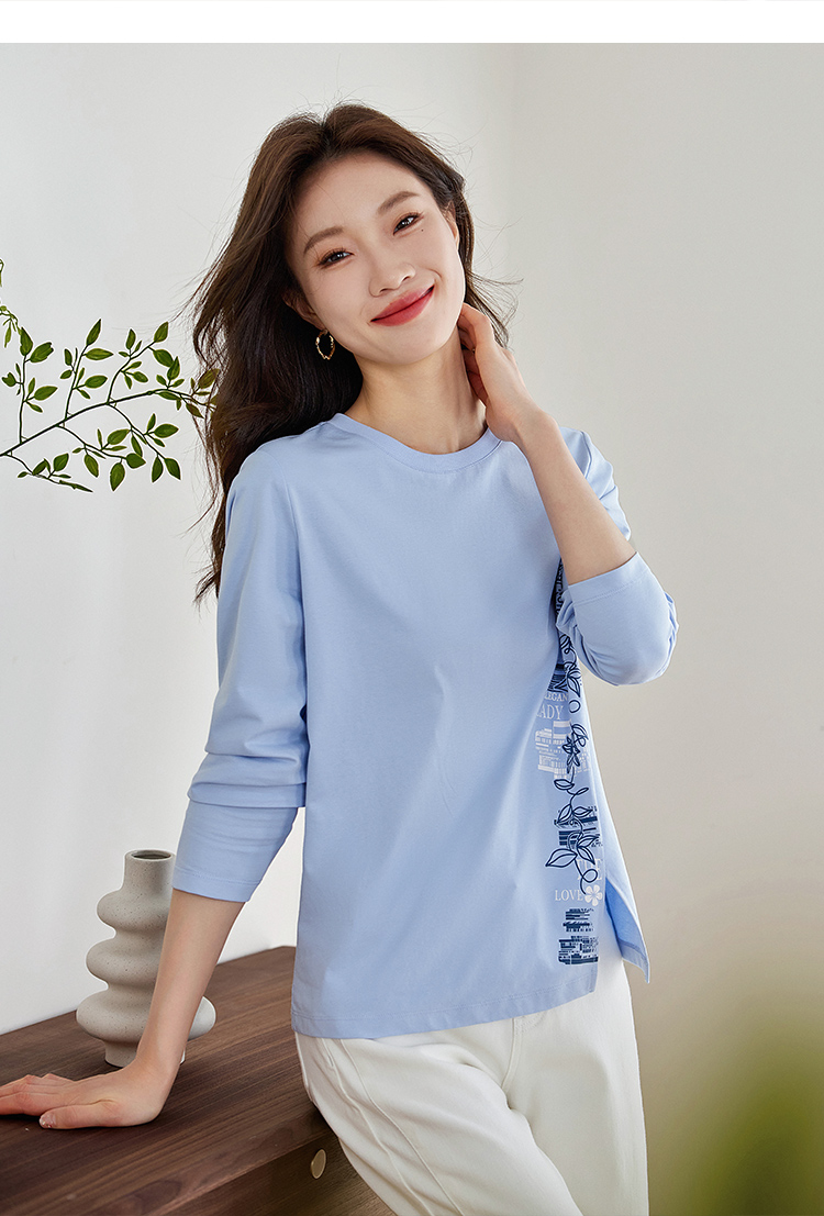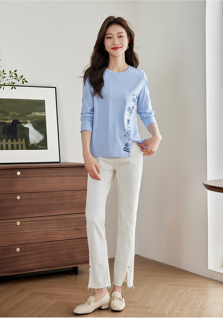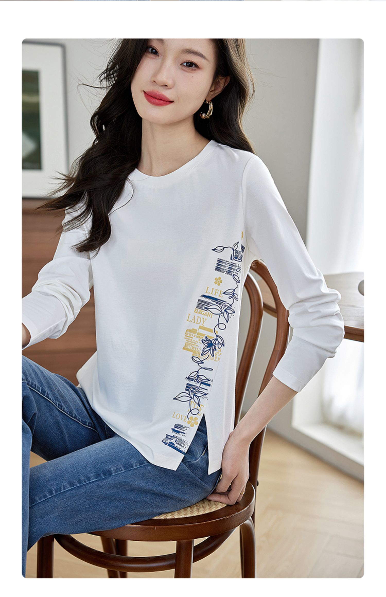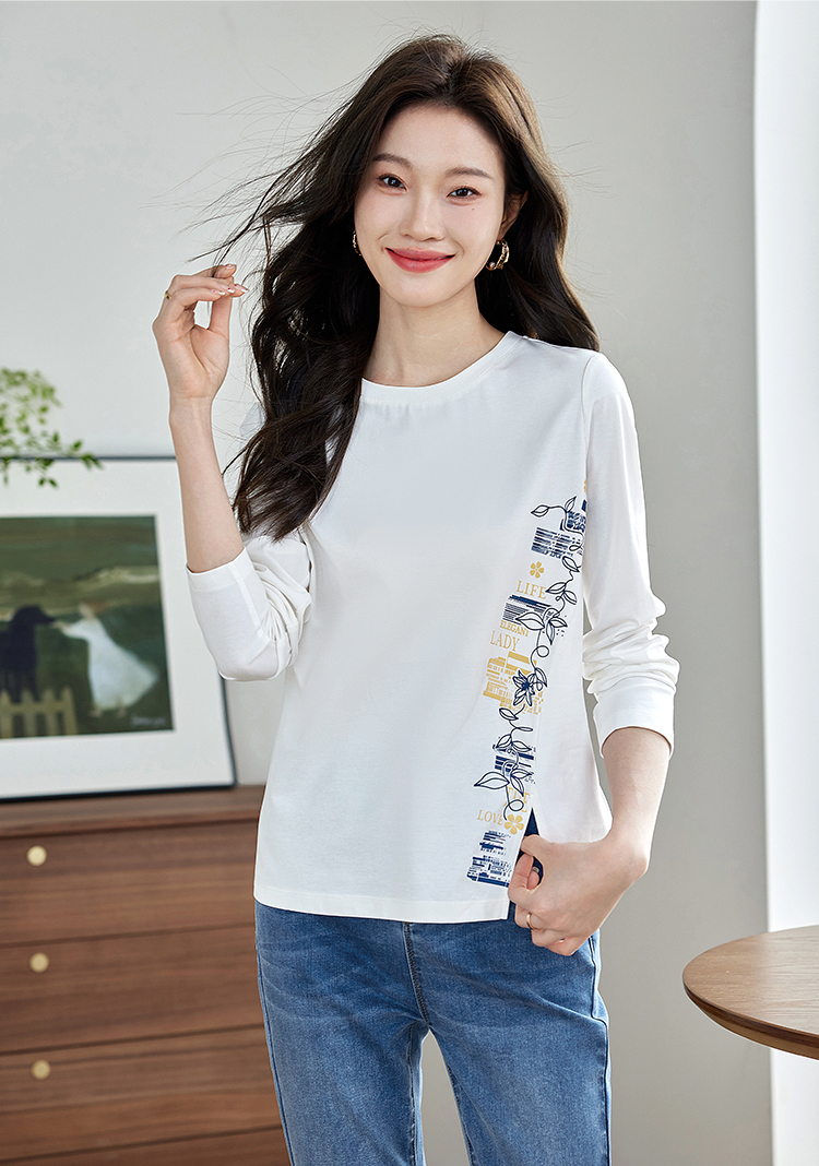 【1件77折】熙世界设计感T恤摩登视觉显瘦印花开叉圆领长袖上衣2025秋新款