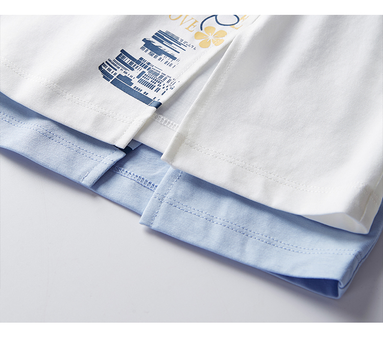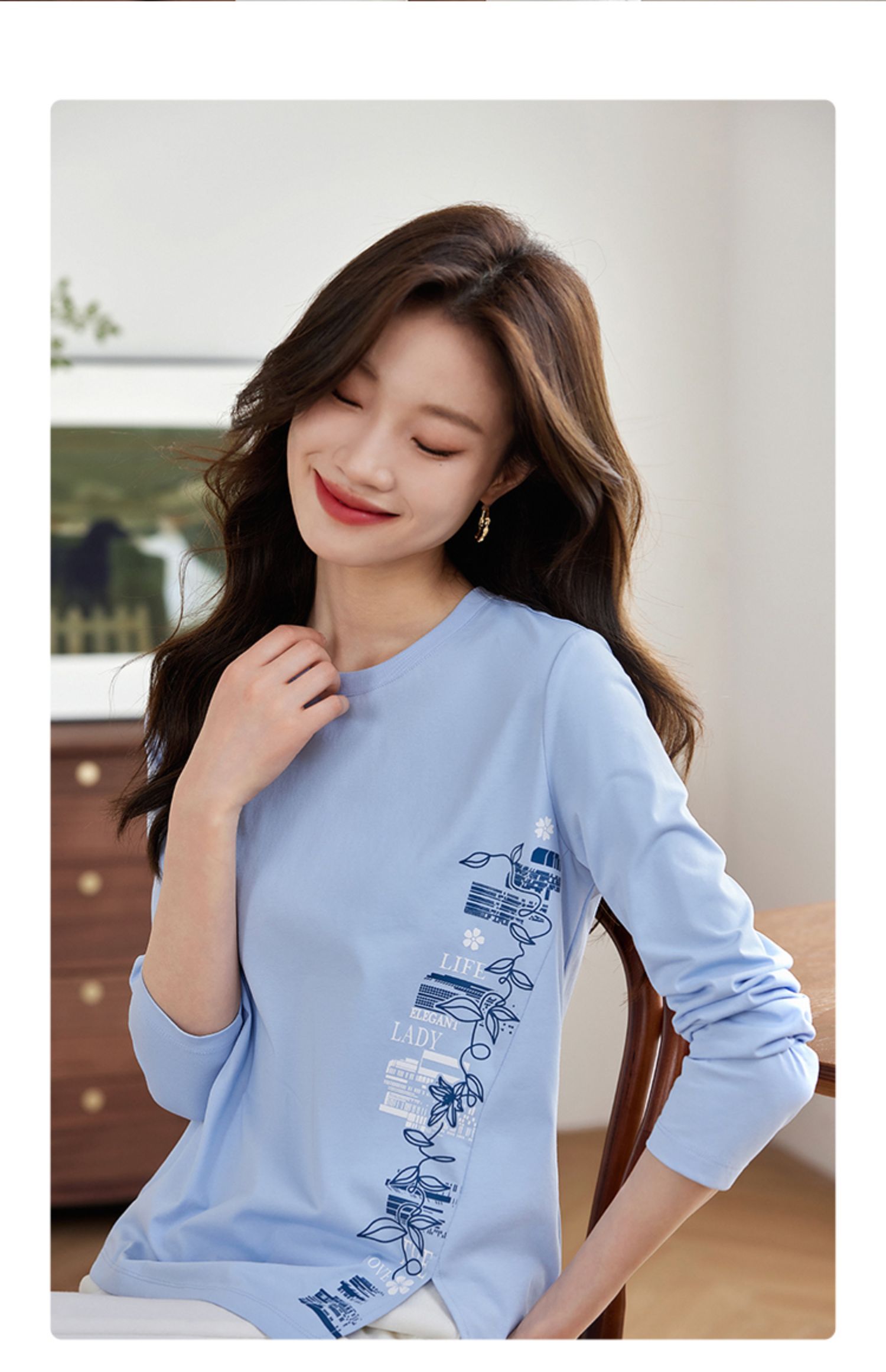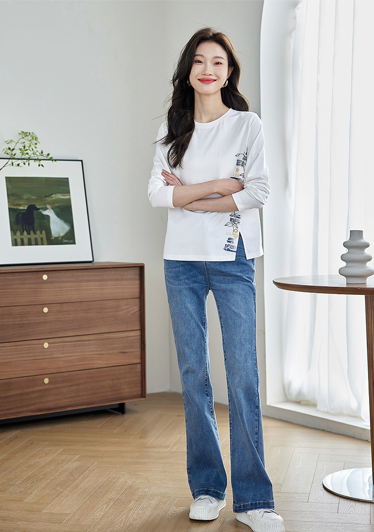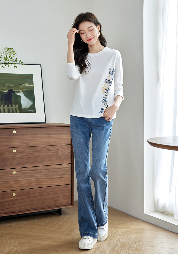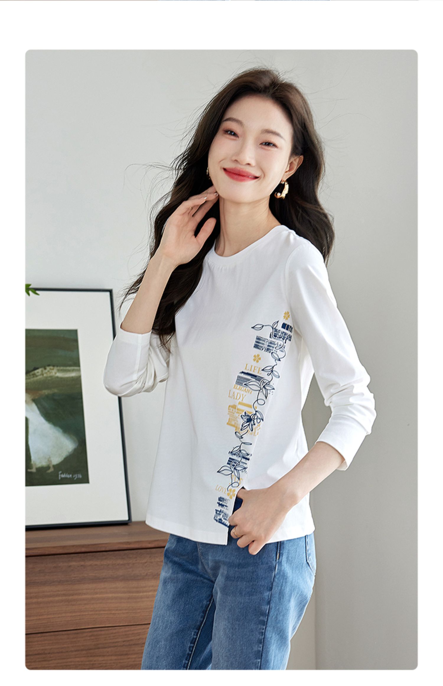 【1件77折】熙世界设计感T恤摩登视觉显瘦印花开叉圆领长袖上衣2025秋新款