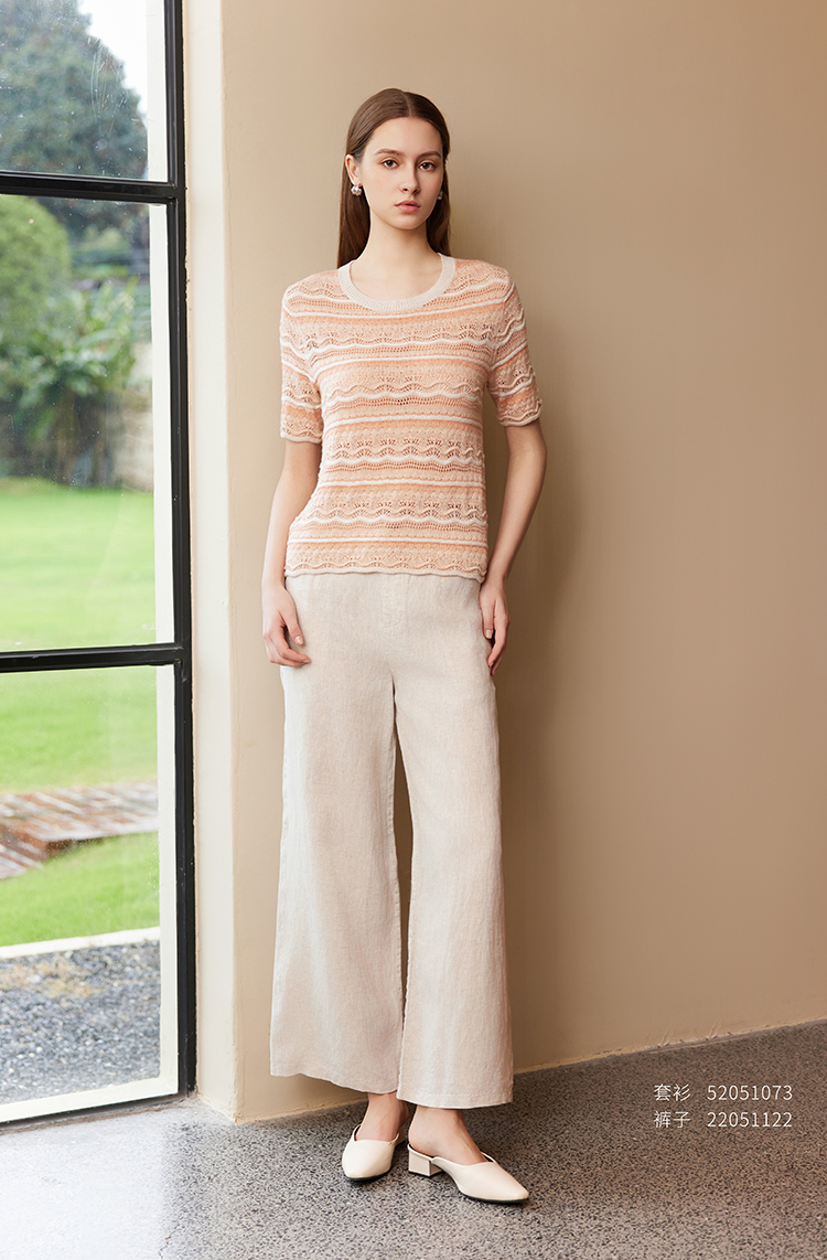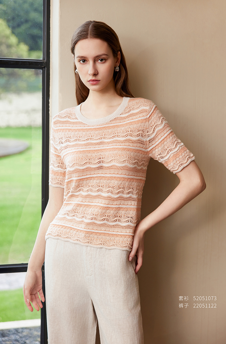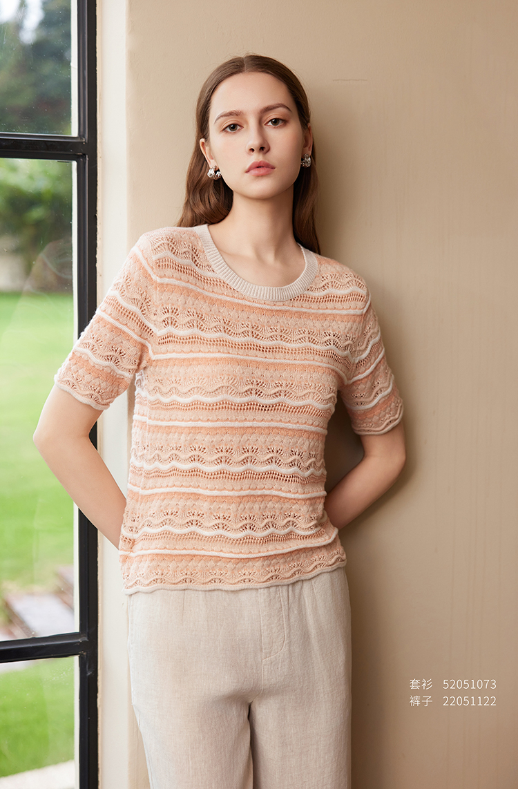 【条纹镂空针织套衫】25年春夏新品女士棉质圆领针织套衫短袖条纹衫