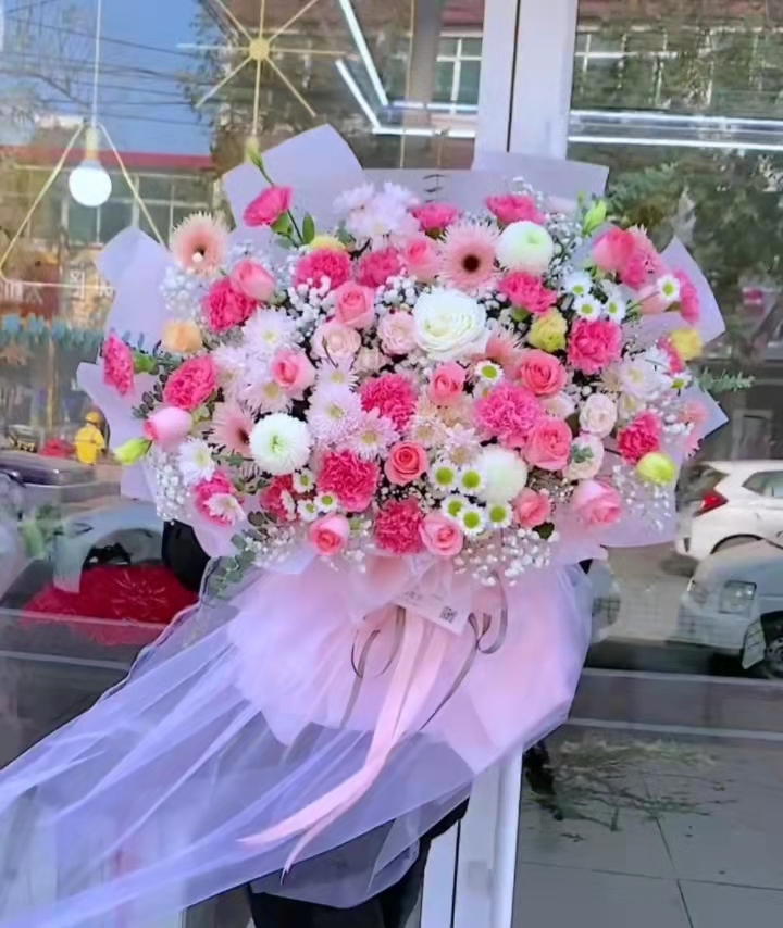 花材:20支康乃馨,20支粉玫瑰,10支粉色弗兰花,小雏菊半扎 桔梗半扎 满天星半扎 乒乓菊5个