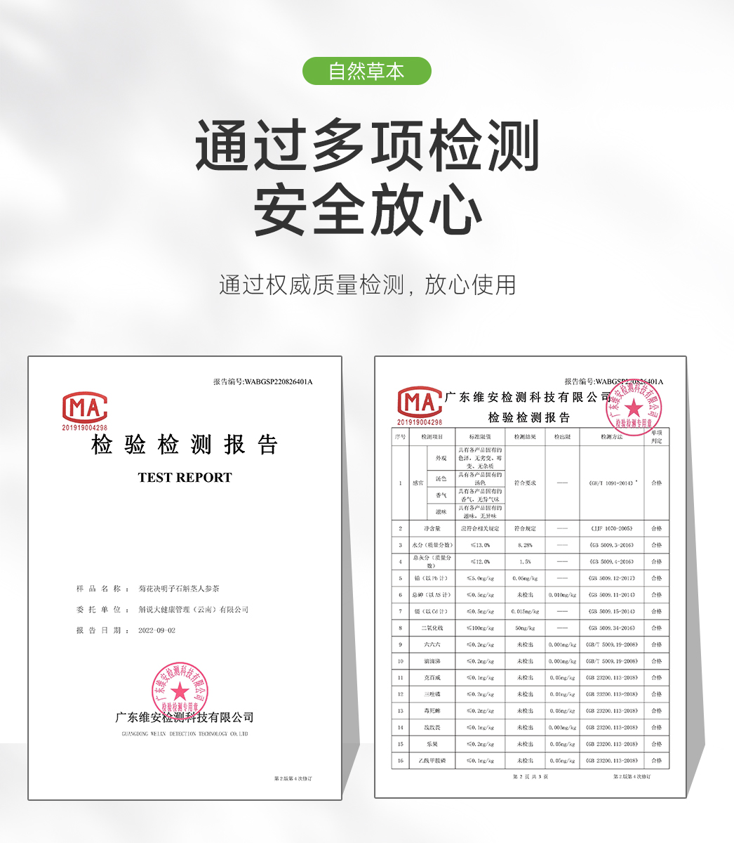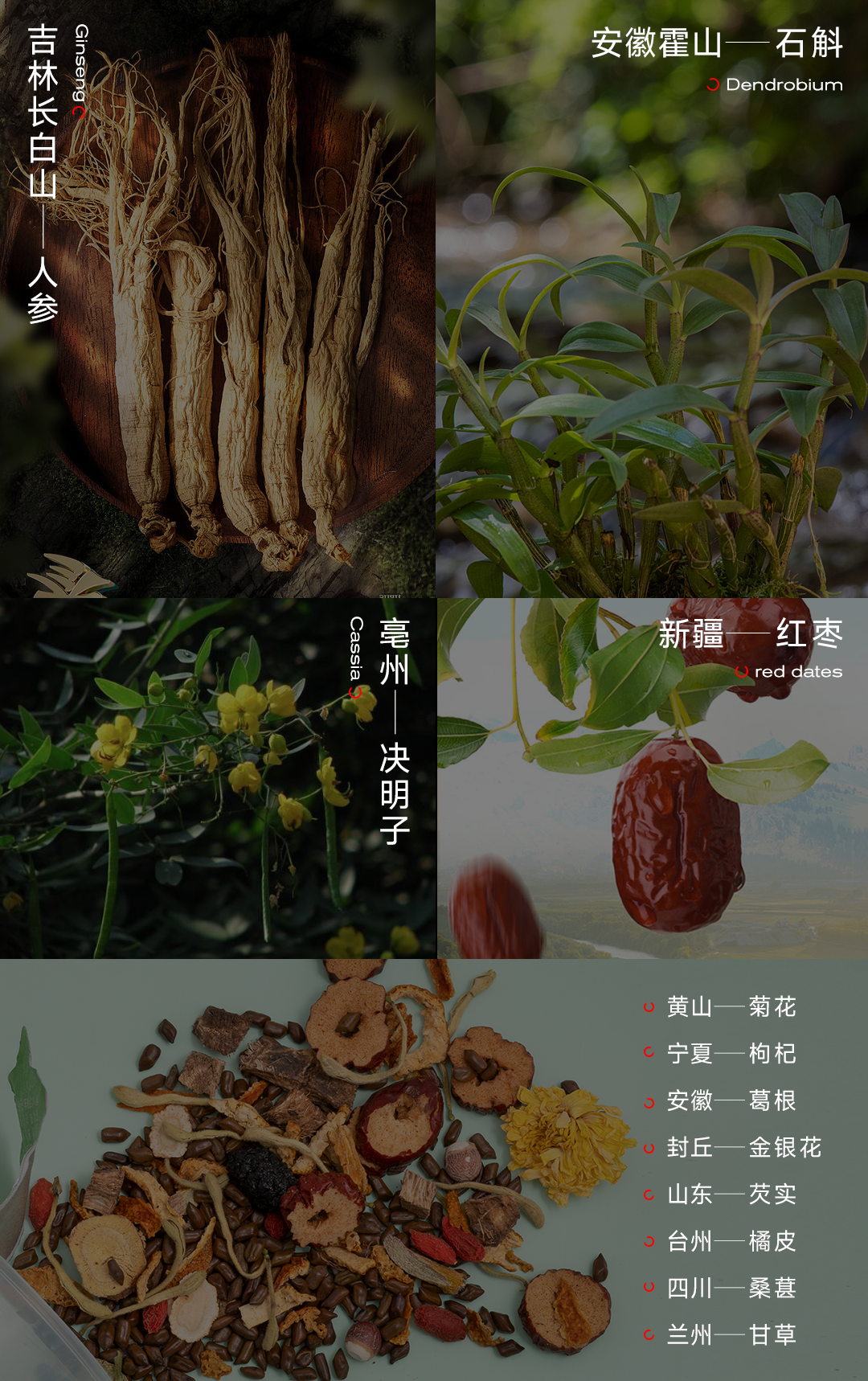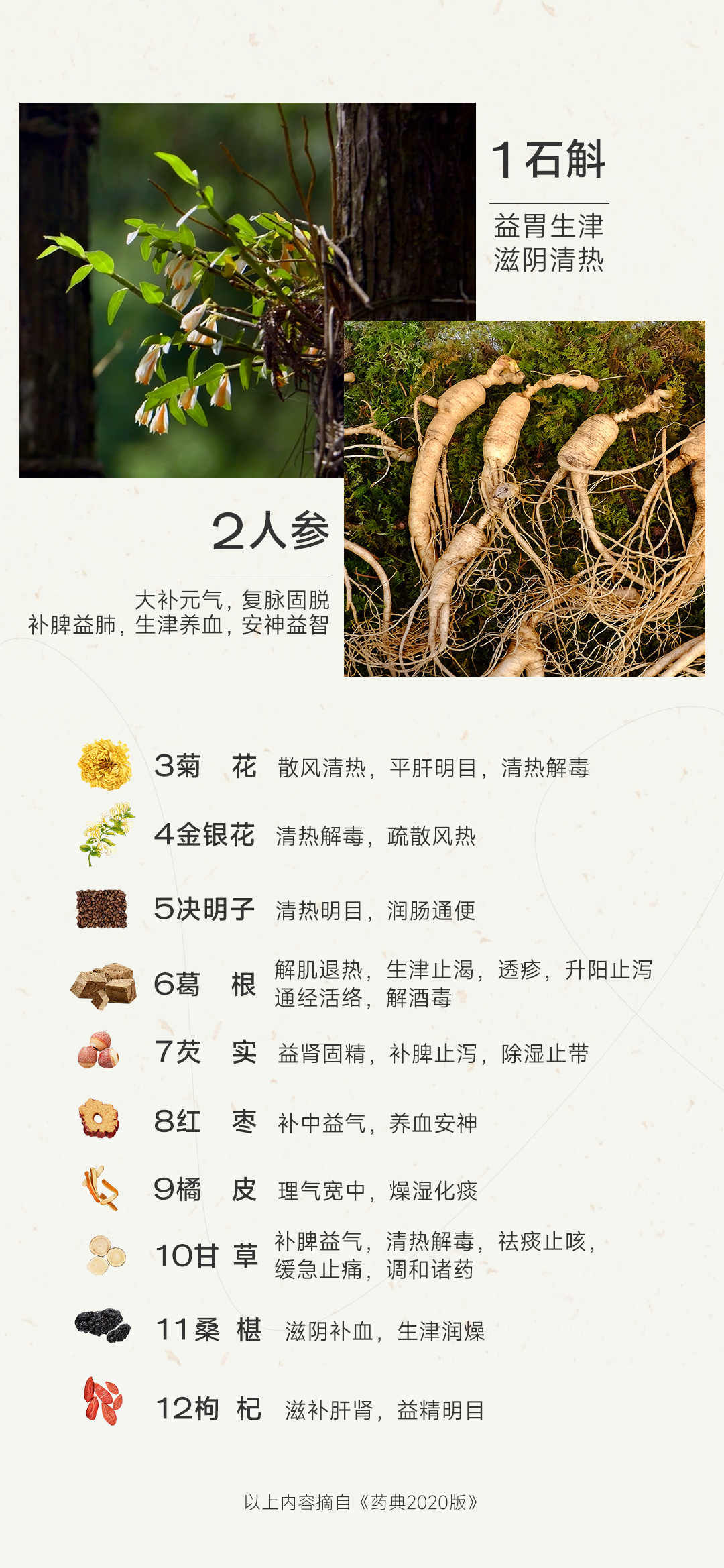 【配料】菊花、金银花、人参、决明子、葛根、芡实、石斛、红枣、橘皮、甘草、桑葚、枸杞