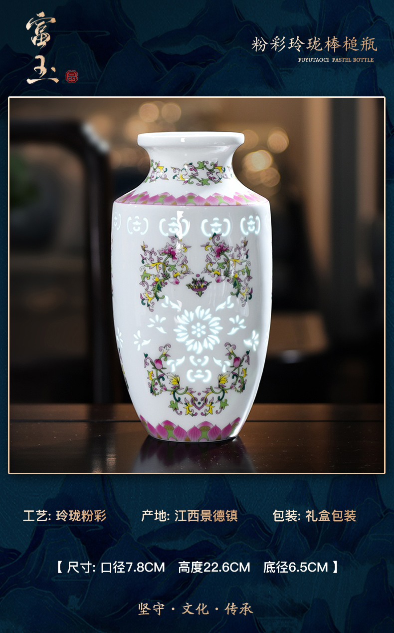 富玉 粉彩玲珑中式花瓶 蝙蝠寿桃 居家装饰摆件