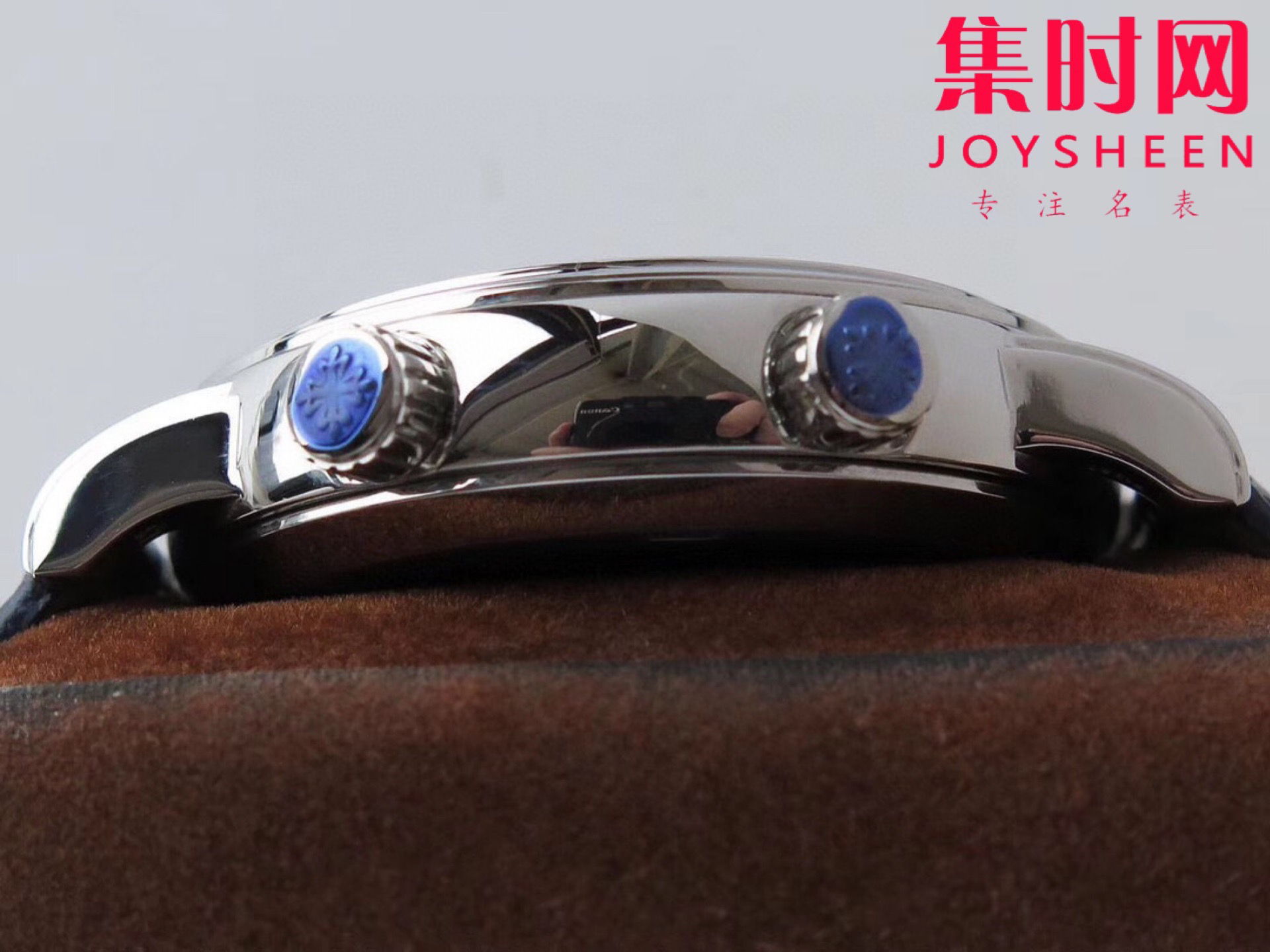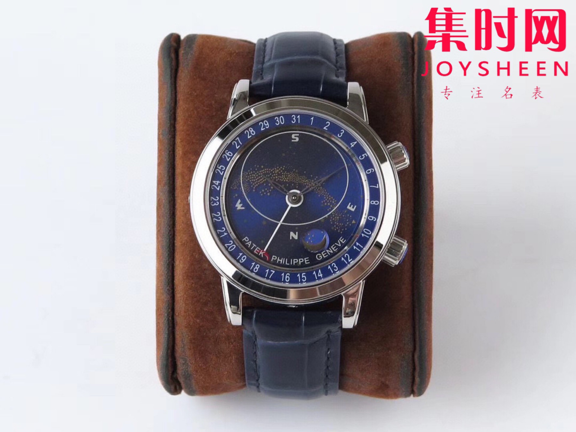 "贵族的标志"百达翡丽 (Patek Philippe) Sky Moon 手表内藏天空全景,将北半球最耀眼的星空,以独特的三层表盘以不同的速度转动,精确显示出星体及月亮在夜空中运转的穹苍全景。星象图由三块不同的圆盘共同组成:两块圆盘分别显示星空背景和月相,另有一块透明水晶圆盘显示星象图和银河 。盘面上时分针采用柳叶形镂空设计,蓝盘配银灰色指针;黑盘配乳白色指针。中心采用原装一致的实心抛光中轴,独家工艺。透明表底可尽览240 LU CL C型珍珠陀机芯风貌,这枚机芯直径38毫米,厚度6.81毫米,共含315个零件,12个夹板,45颗宝石,振频28800次/小时,最大动力存储可达48小时,并配备22K金偏心迷你摆陀。 快拆表带是手工缝制的亮色方形鳞纹表带搭折叠式表扣 。2点位把头调透明星象表盘可同时读取月相时间,透明星象表盘一个月转一圈,4点位把头调星空表盘,圆○窗显示月相,6点位表壳同原装一样包嵌一颗钻石永不掉钻!