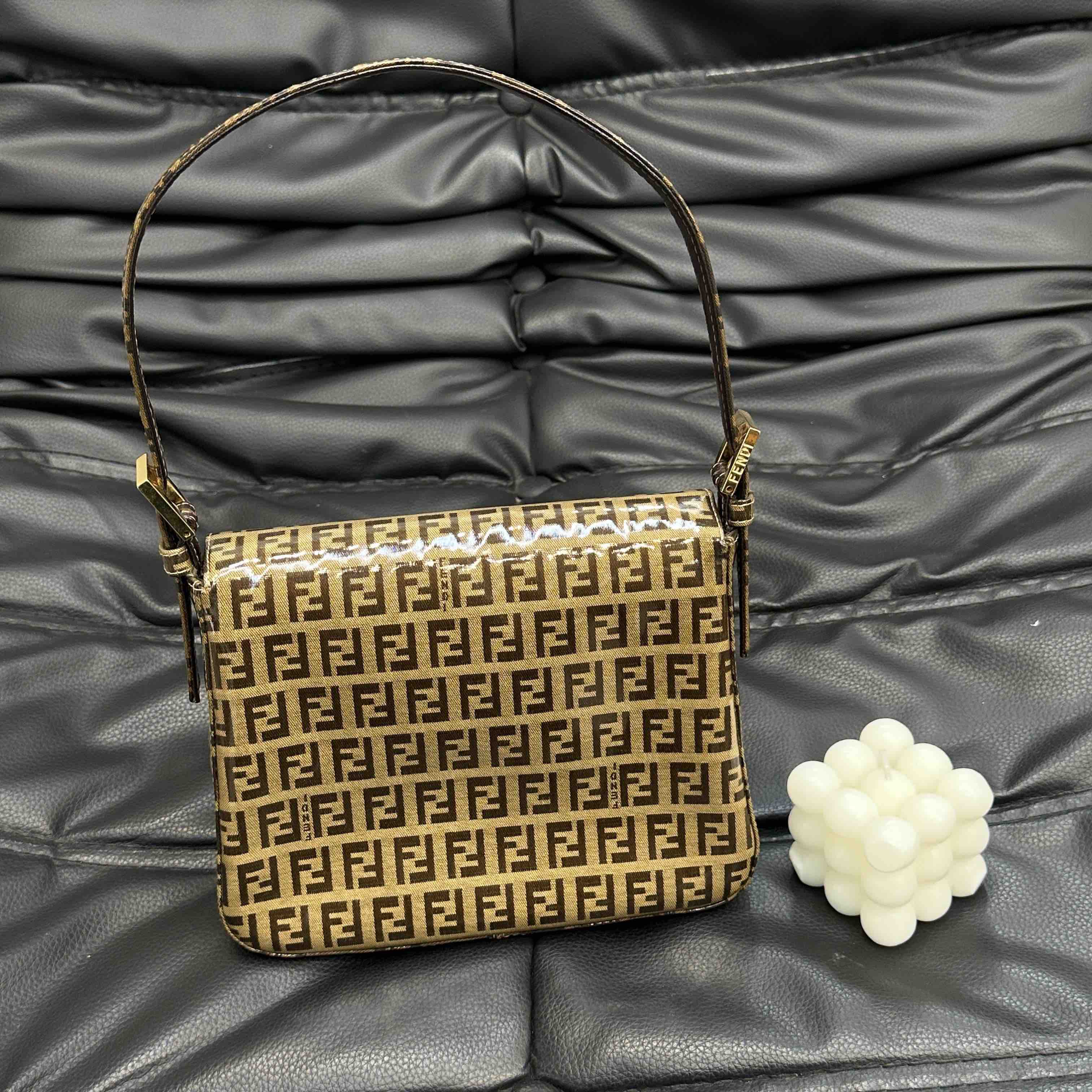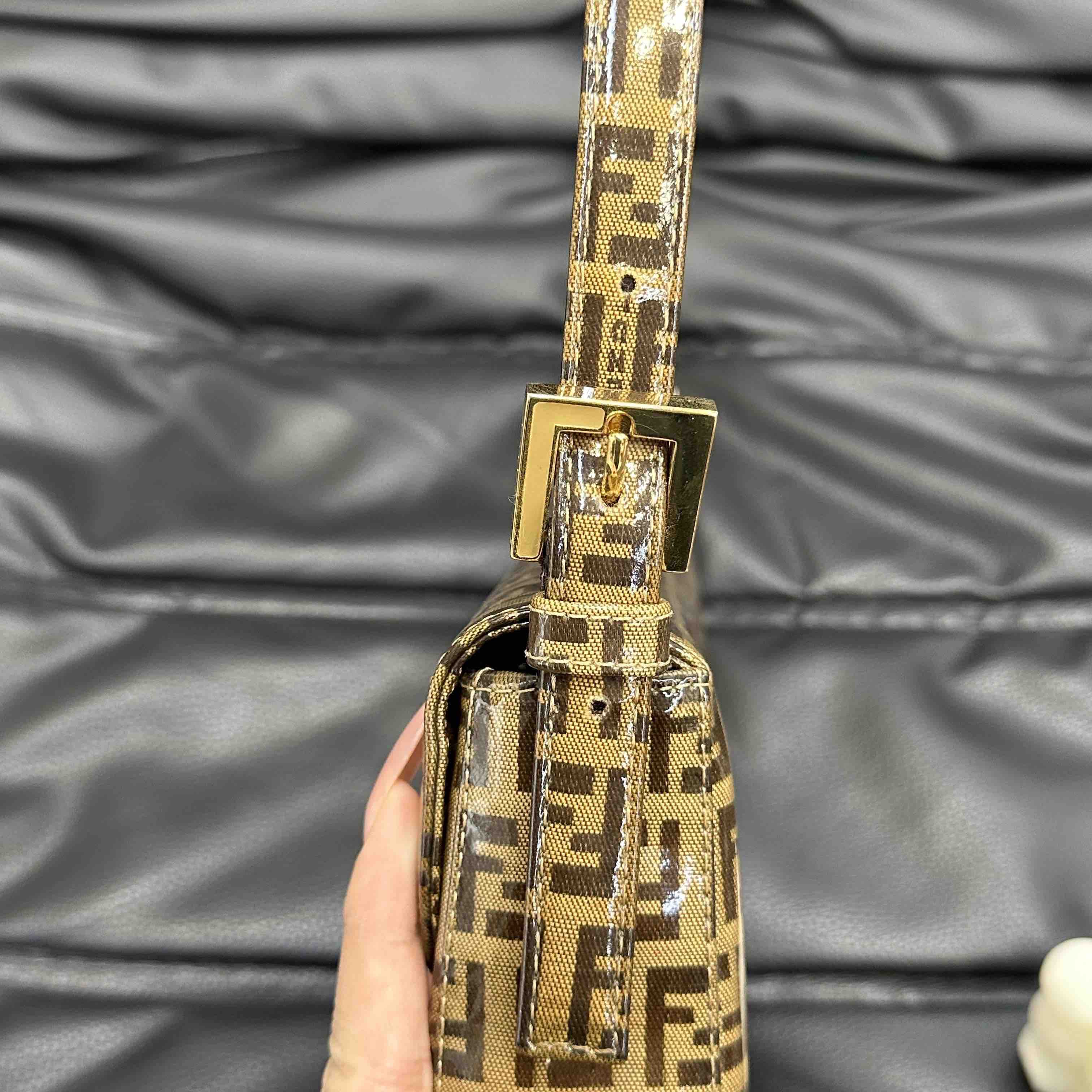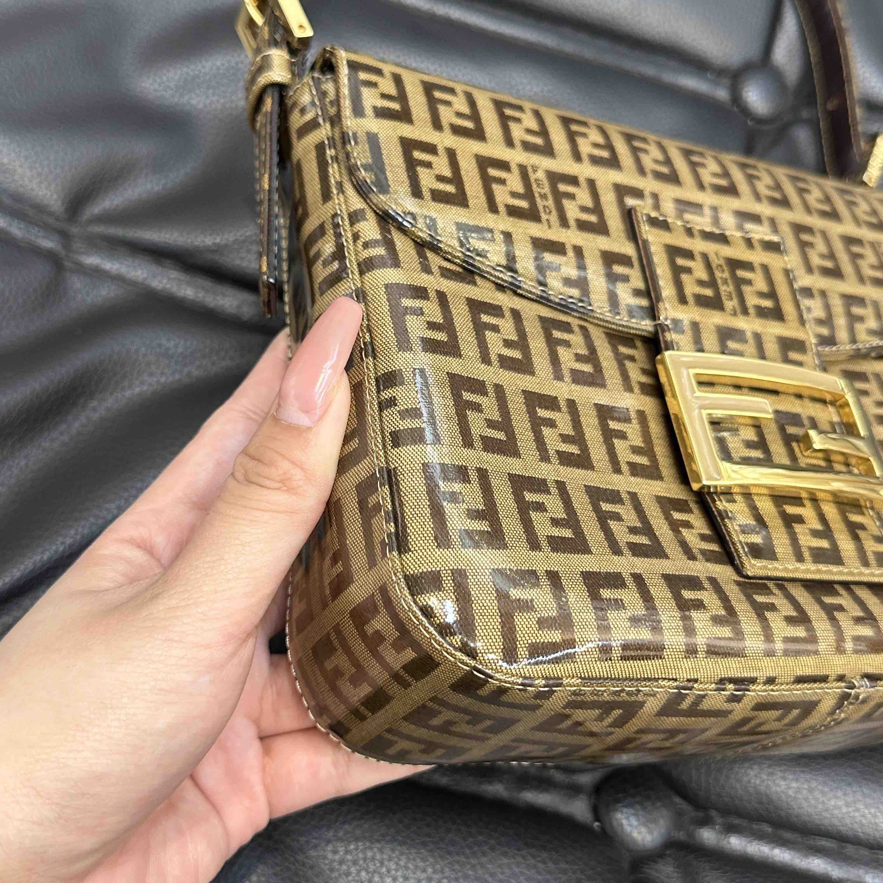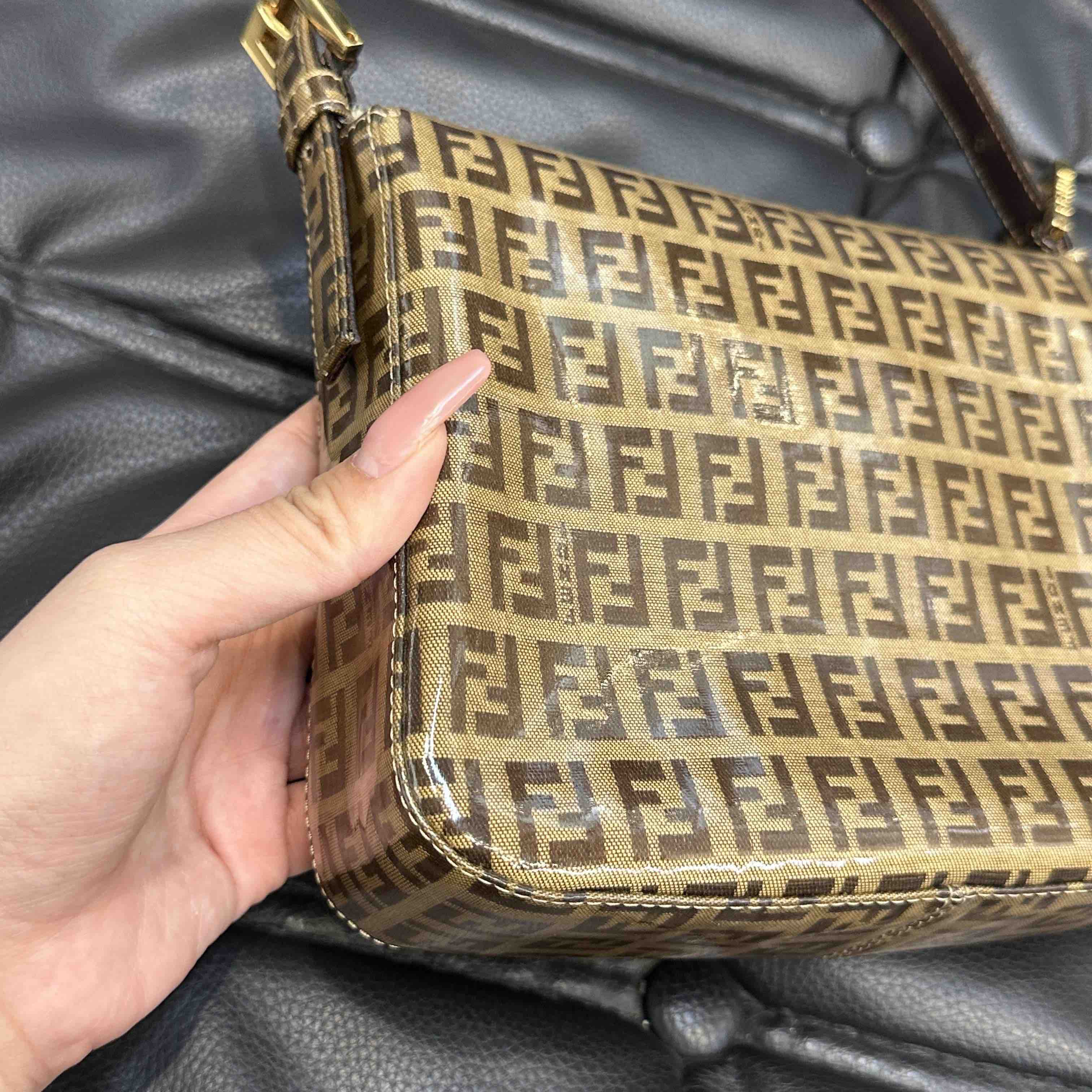 【商品详情】💰4500!正品二手 Fendi 中古 水晶皮 老花 珐琅金扣 小号 腋下包🟤95新 20x15 配件:肩带。吸扣五金轻微氧化 肩带正常使用感 内里干净 包身立体 复古特别款