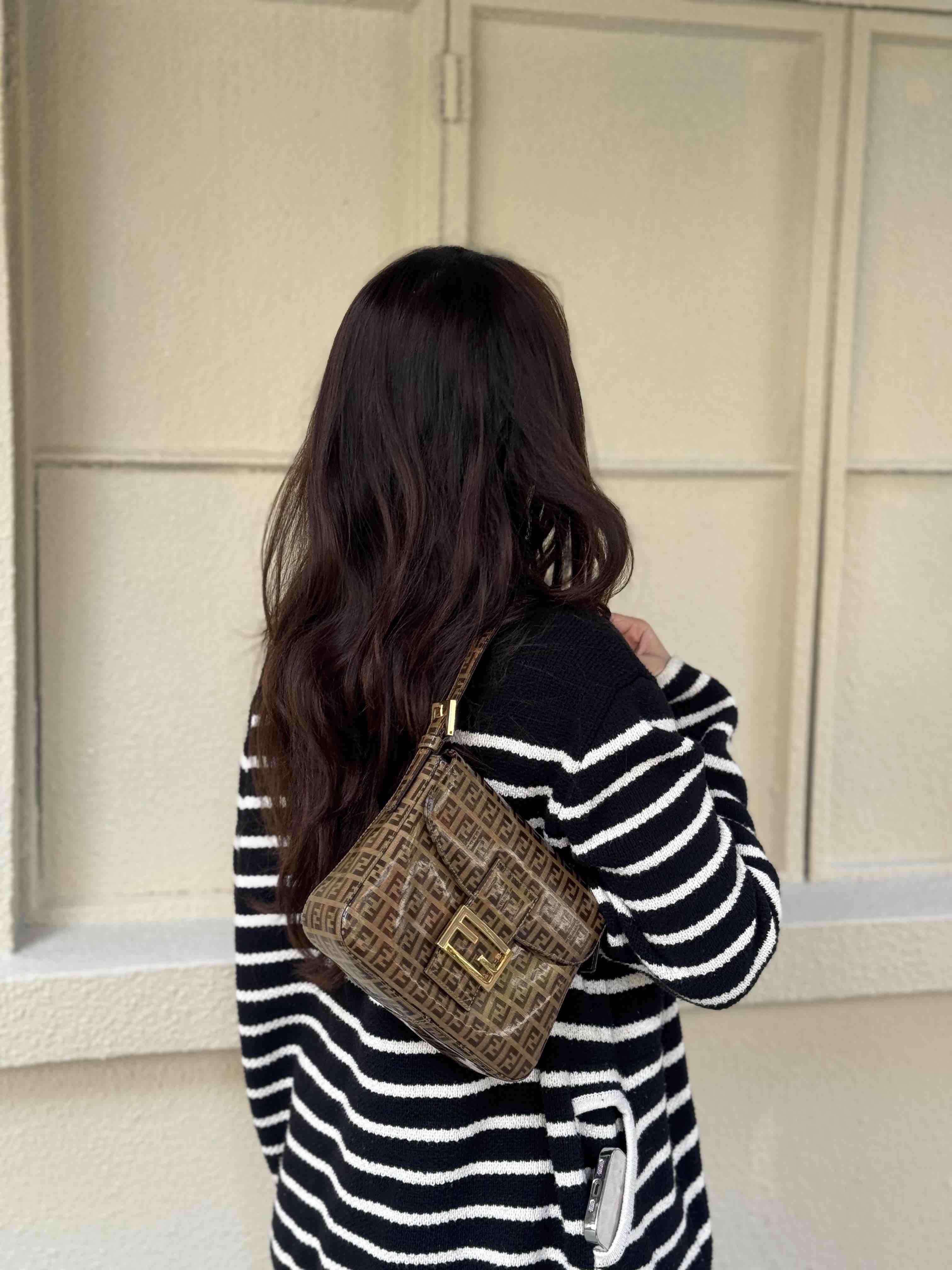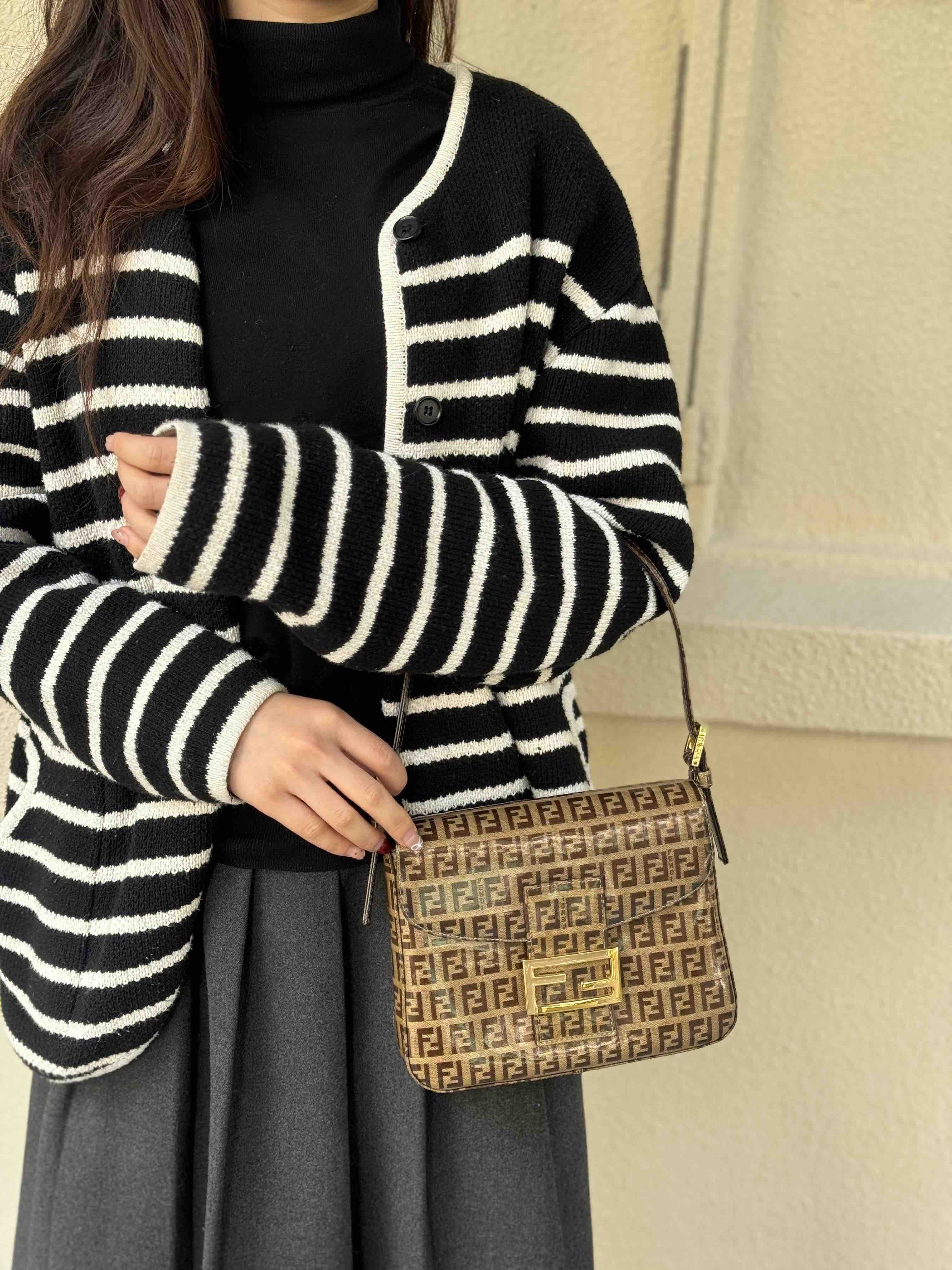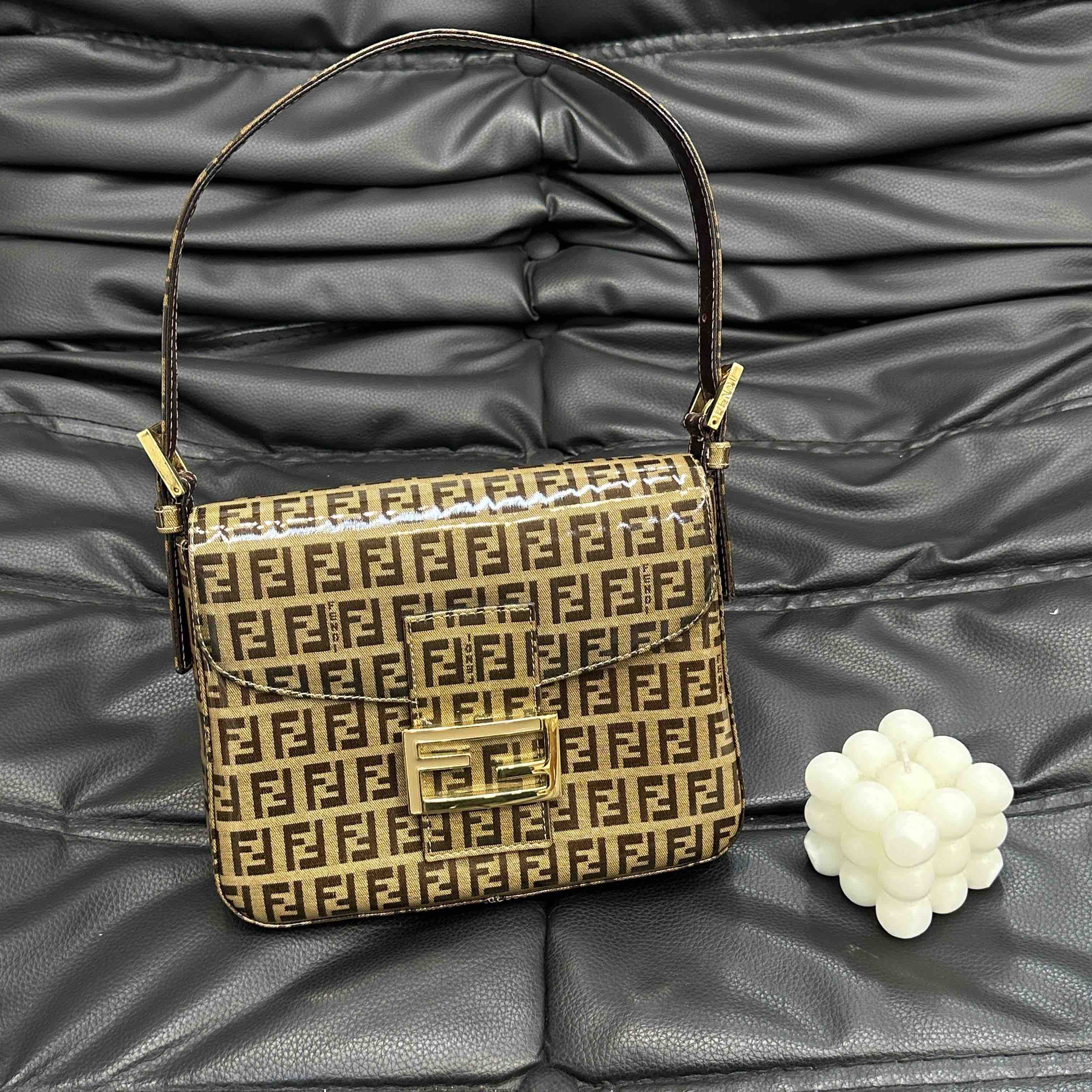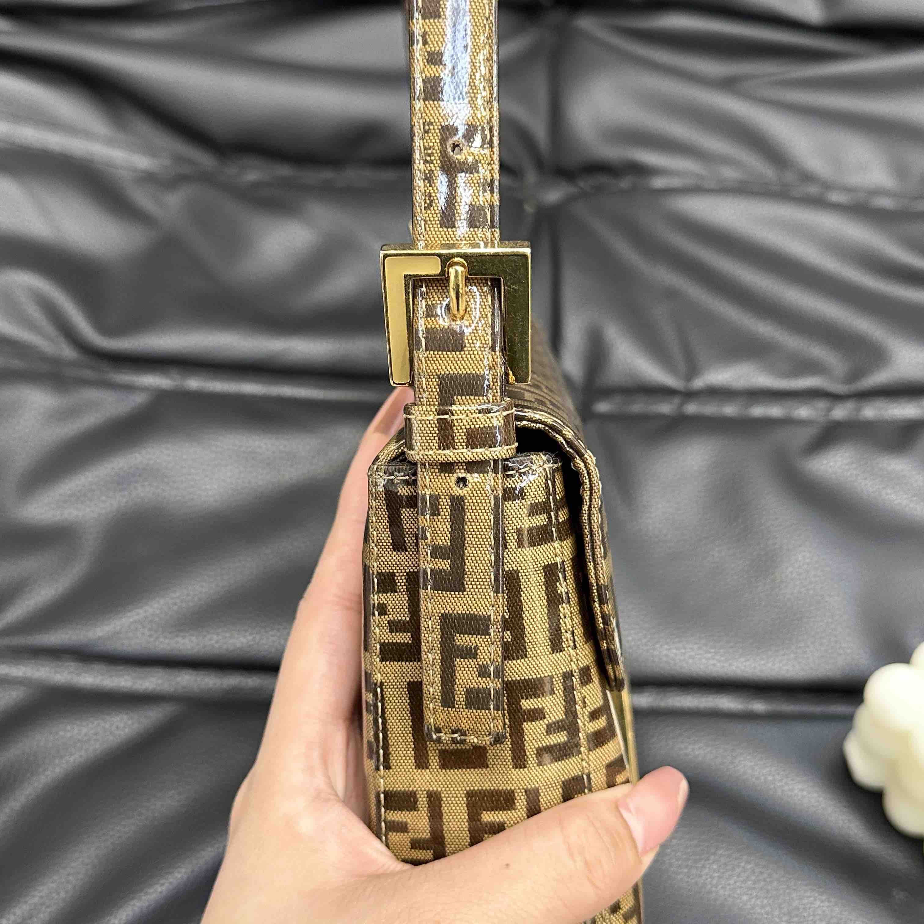 【商品详情】💰4500!正品二手 Fendi 中古 水晶皮 老花 珐琅金扣 小号 腋下包🟤95新 20x15 配件:肩带。吸扣五金轻微氧化 肩带正常使用感 内里干净 包身立体 复古特别款