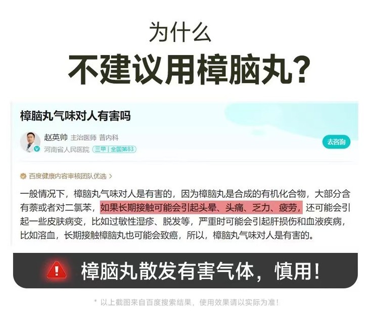 因为合成的樟脑丸里,一般都有【二氯苯】这个化学物质。 它是杀虫剂和除草剂的中间体,属于可能致癌物的一种。 长期使用可能导致人体皮肤过敏甚至贫血,对身体有很大危害!