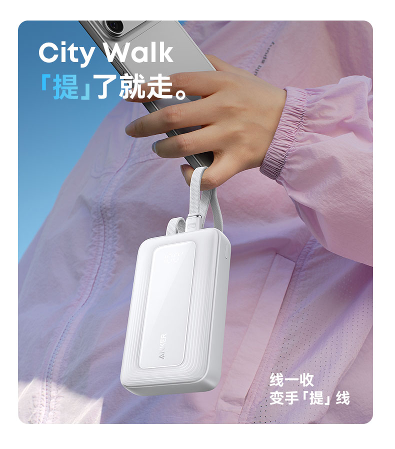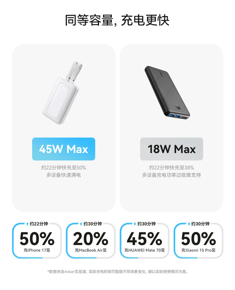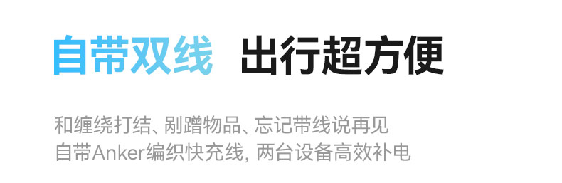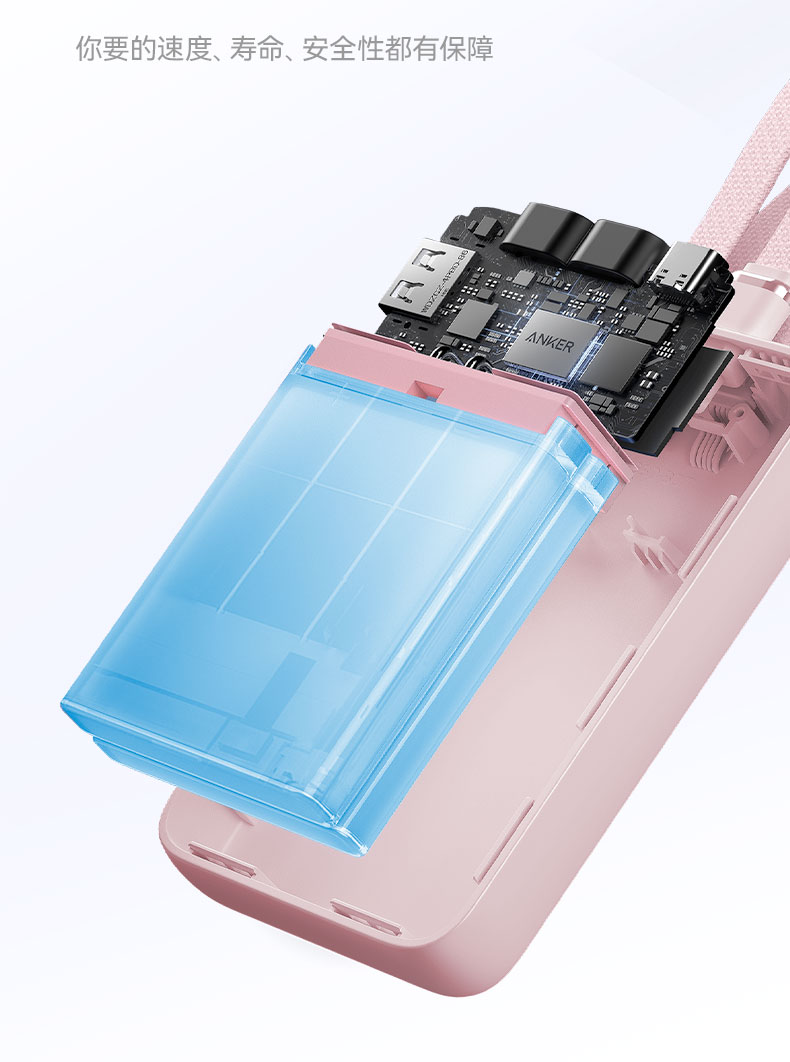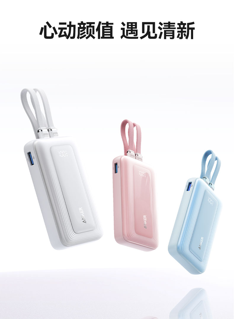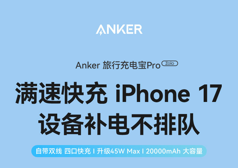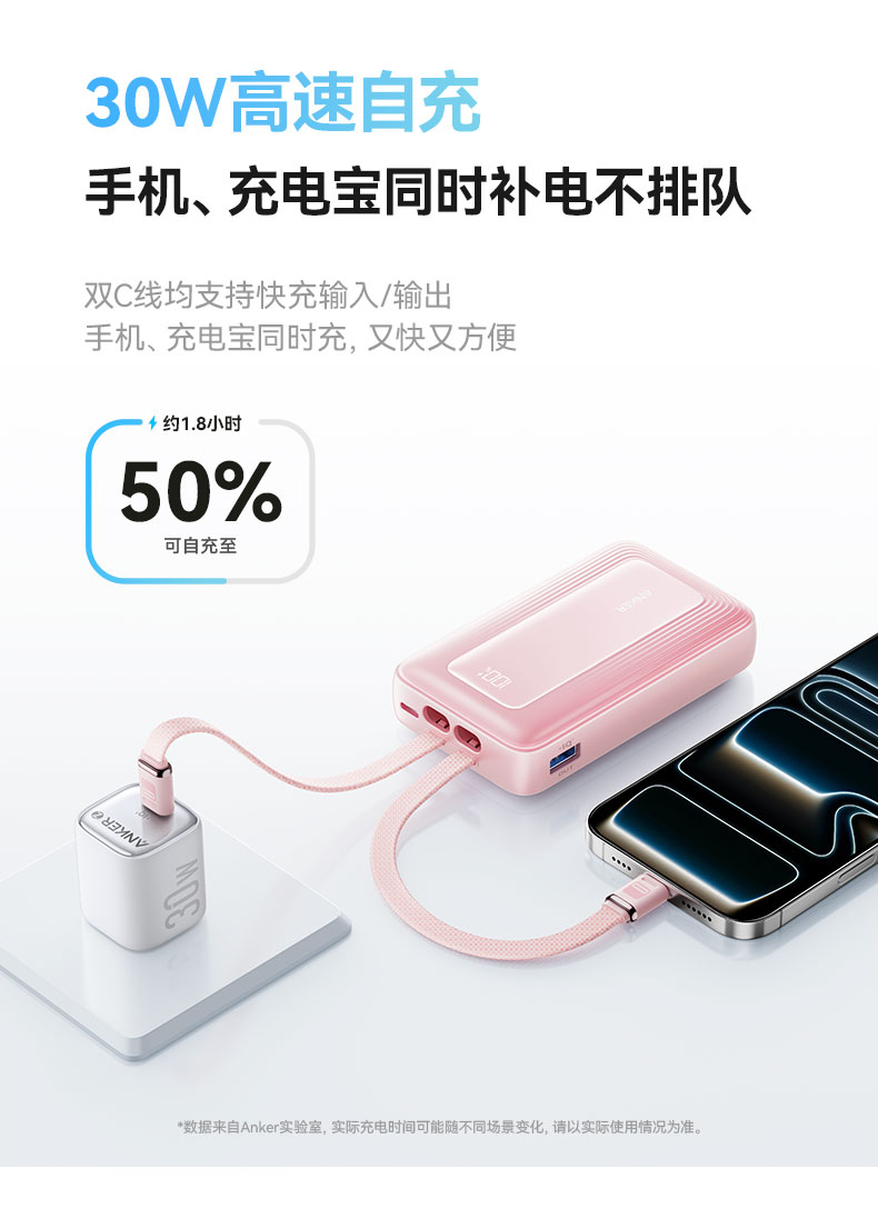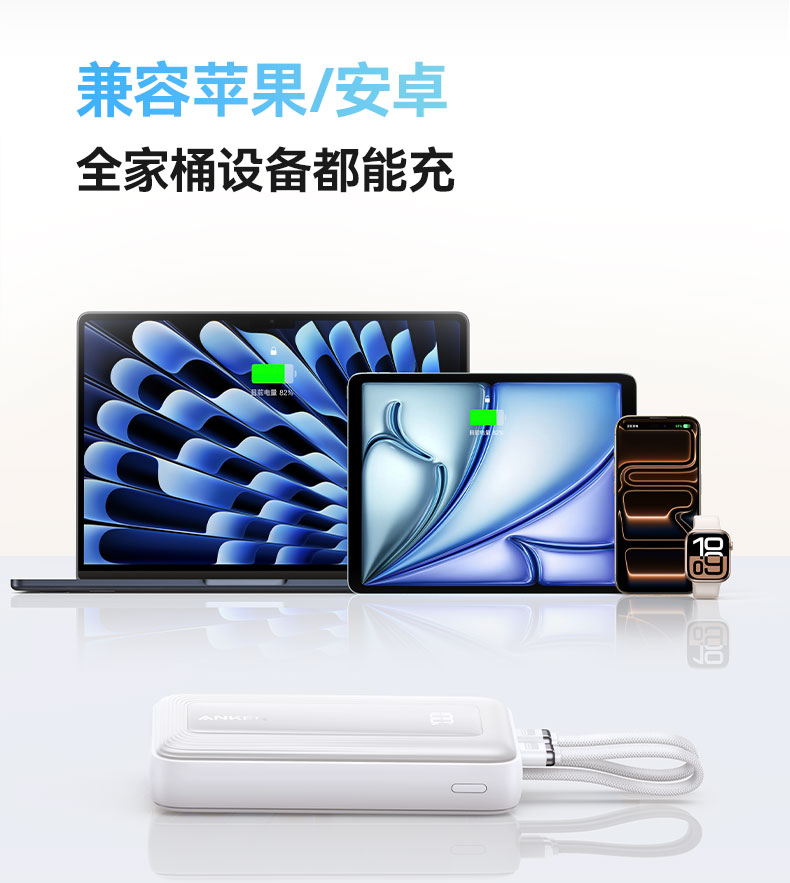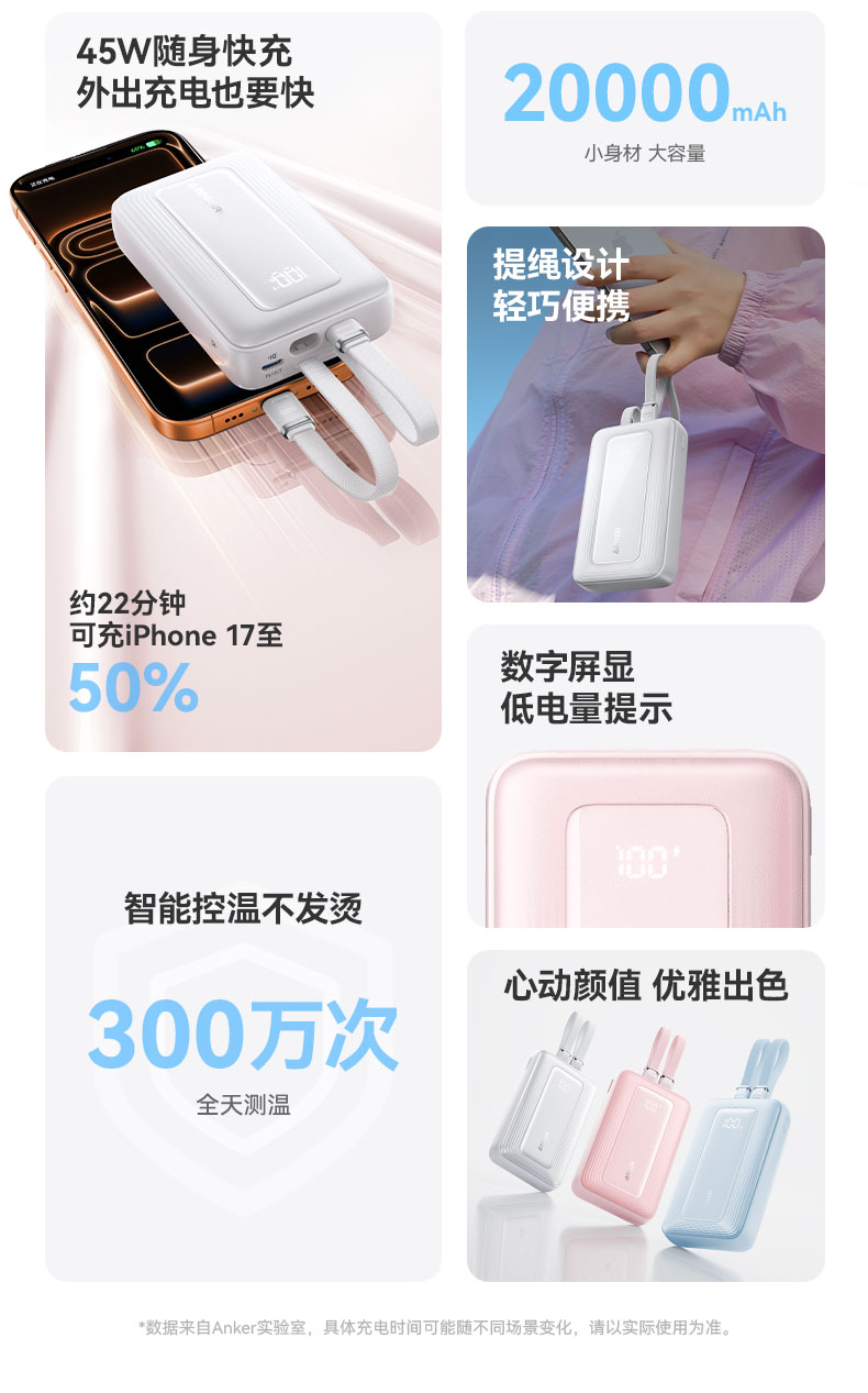 【新品】Anker安克 自带双C线20000mAh移动电源 45W快充可上飞机适配苹果17/小米/华为手机 A110M