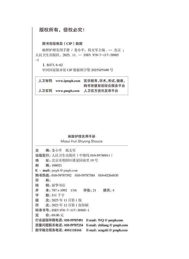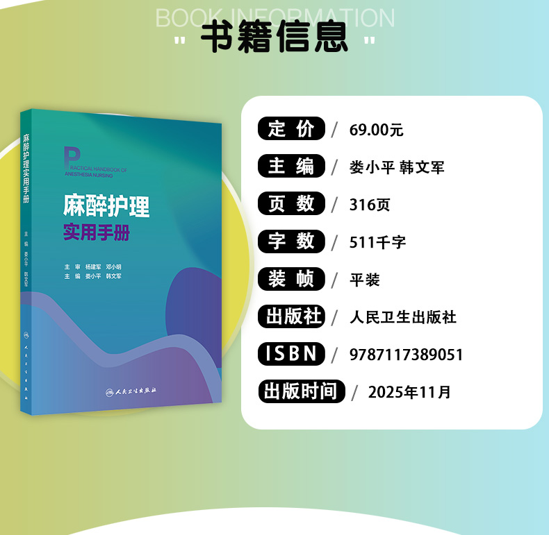 麻醉护理实用手册 娄小平 韩文军 读者对象为麻醉科护士 麻醉护理专业学生及麻醉护理相关从业人员 9787117389051 人民卫生出版社