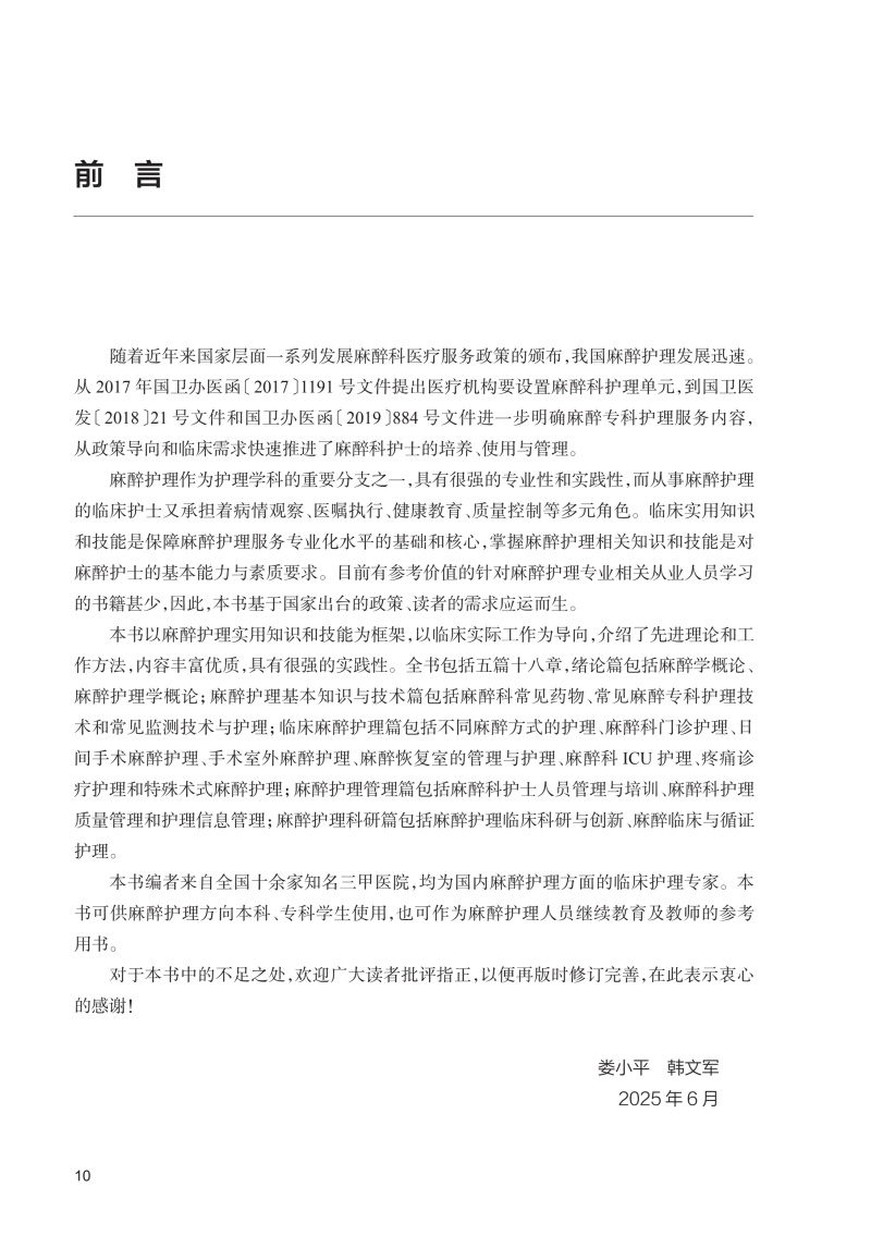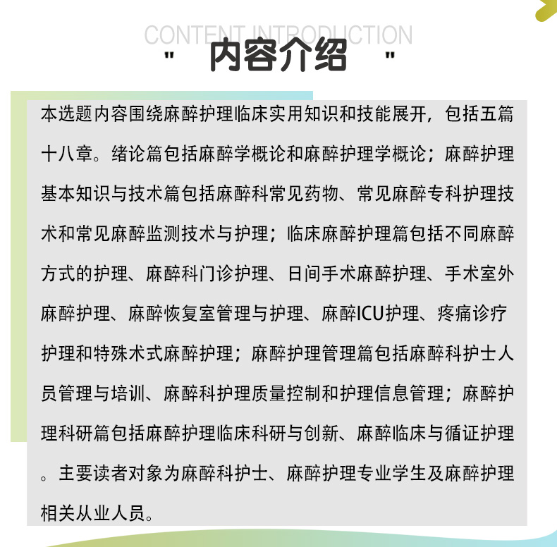 本选题内容围绕麻醉护理临床实用知识和技能展开,包括五篇十八章。绪论篇包括麻醉学概论和麻醉护理学概论;麻醉护理基本知识与技术篇包括麻醉科常见药物、常见麻醉专科护理技术和常见麻醉监测技术与护理;临床麻醉护理篇包括不同麻醉方式的护理、麻醉科门诊护理、日间手术麻醉护理、手术室外麻醉护理、麻醉恢复室管理与护理、麻醉ICU护理、疼痛诊疗护理和特殊术式麻醉护理;麻醉护理管理篇包括麻醉科护士人员管理与培训、麻醉科护理质量控制和护理信息管理;麻醉护理科研篇包括麻醉护理临床科研与创新、麻醉临床与循证护理。主要读者对象为麻醉科护士、麻醉护理专业学生及麻醉护理相关从业人员。