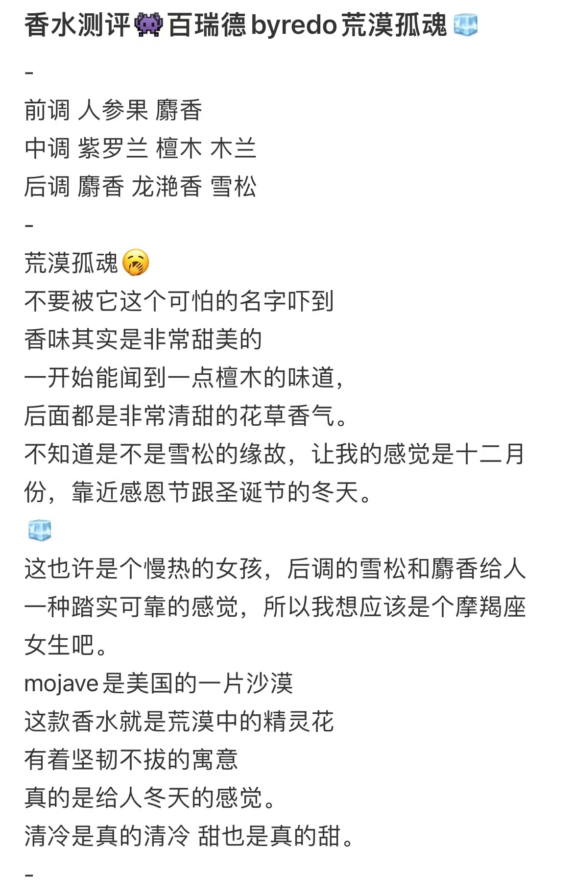 充斥着孤独和荒凉感的名字,但喷到身上确是甜而不腻,可爱里又带着丝丝妩媚,冷清中带着一丝温暖。