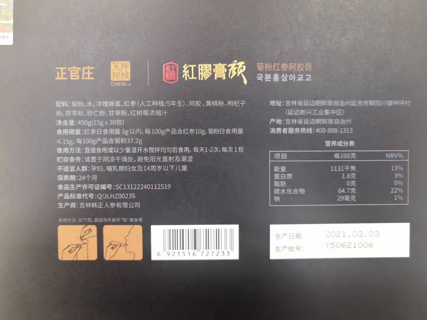 正官庄 即食红参阿胶膏固元膏450g礼盒(15gx30包)