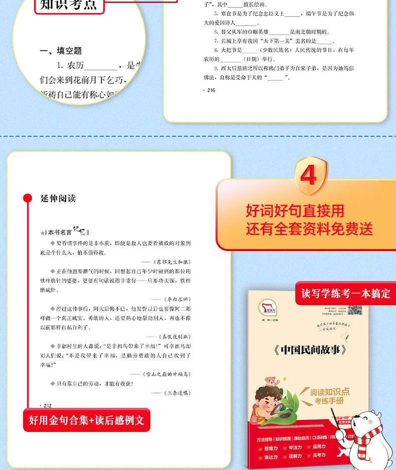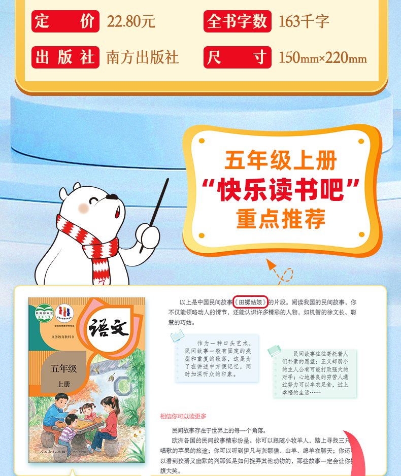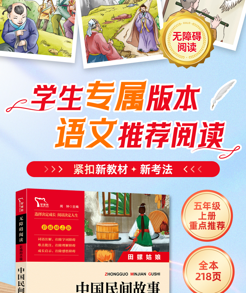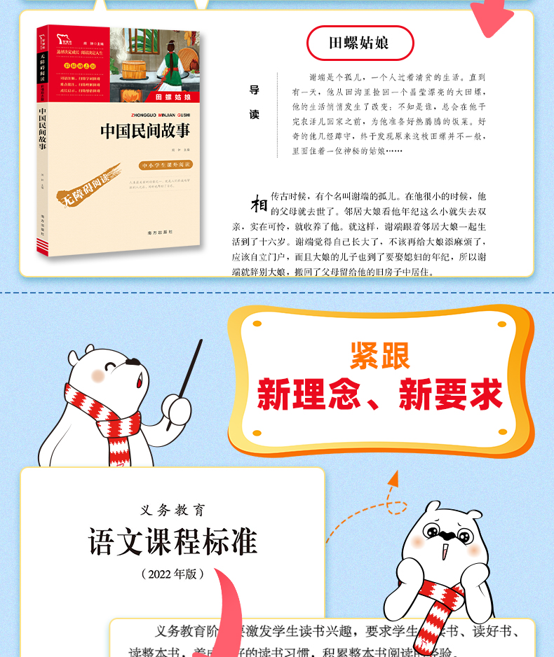 民间故事是从远古时代起就在人们中间口头流传的一种题材广泛而又充满幻想的叙事体故事,是广大的劳动人民运用口头语言创作的一种灵活的语言艺术。民间故事所反映的生活面是极其广阔的。无论是幻想性较强的神话传说,还是现实色彩浓厚的狩猎耕种故事,都从不同的层面和角度,反映了广大劳动人民的心声,蕴藏着英雄主义、爱国主义、乐观主义、人道主义等精神和美德。本书收录了多篇神话故事和各民族的民间故事,如《盘古开天辟地》《神农尝百草》《大禹治水》《白蛇传》《三根金头发》等,包含了神奇的幻想色彩、丰富的历史知识、深厚的民族情感,蕴含着英雄主义、乐观主义、人道主义等崇高的思想与美德。