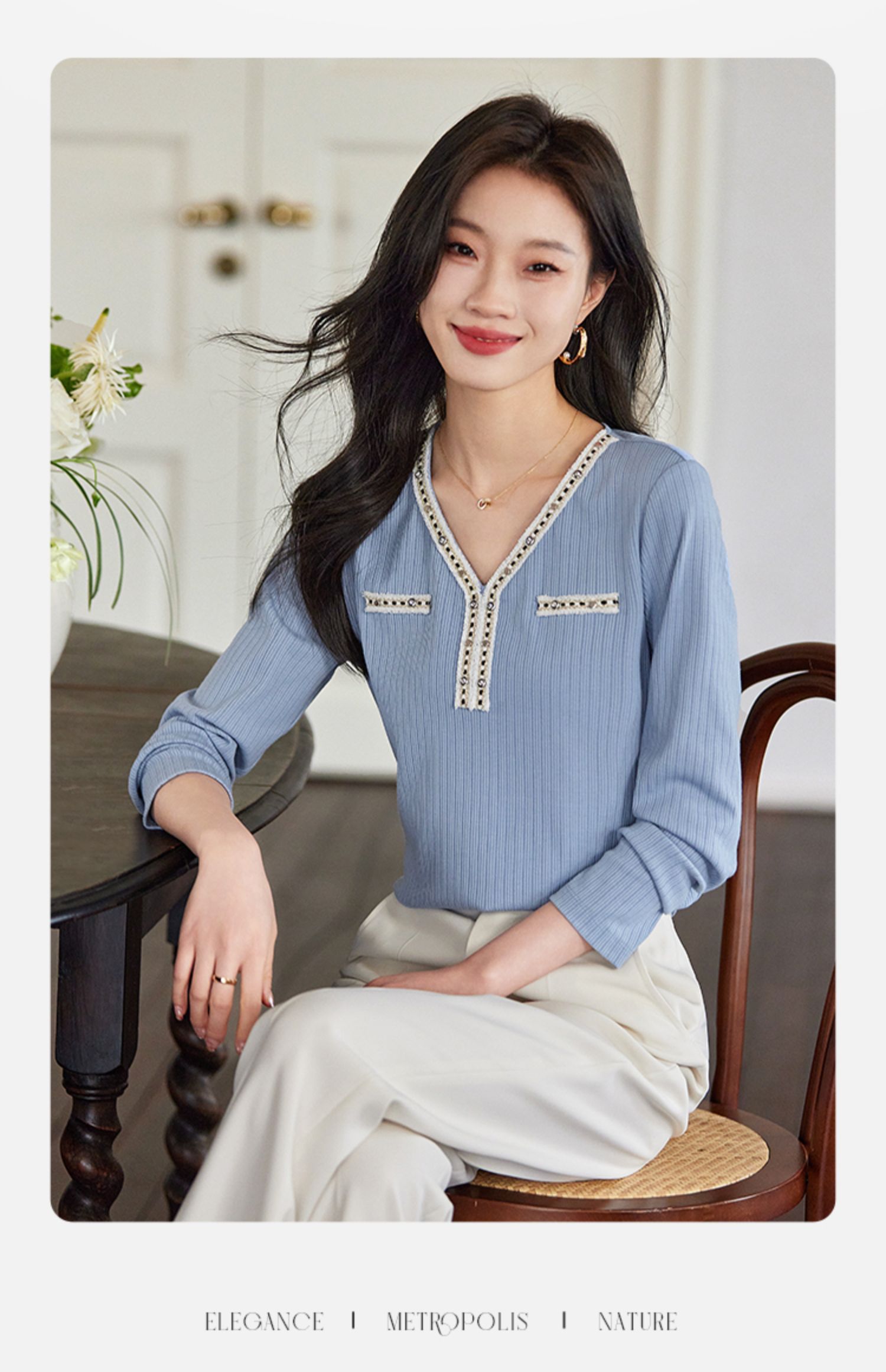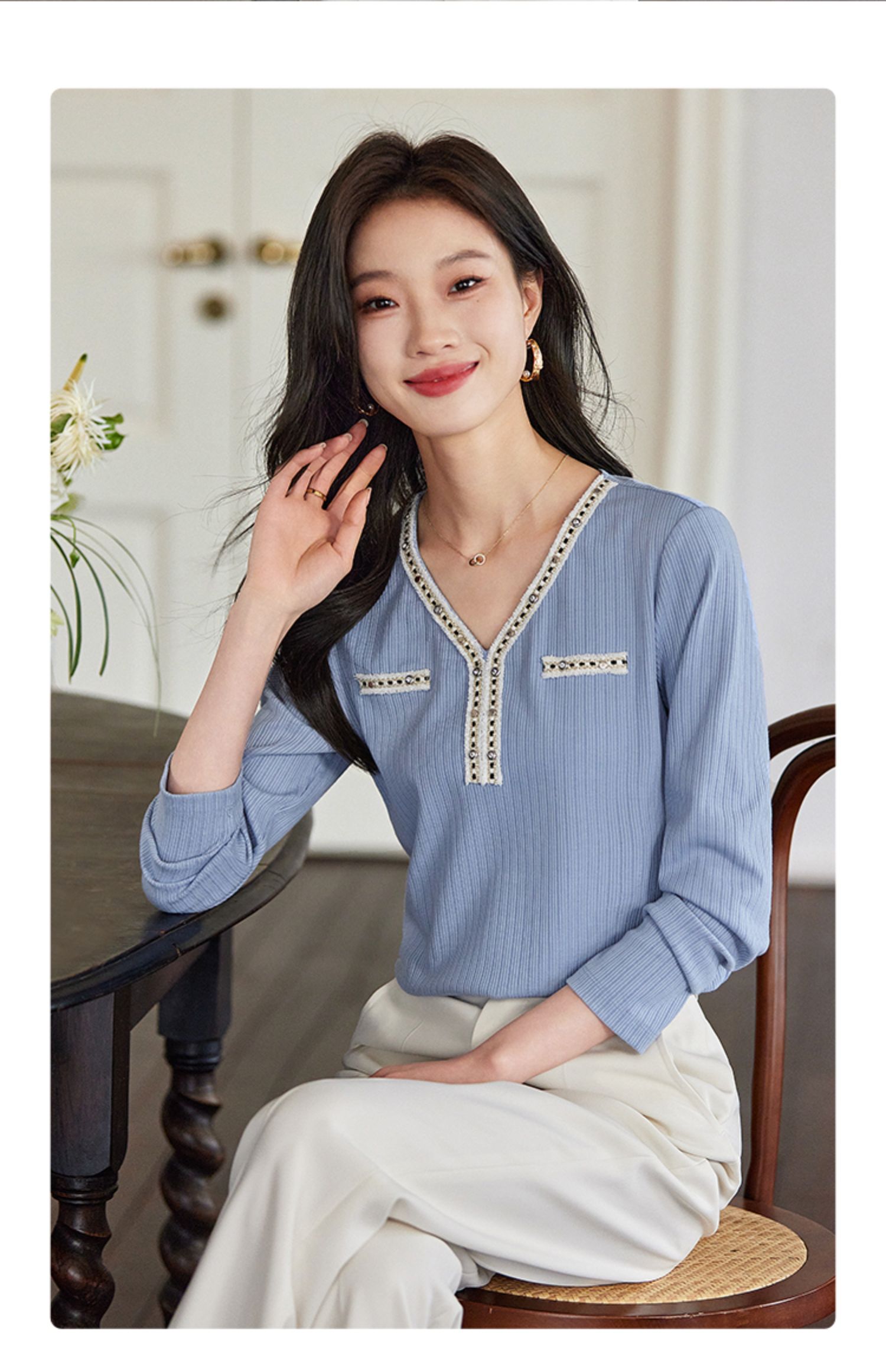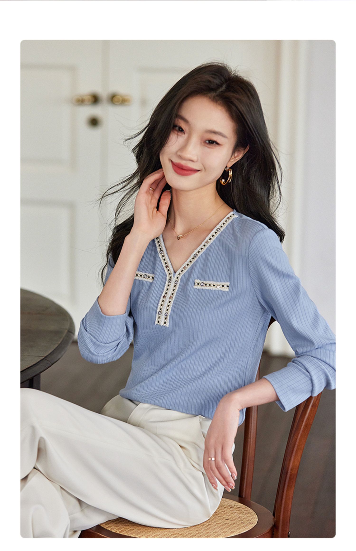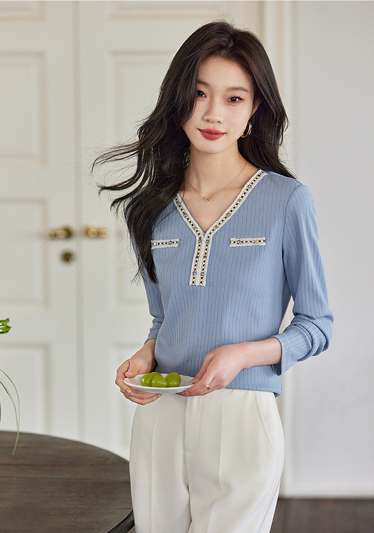 【年终特卖】熙世界2025秋新款小香风织带V领针织T恤女时尚洋气减龄长袖上衣