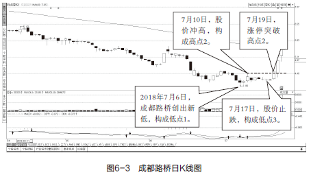 如图6-3所示,2018年7月6日,成都路桥(002628)经过一波长期的下跌之后创出新低,构成低点1。