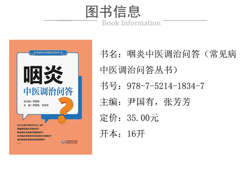 本书是一本中医调治咽炎的科普书,以作者诊治咽炎经验及患者咨询问题为基础,以咽炎的中医治疗调养知识为重点,采用患者针对自己的病情提问题,医生予以解答的形式,系统地介绍了咽炎的防治知识,认真细致地解答了广大咽炎患者可能遇到的各种问题。本书文字通俗易懂,内容科学实用,可作为咽炎患者家庭治疗和自我调养康复的常备用书。也可供临床医务人员和广大群众阅读参考。