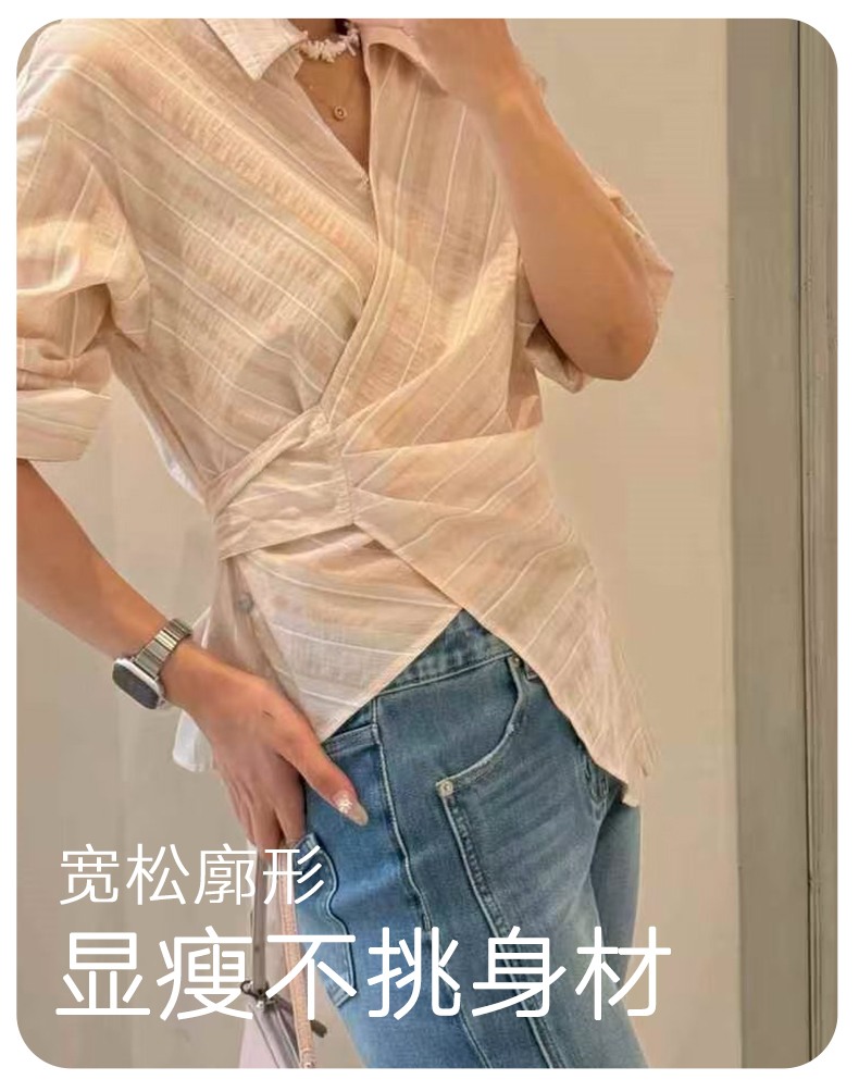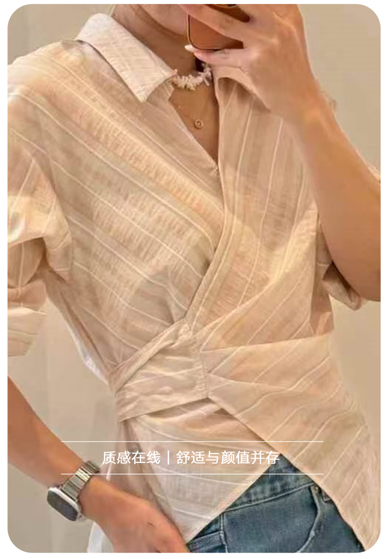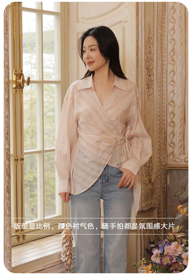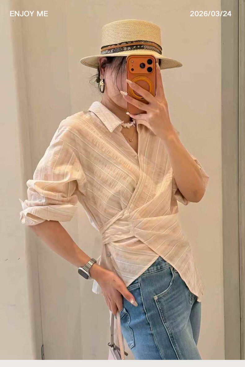 【门店同款】ENJOY夏季三文鱼色条纹绑带衬衫 170643818