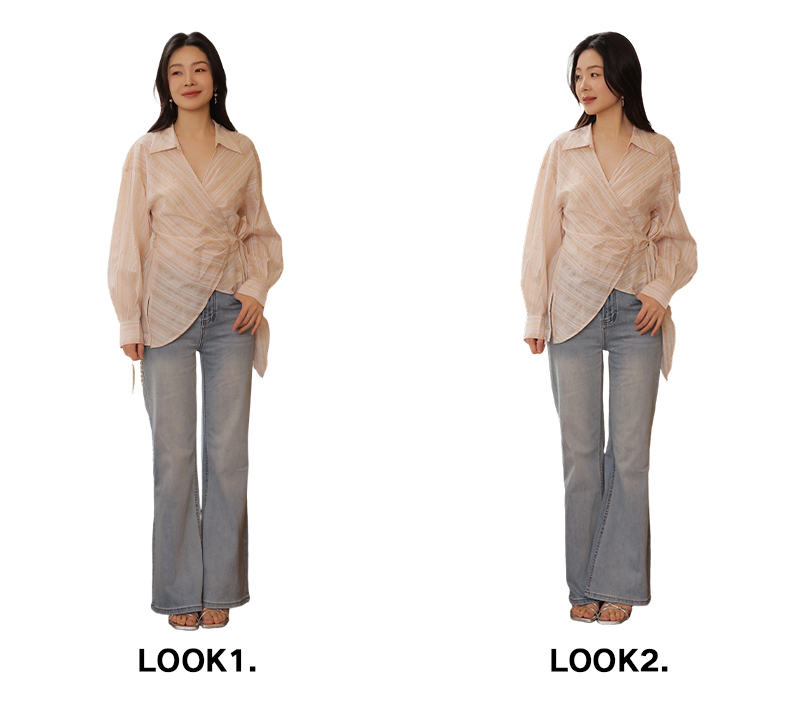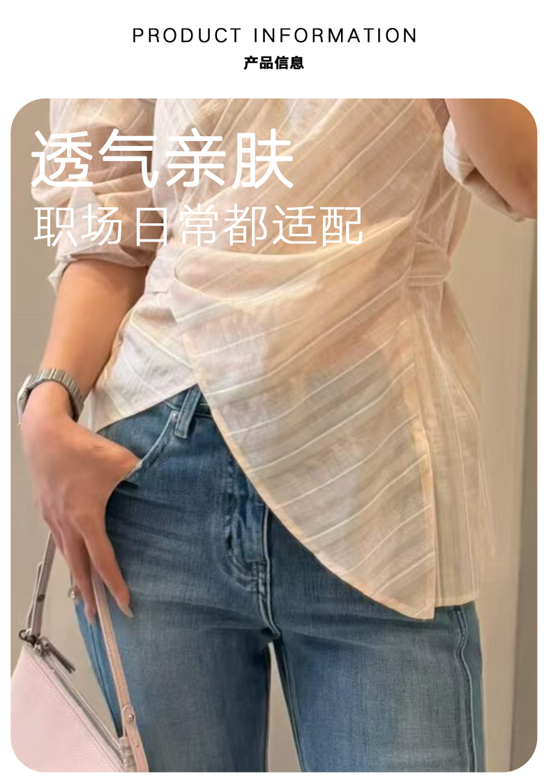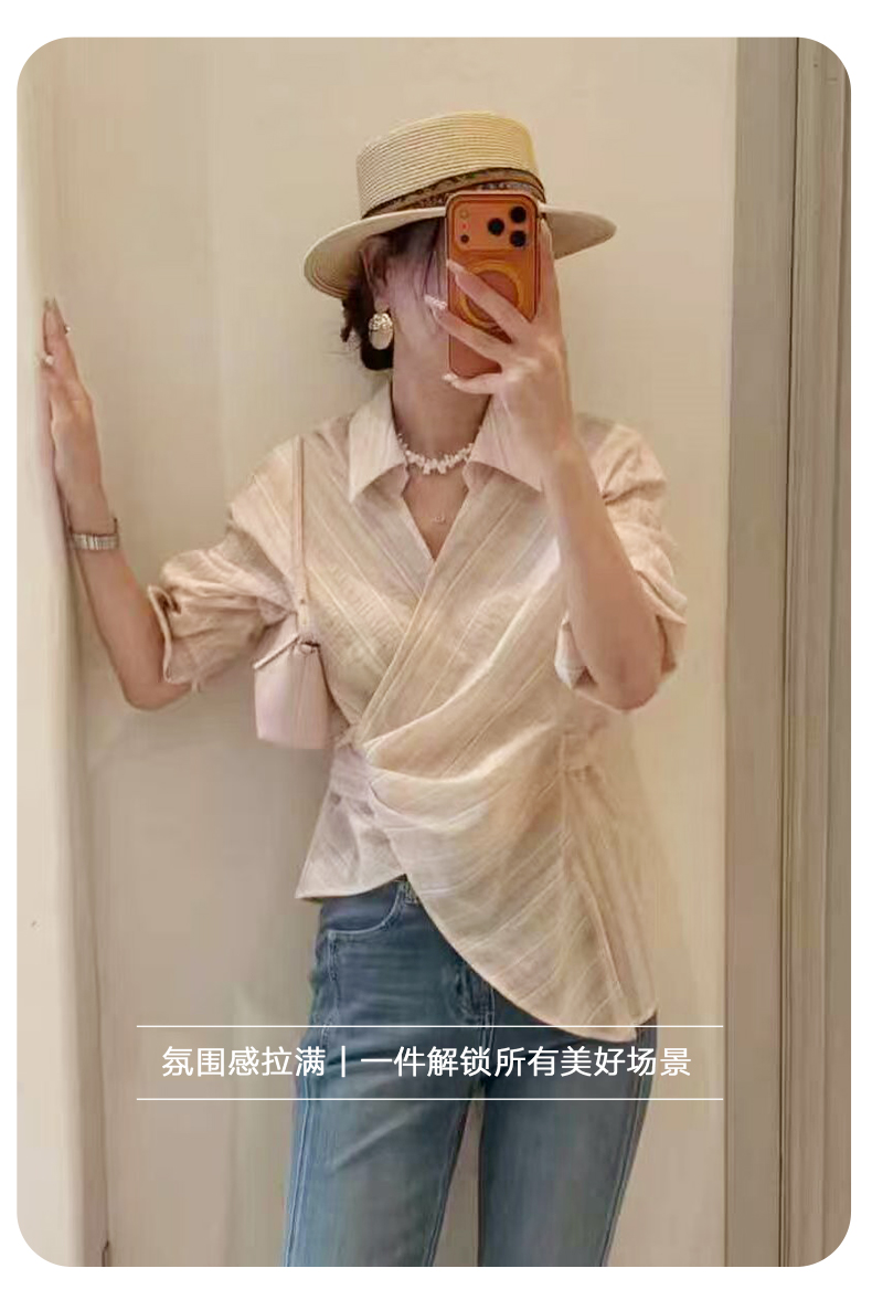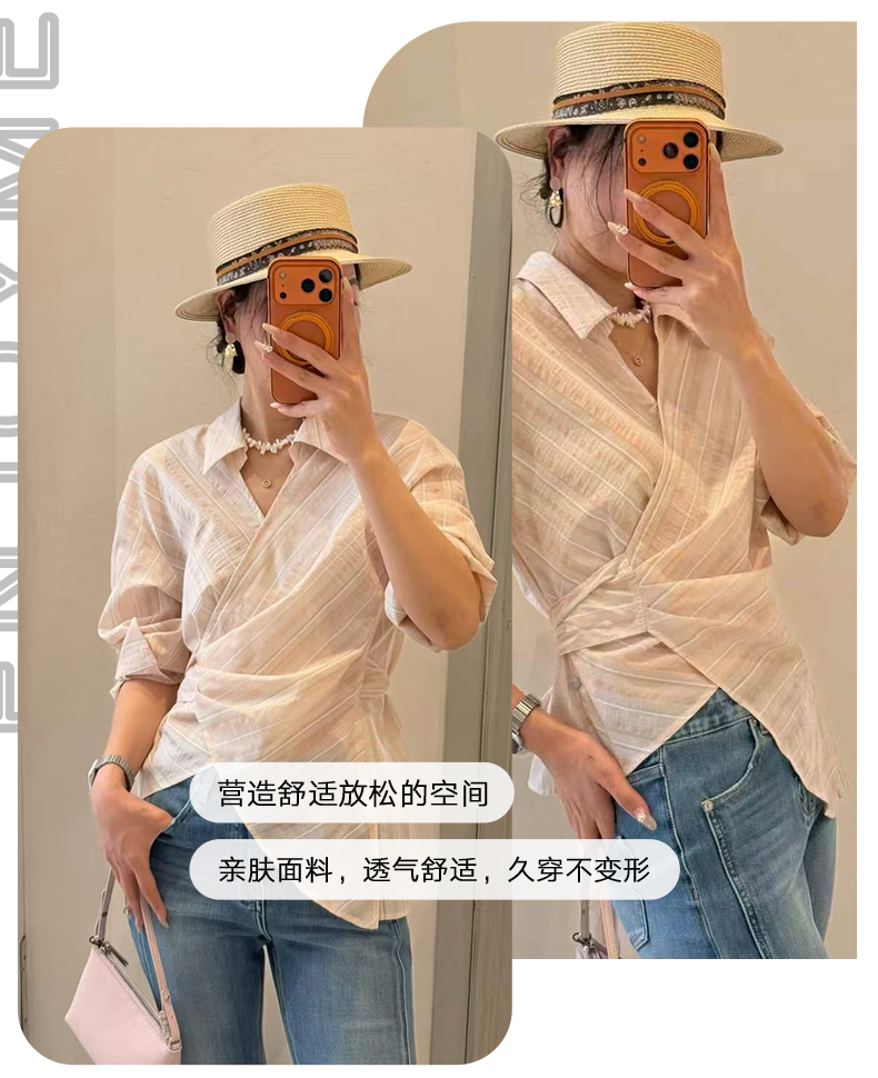 【门店同款】ENJOY夏季三文鱼色条纹绑带衬衫 170643818