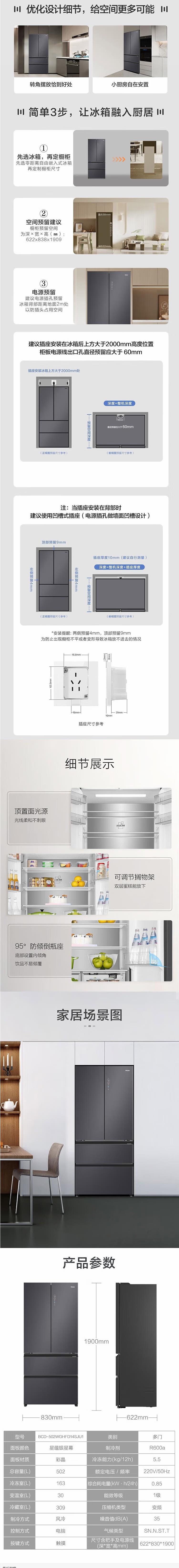 海尔(202865)502升 法式全空间保鲜科技 零距离自由嵌入 EPP超净 智能互联冰箱 BCD-502WGHFD14SJU1