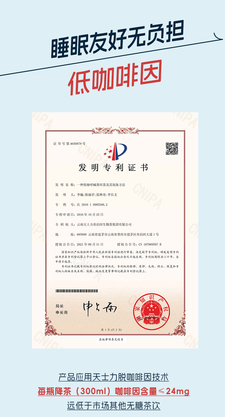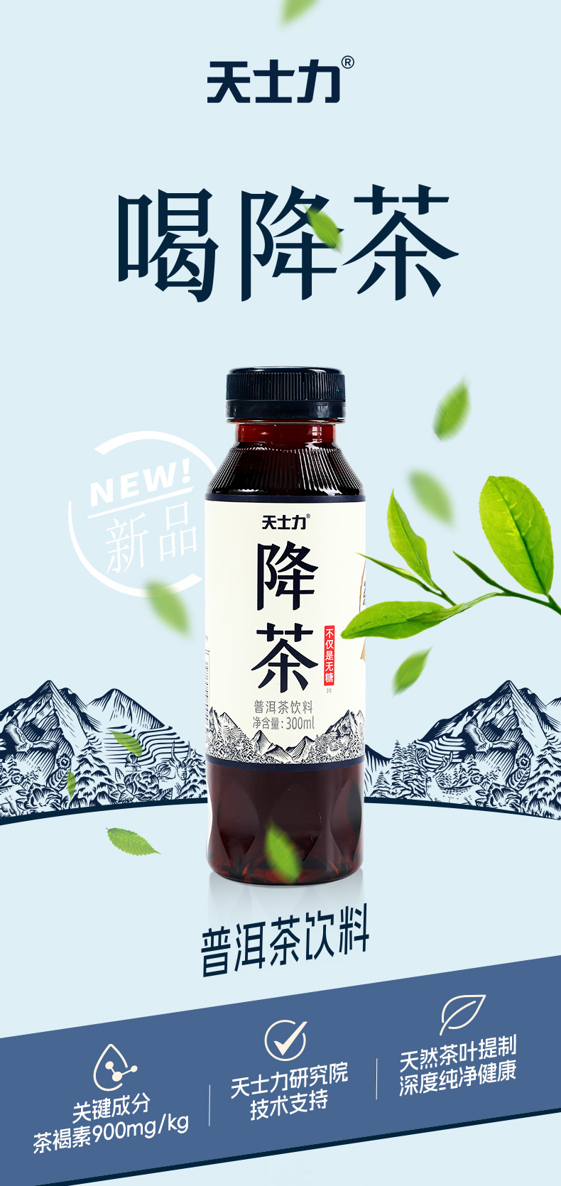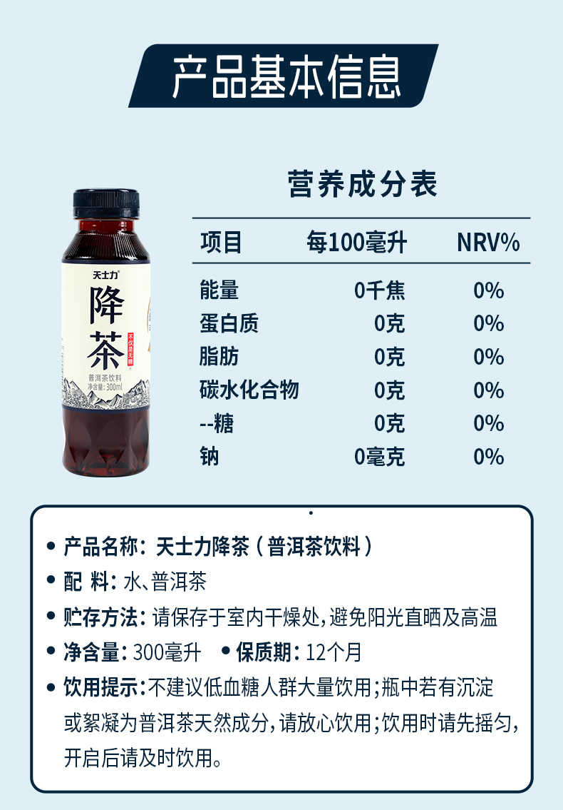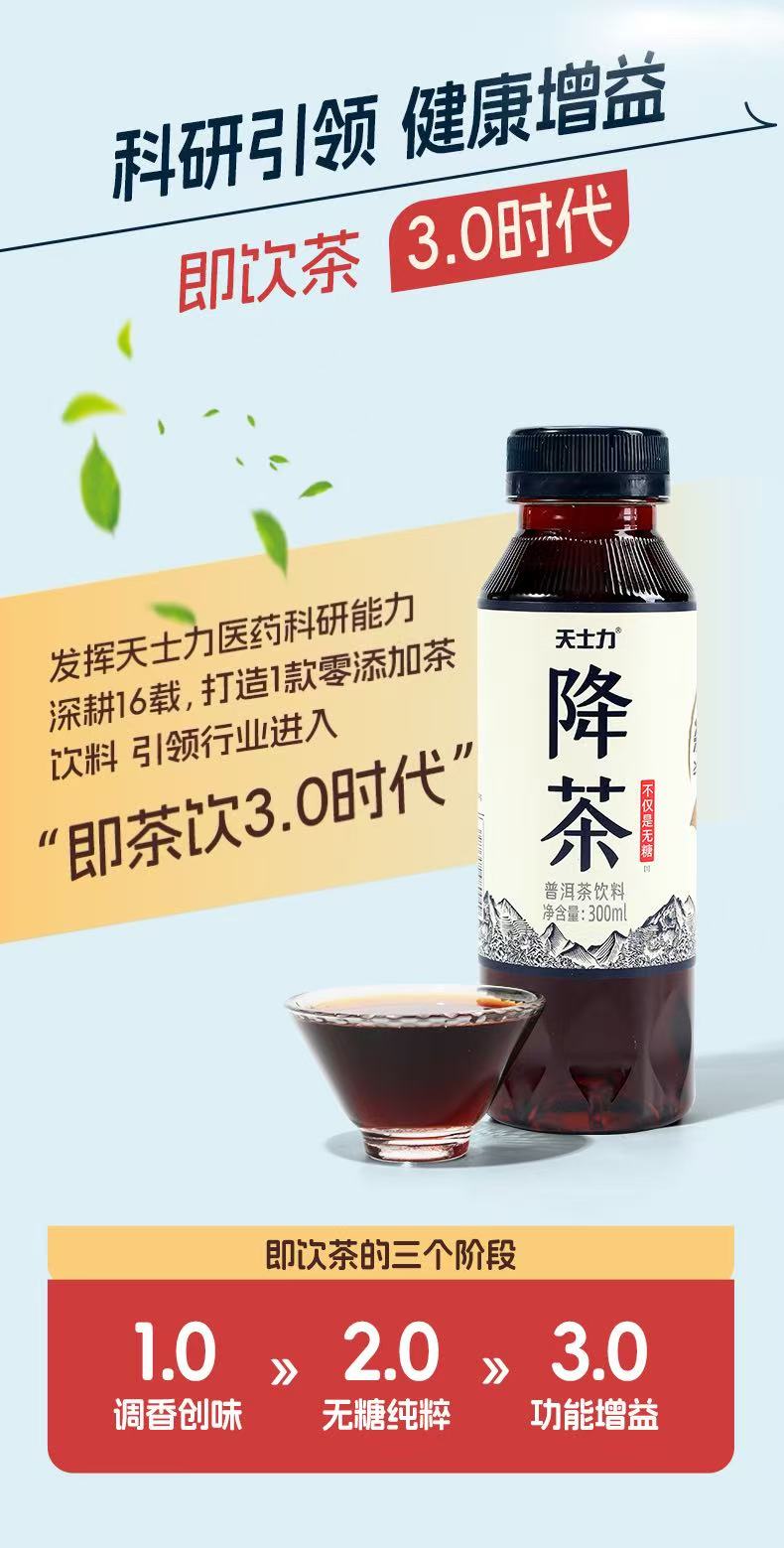 天士力降茶普洱无糖纯茶饮料0糖0卡0脂高倍茶褐素饮品300ml*24瓶