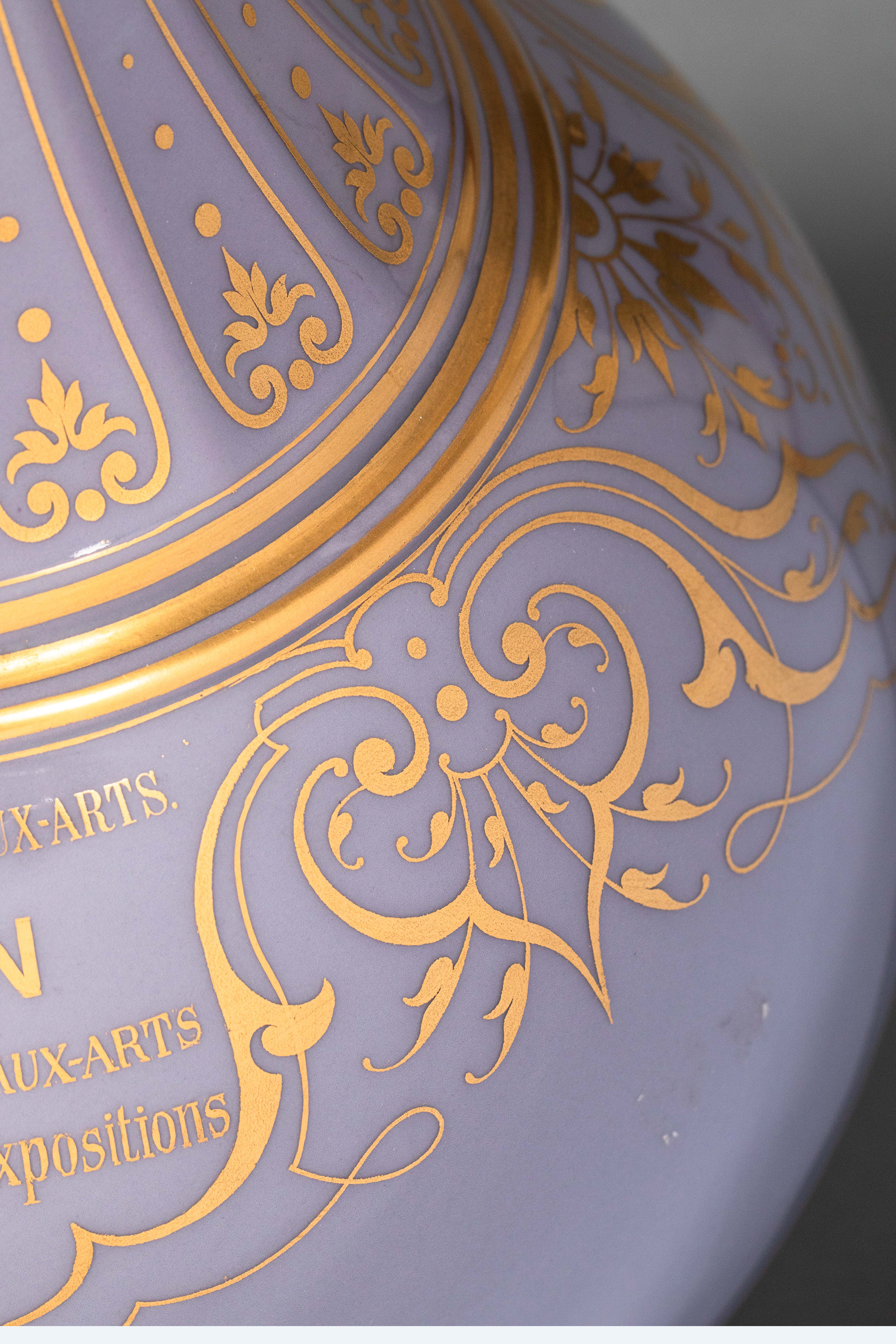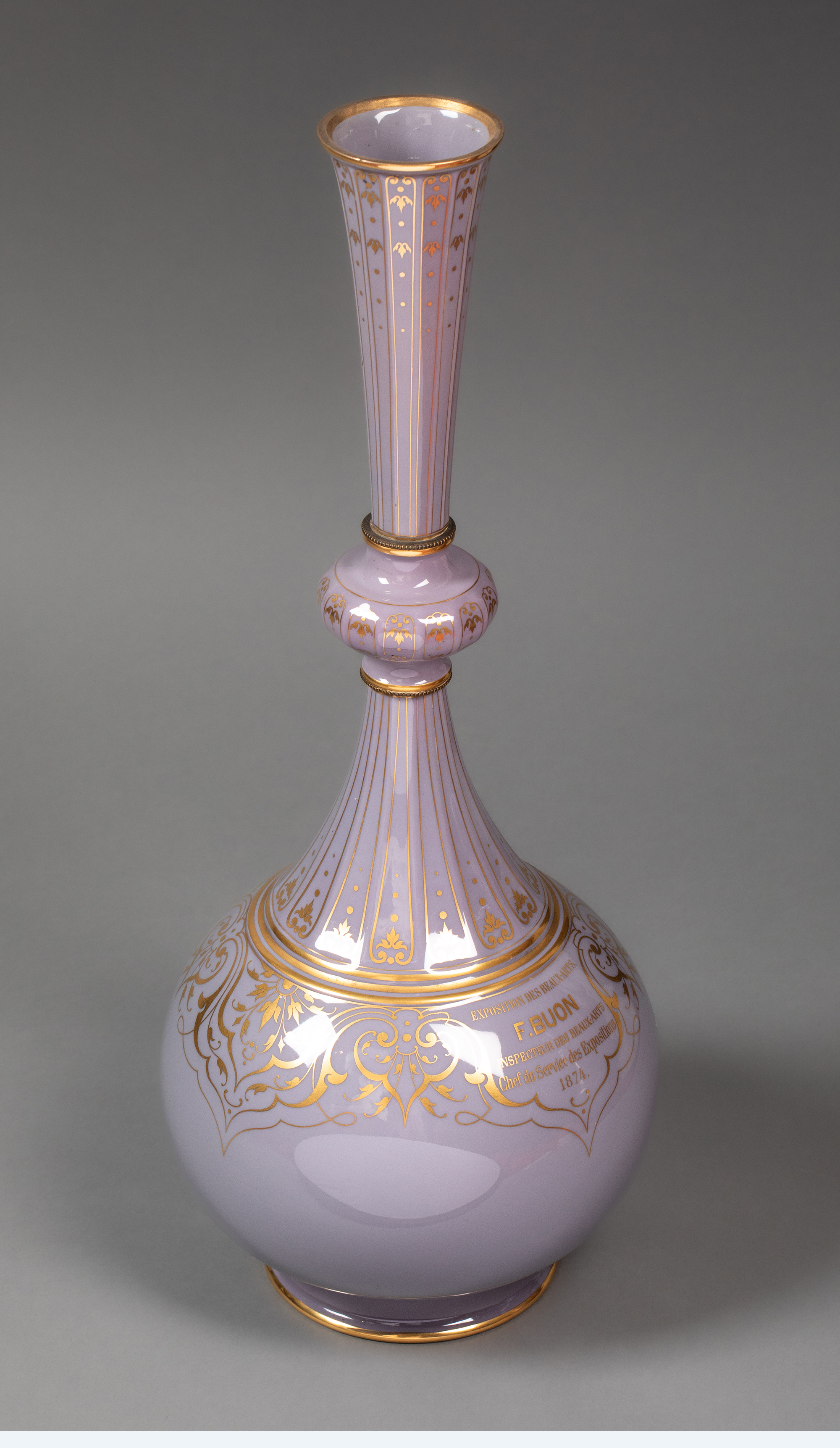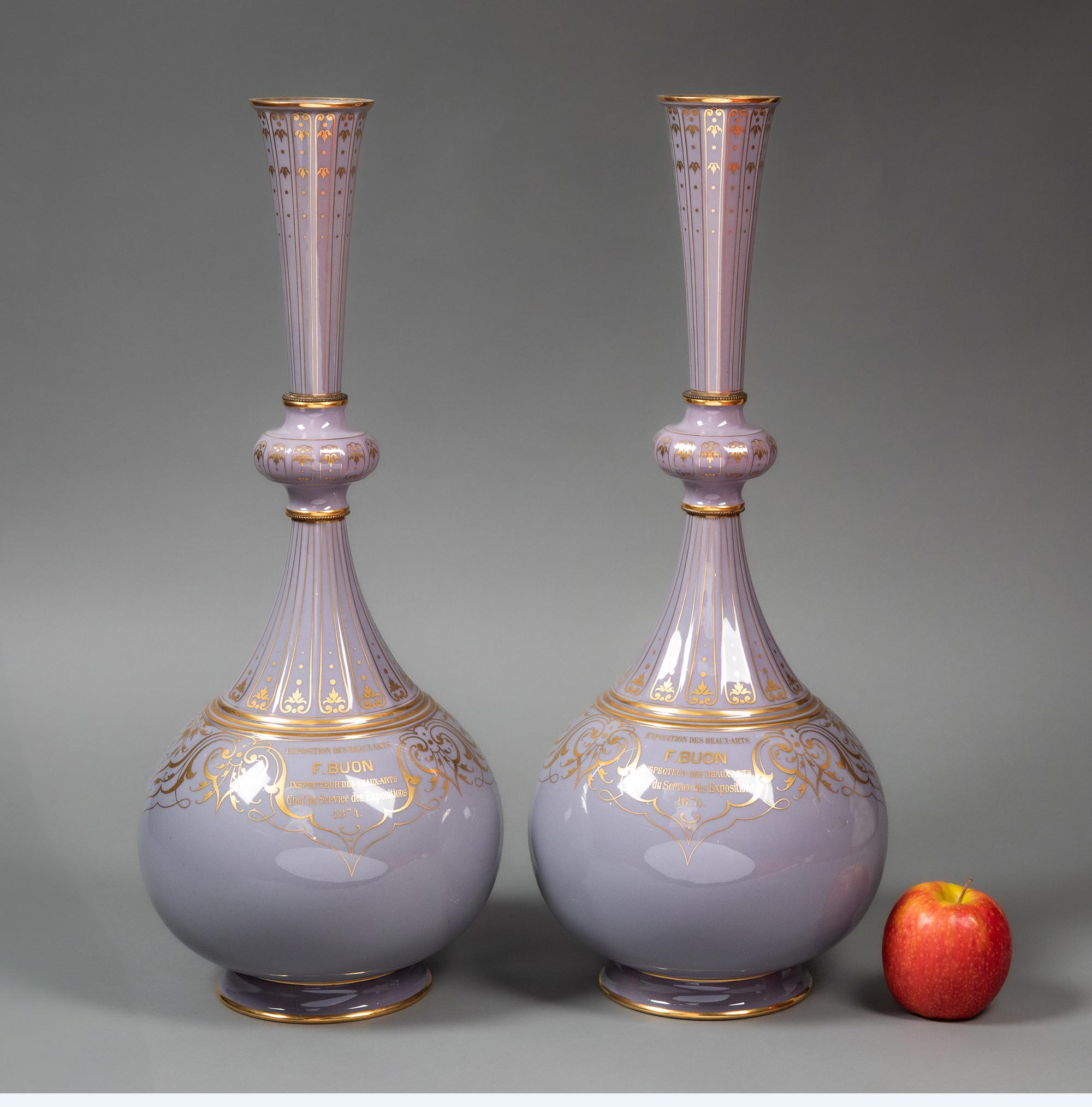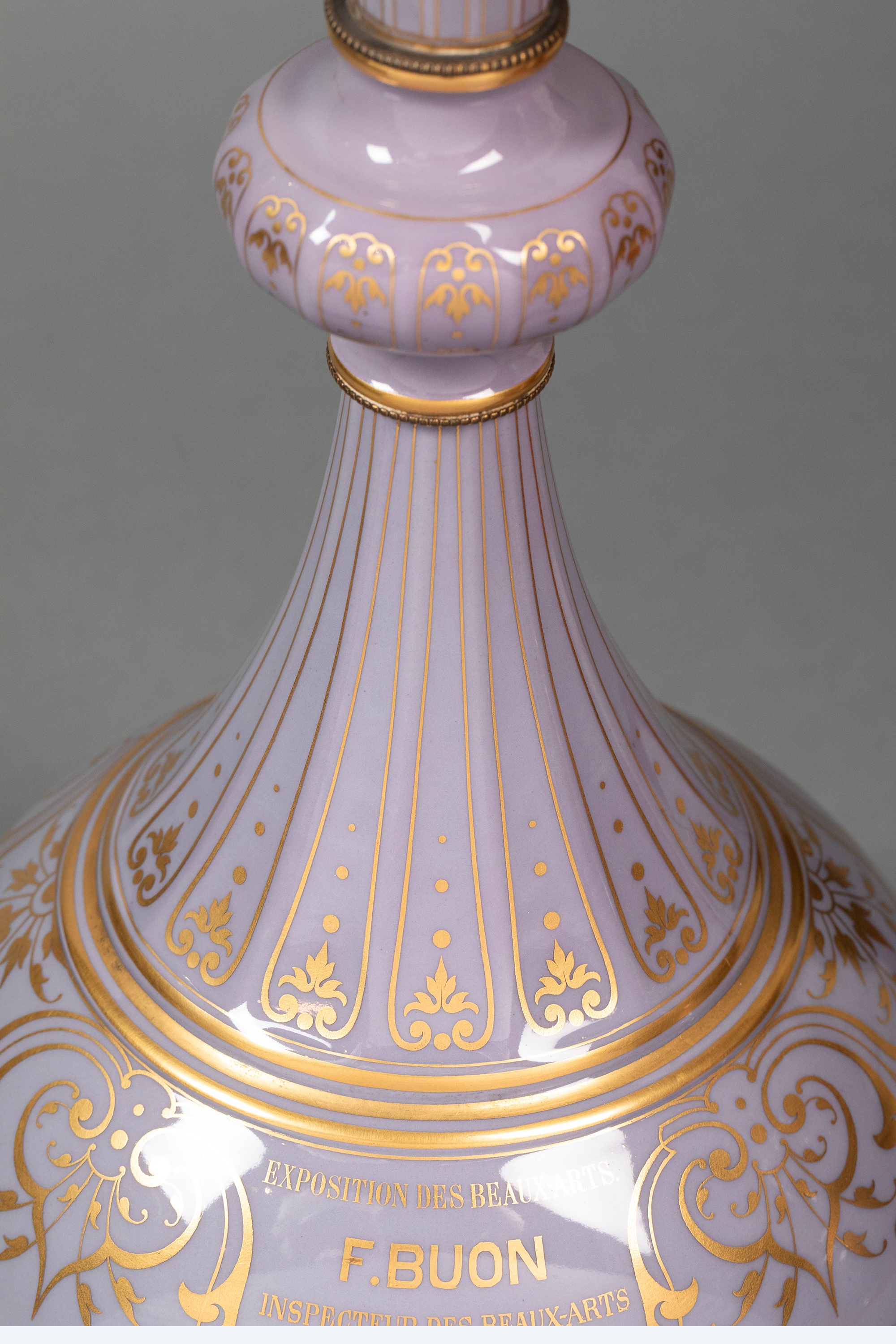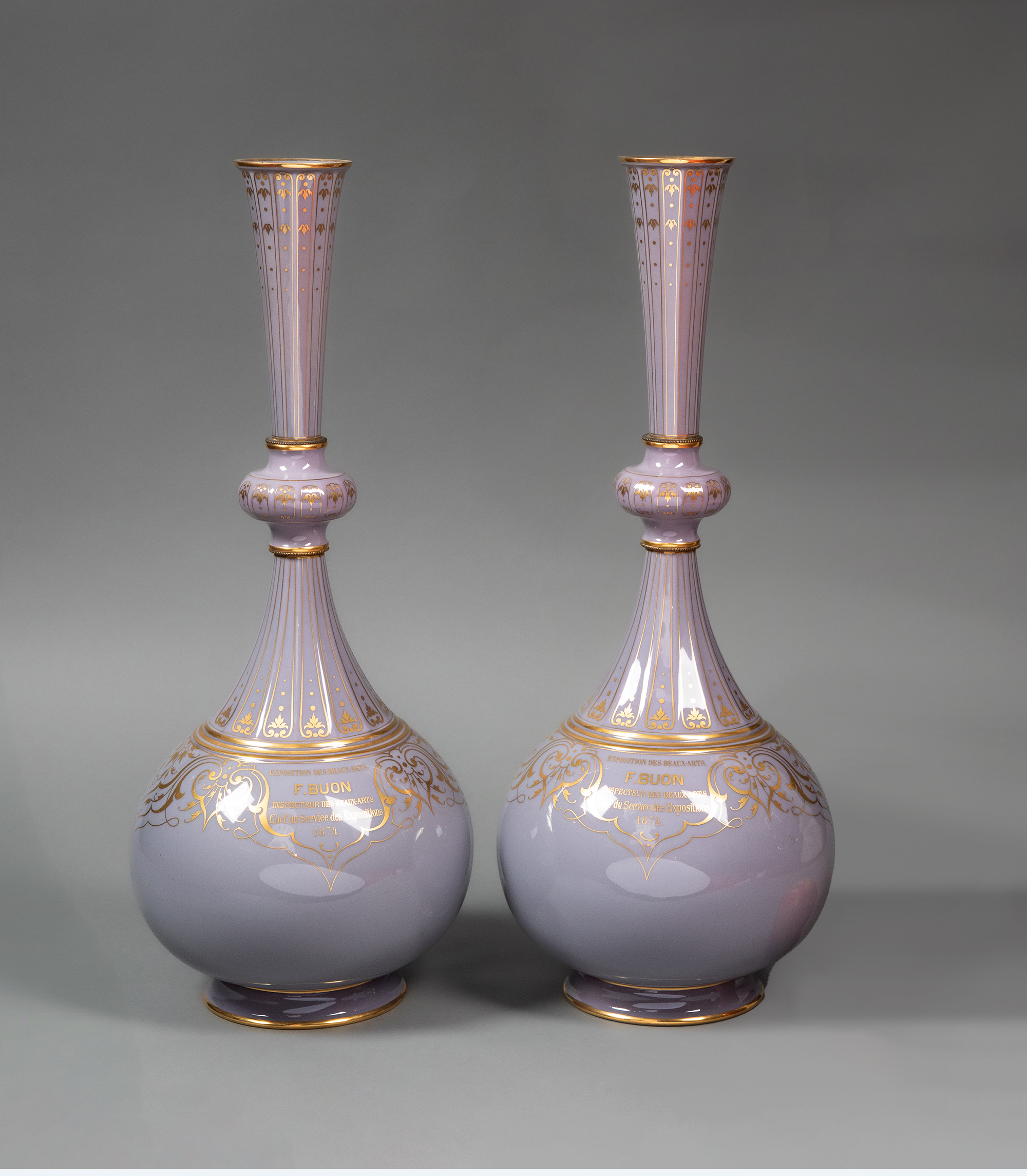 1874年代法国御窑塞弗尔出品美术展纪念版手绘描金花卉纹修饰粉紫色釉DELHI款造型长颈花瓶一对