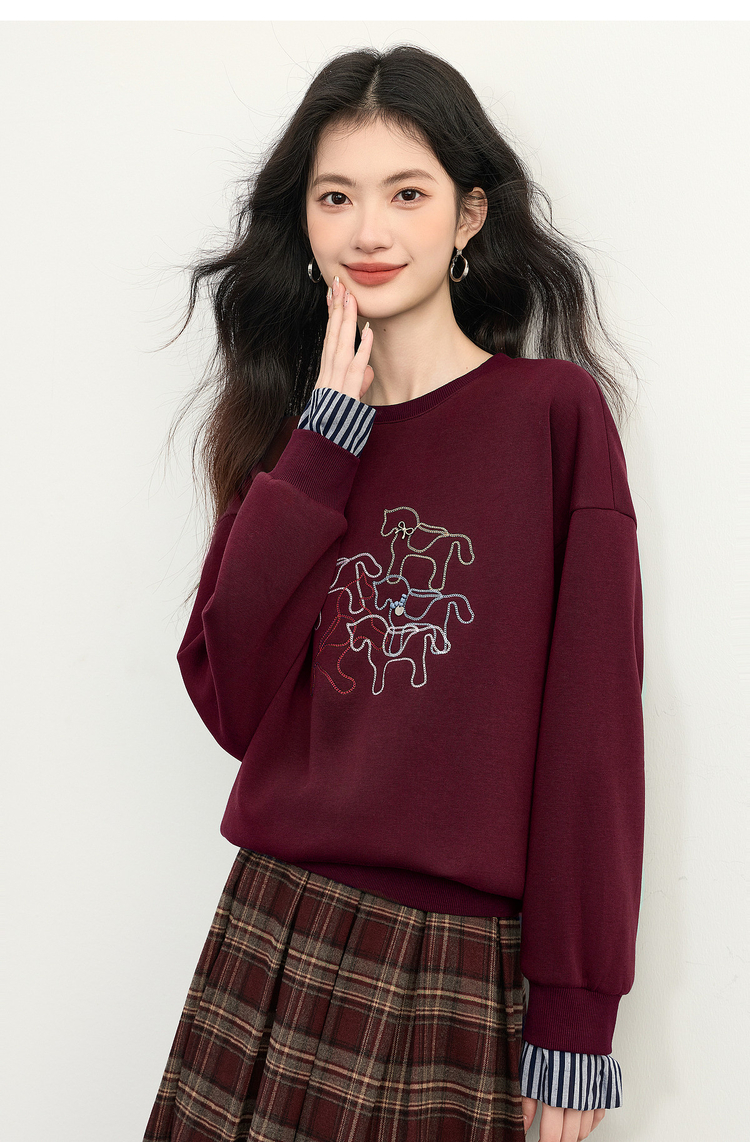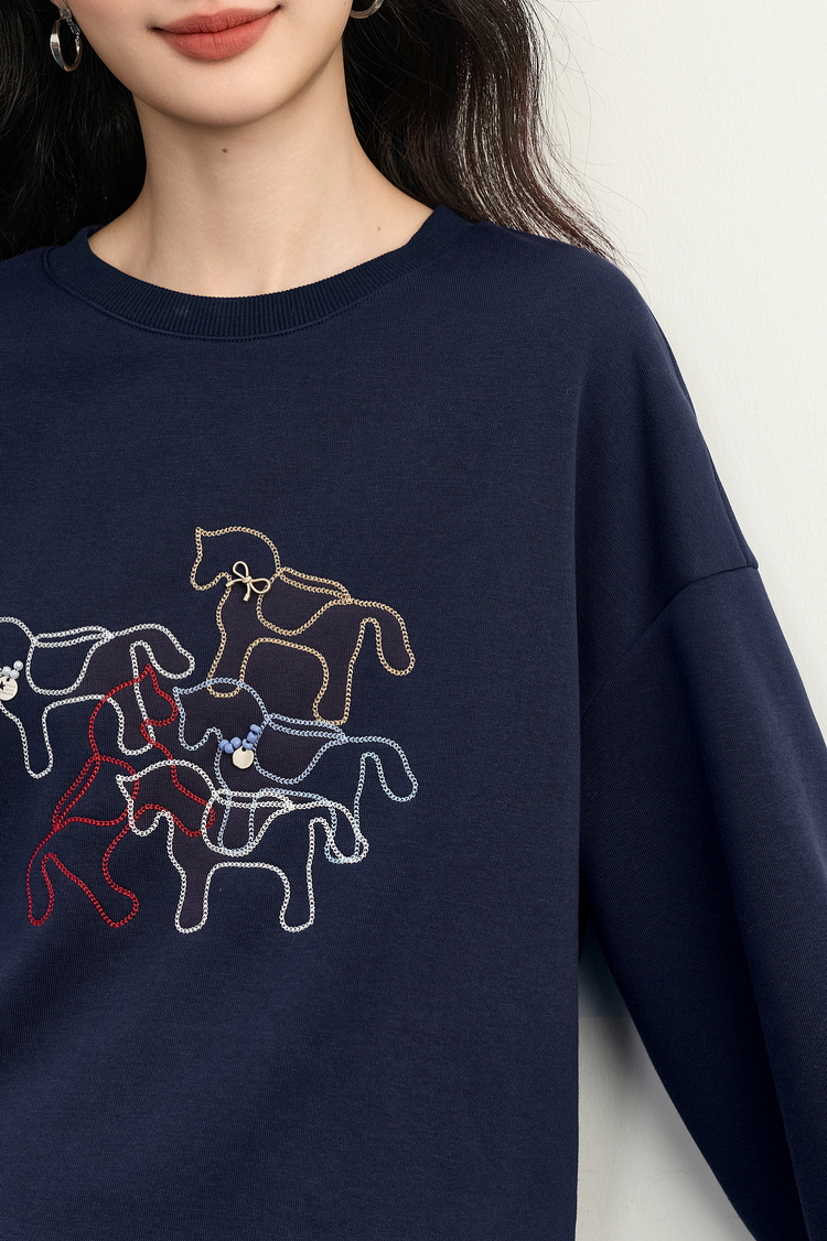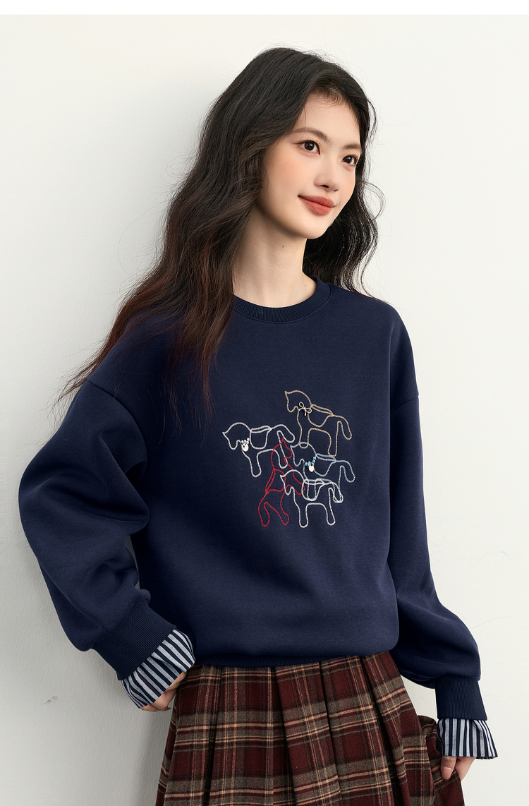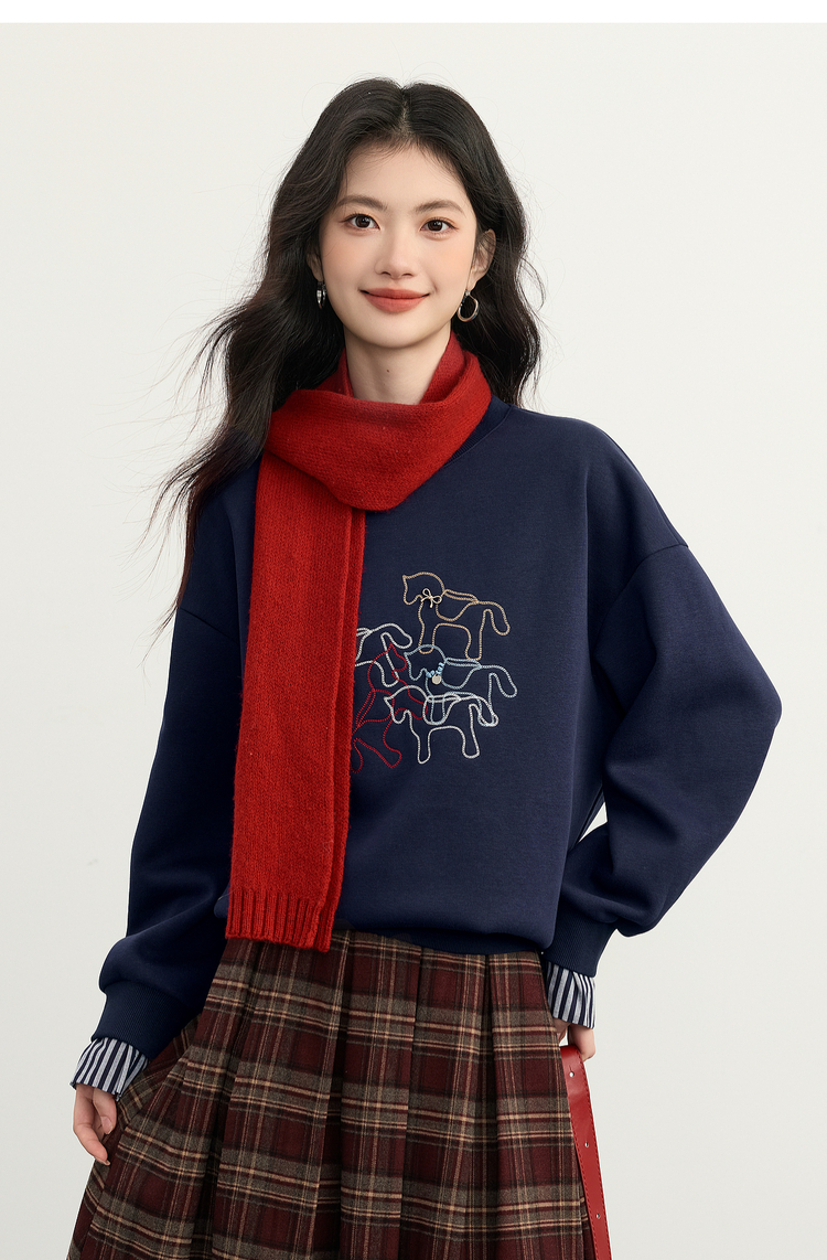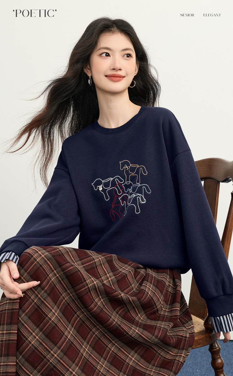 【年货节】熙世界小马图案刺绣磨绒卫衣女2025年秋冬慵懒长袖圆领上衣ins潮