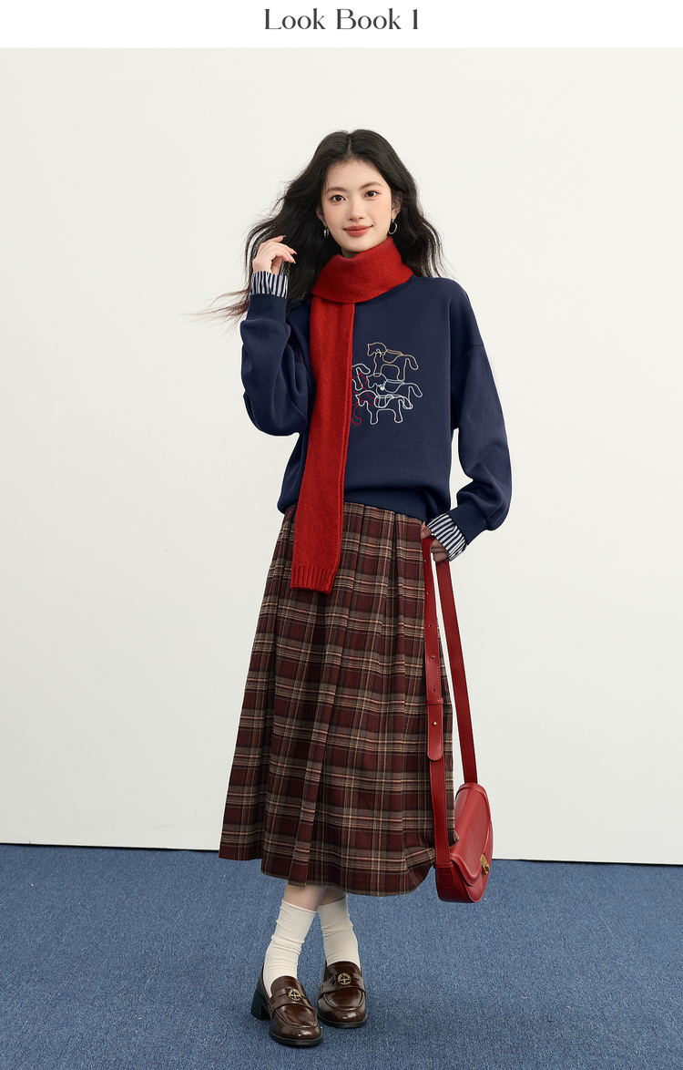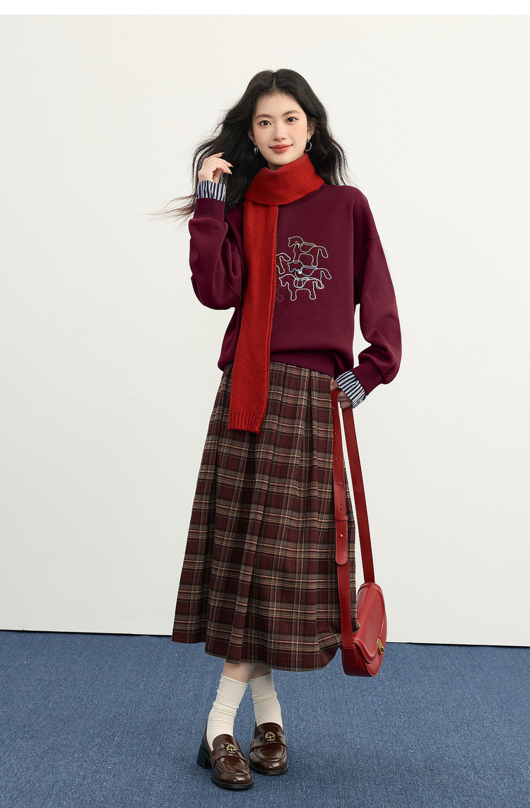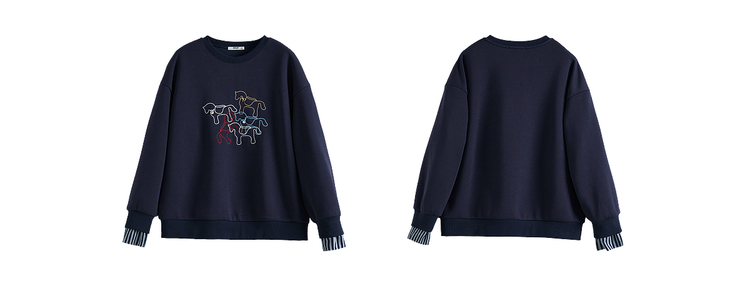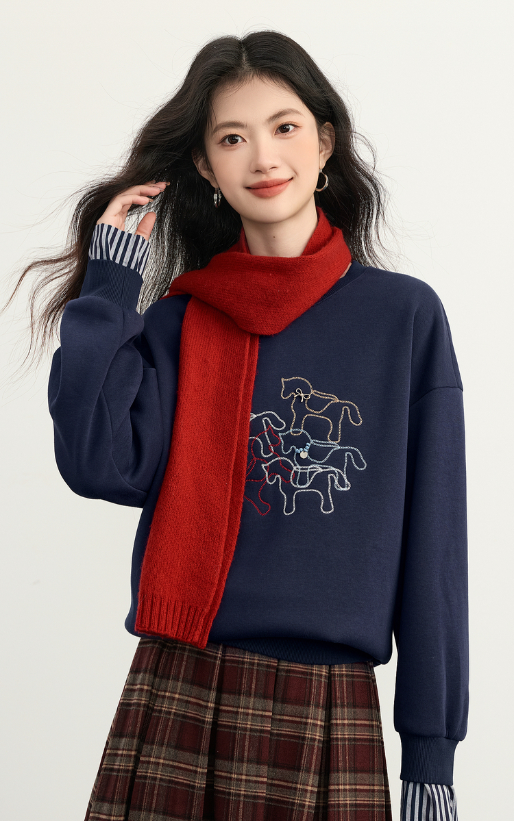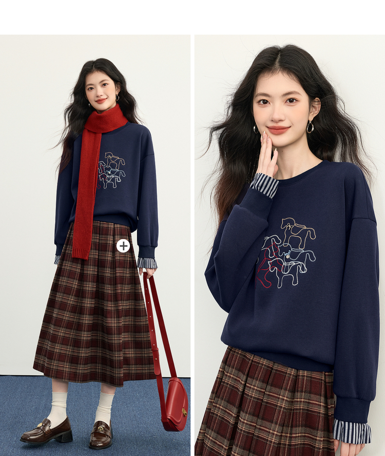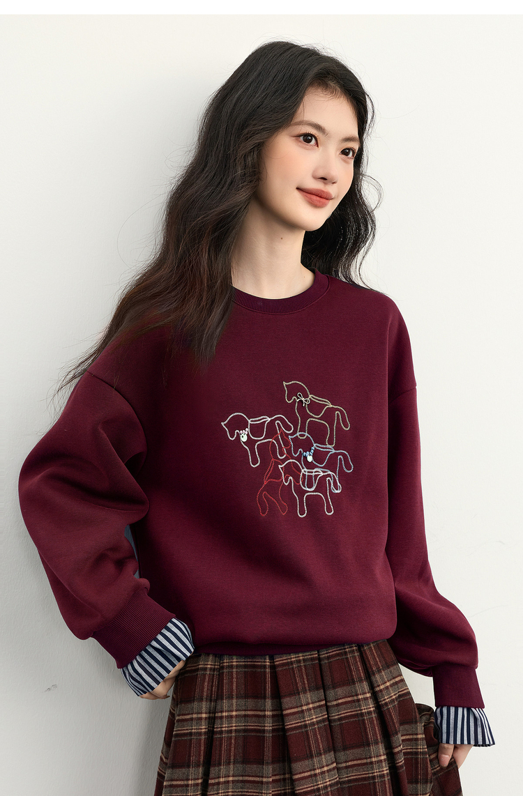 【年货节】熙世界小马图案刺绣磨绒卫衣女2025年秋冬慵懒长袖圆领上衣ins潮