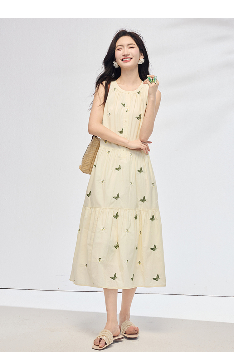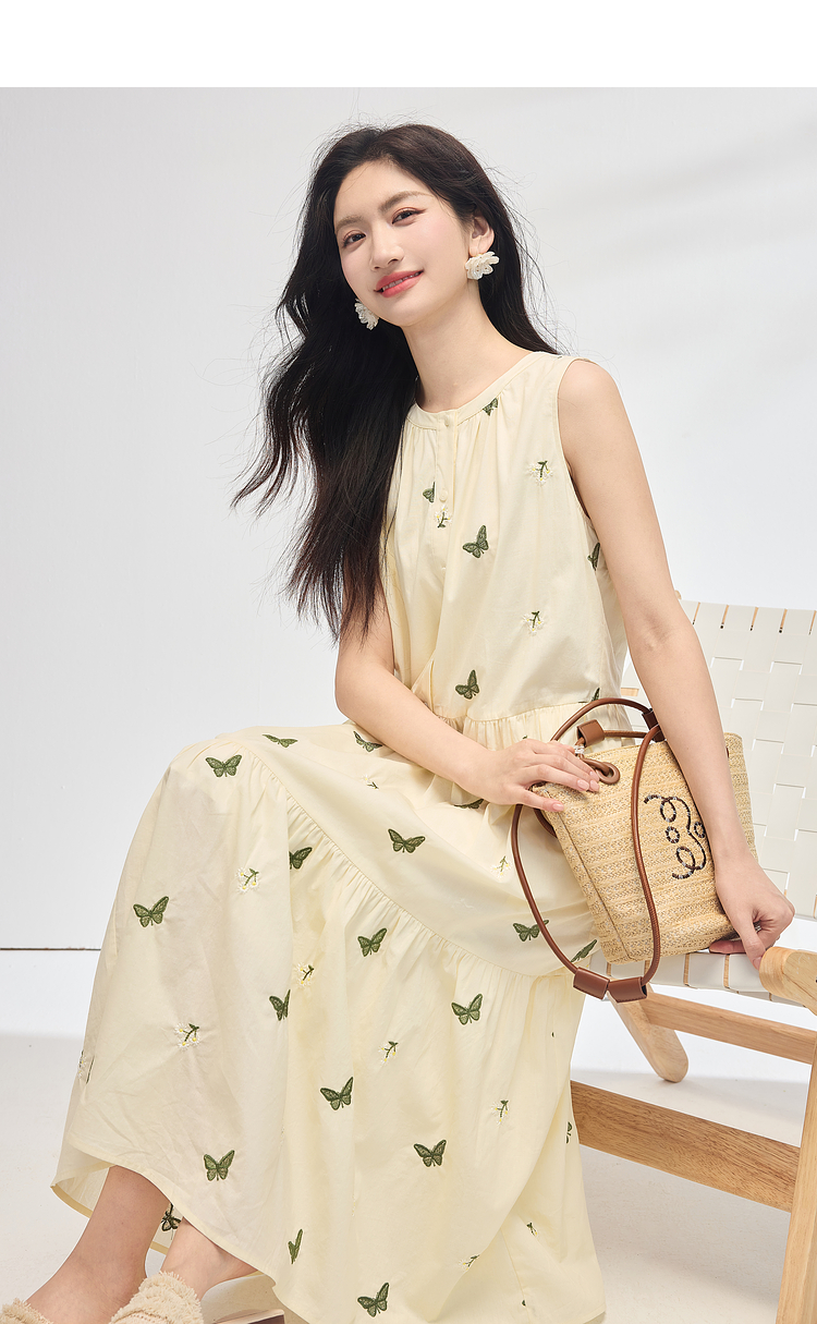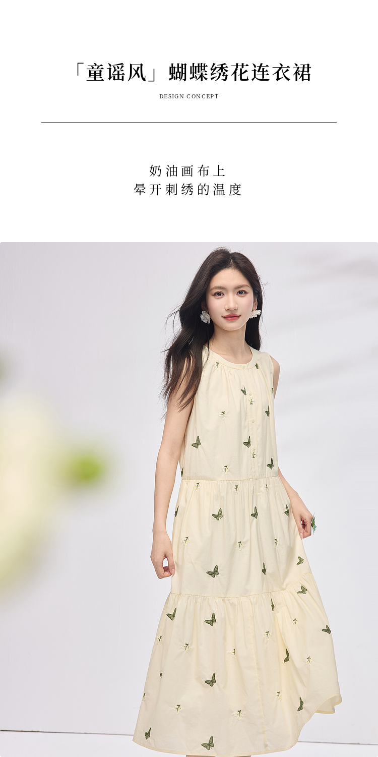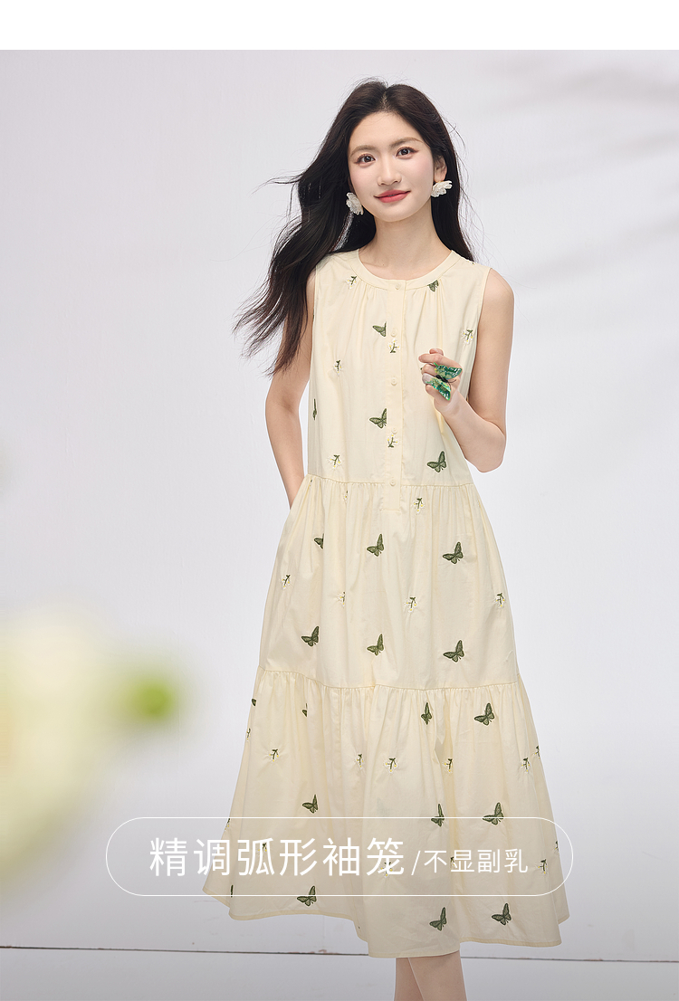 【专属特价】熙世界蝴蝶刺绣无袖连衣裙女夏2025新款优雅气质圆领a字背心长裙