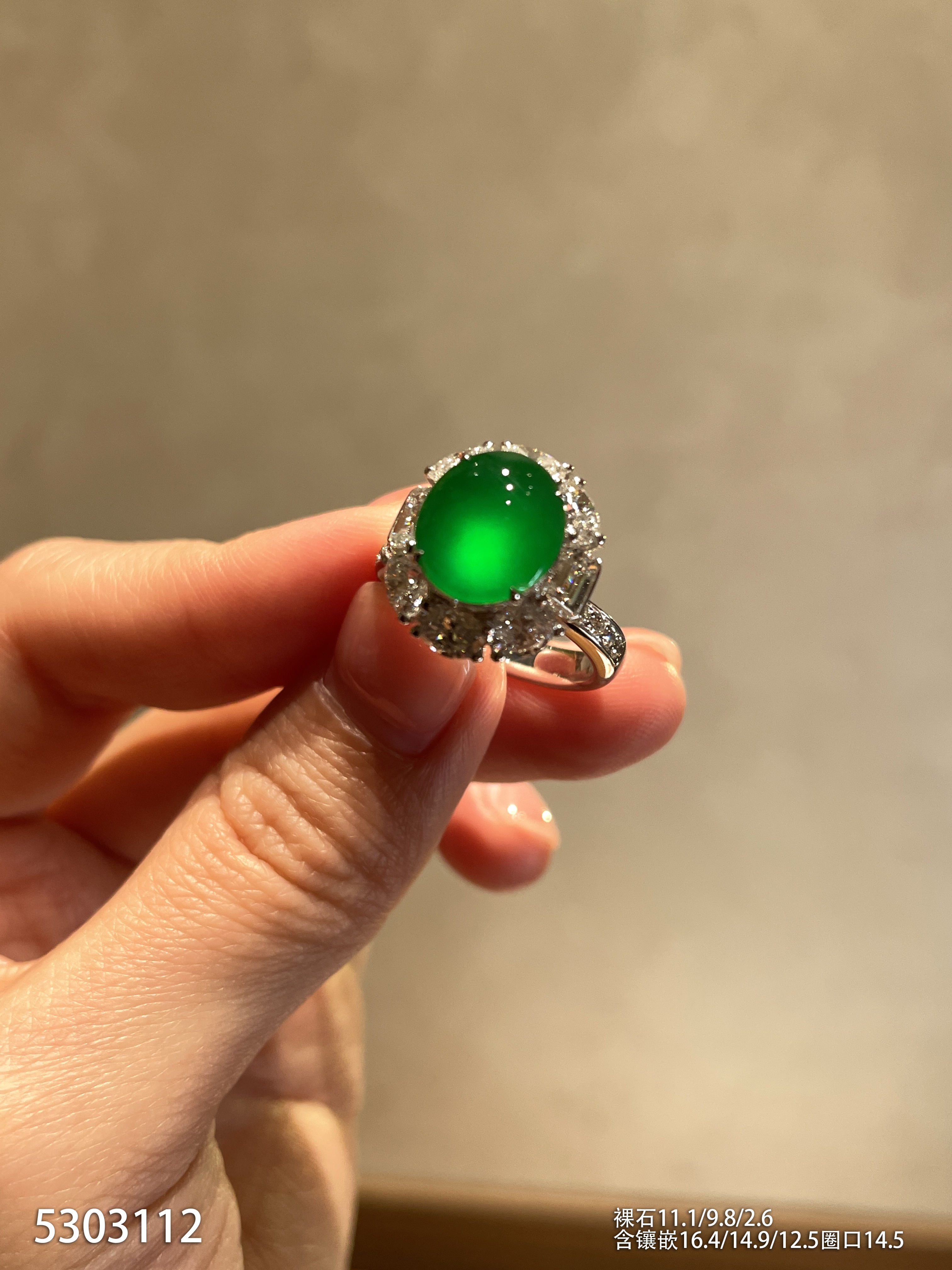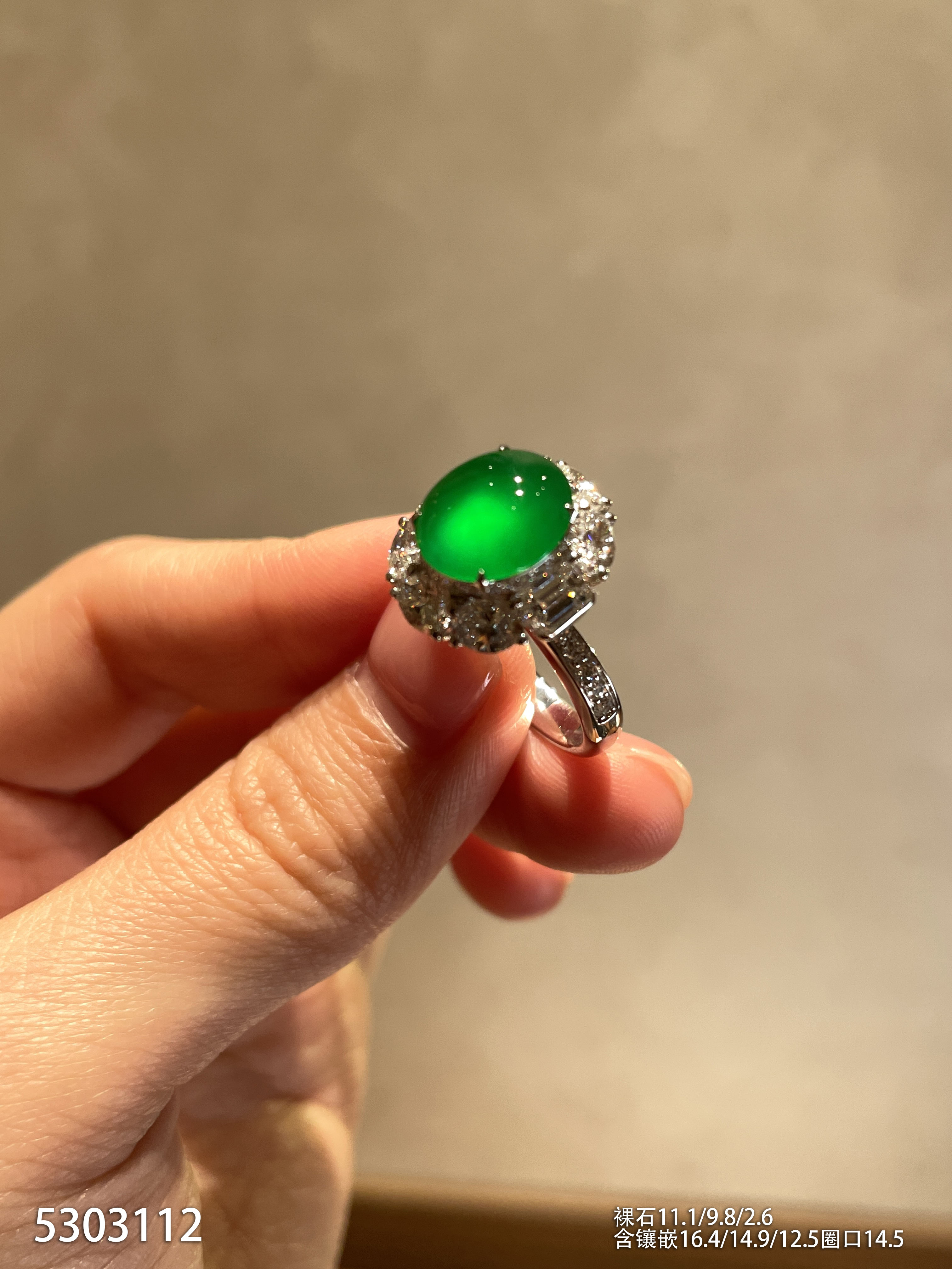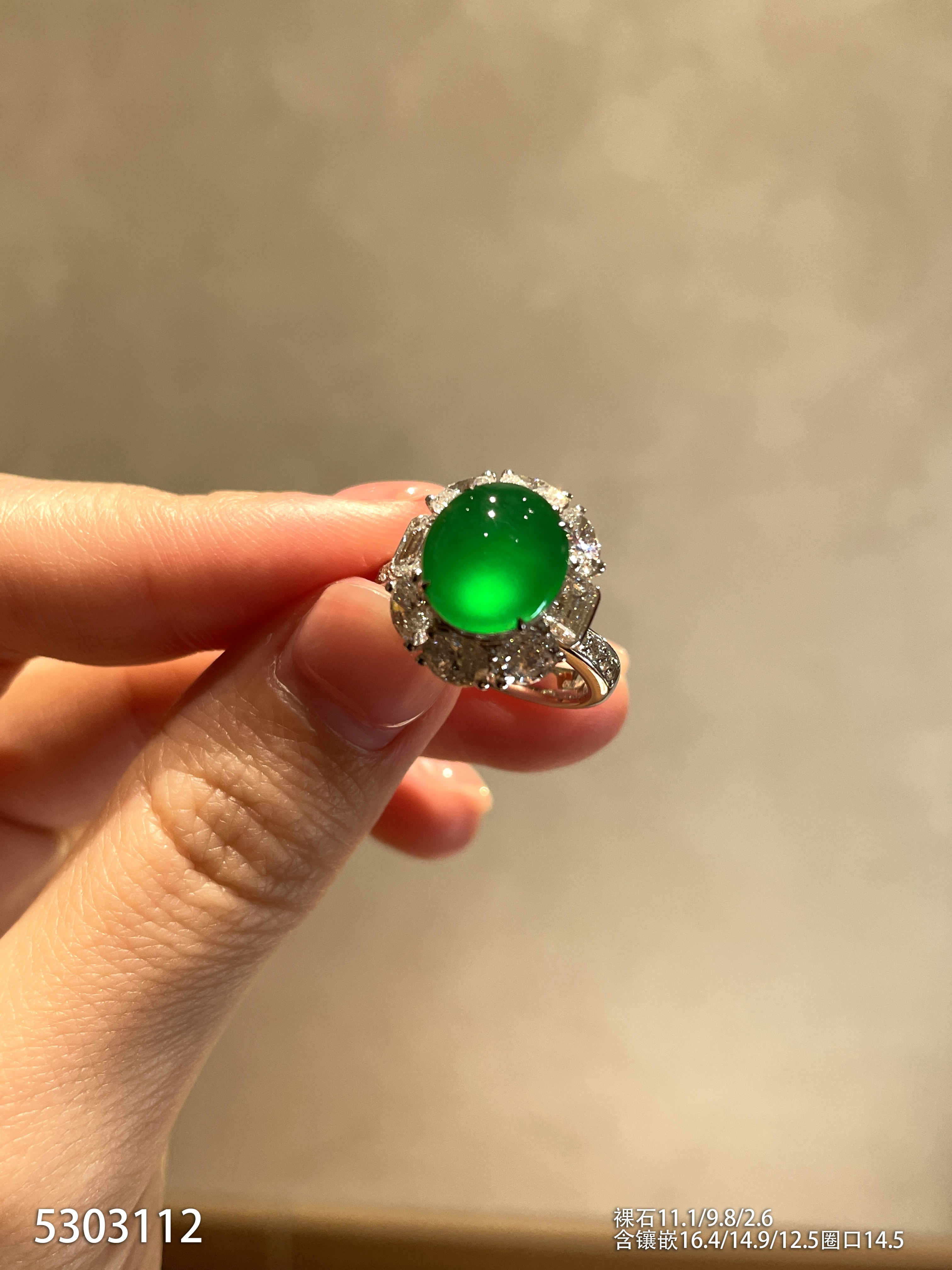 120-1232908,玻璃种木那艳绿蛋面戒指,具体价格微信咨询
