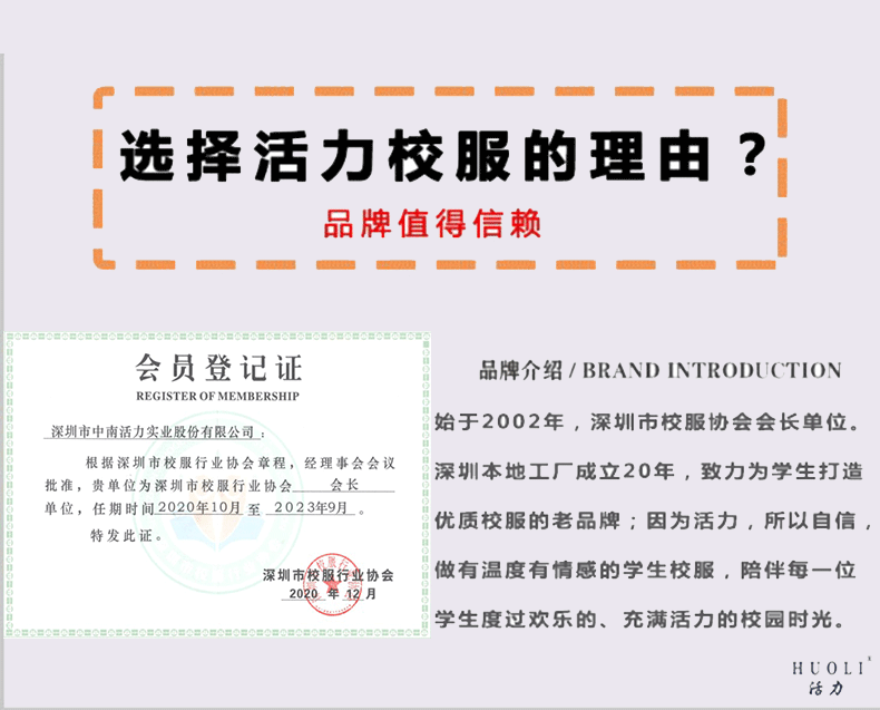 活力校服由深圳市中南活力实业股份有限公司创建的品牌,深圳二十一年老品牌,教育局中标企业;主营深圳校服、广州校服、东莞校服、佛山校服、肇庆校服、江苏校服、鞋袜、学生床上用品等学生课桌椅一站式教育领域产品