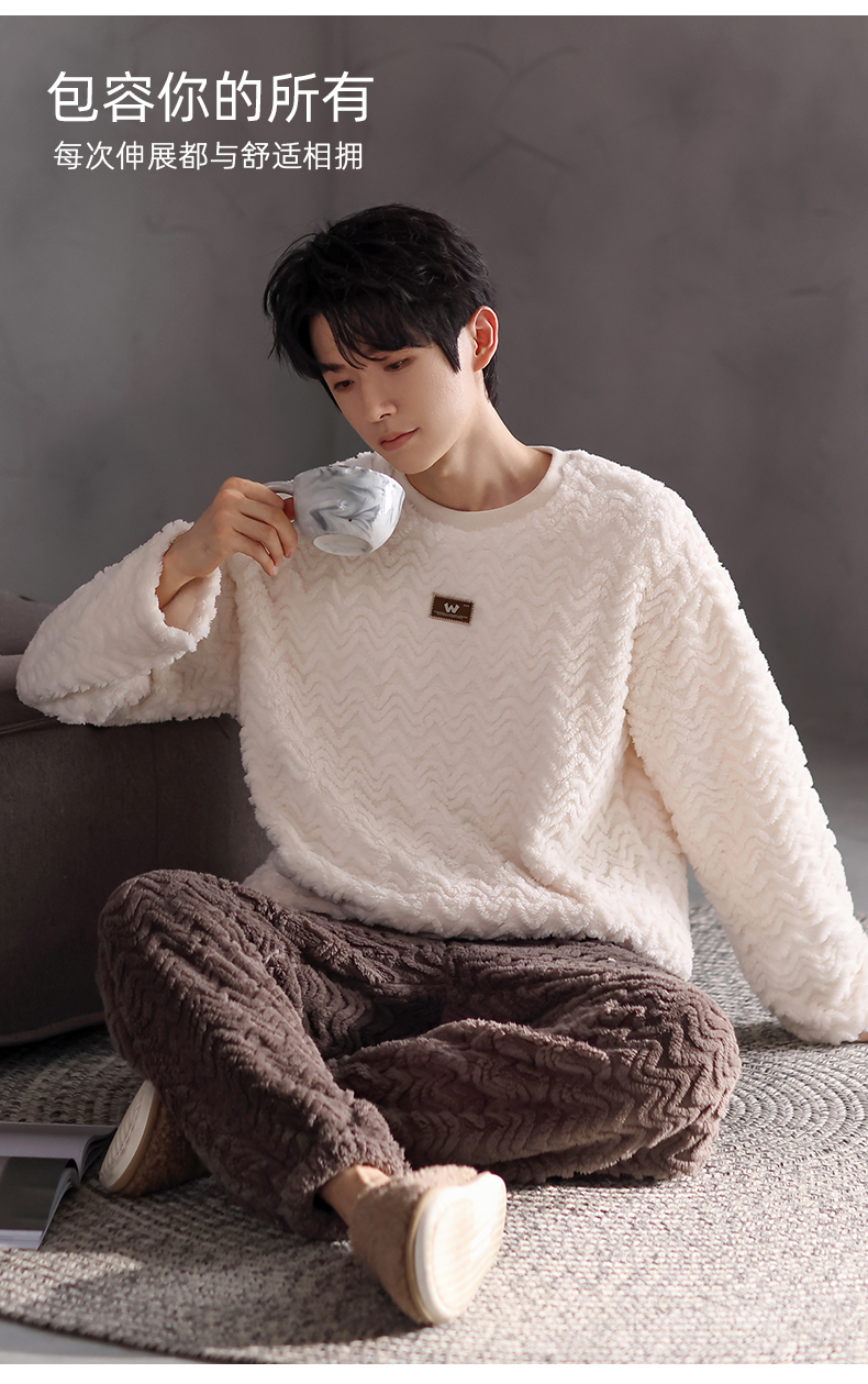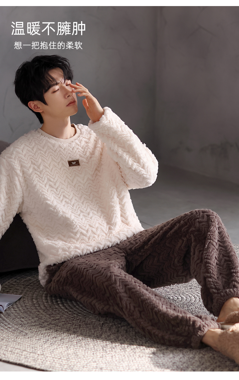 洁丽雅男士冬季法兰绒家居服套装加绒加厚柔软舒适泡芙绒保暖睡衣