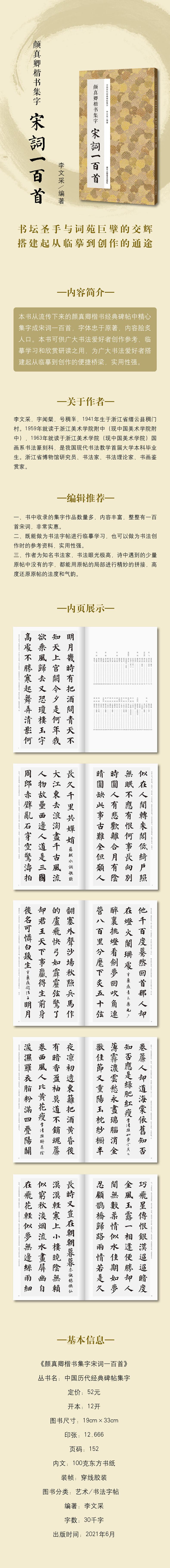 《颜真卿楷书集字宋词一百首/中国历代经典碑帖集字》一个版面呈现一首完整的颜真卿楷书集字宋词,共有一百首,供读者临摹学习、创作参考和欣赏研读之用。本选题为书法学习资料类图书,市场面广,且本书内容丰富,整整有100首集字宋词,比市场上的同类书多出三到五倍。