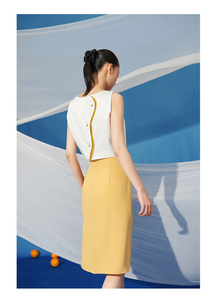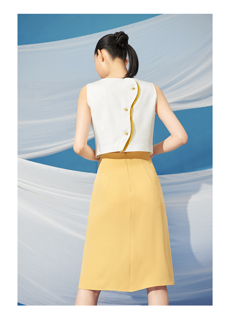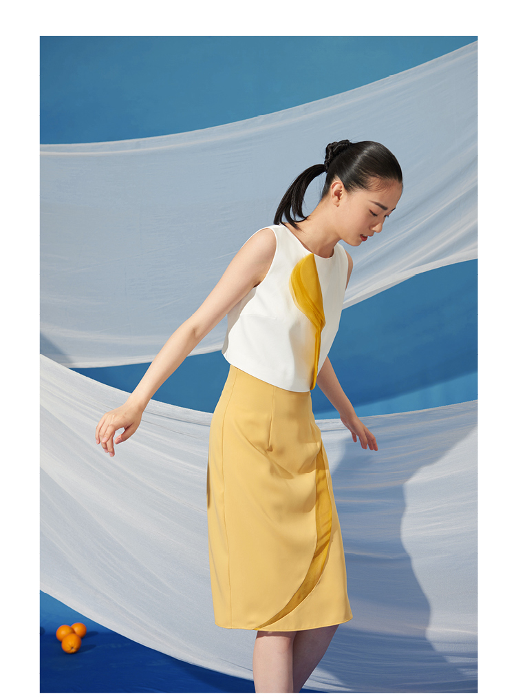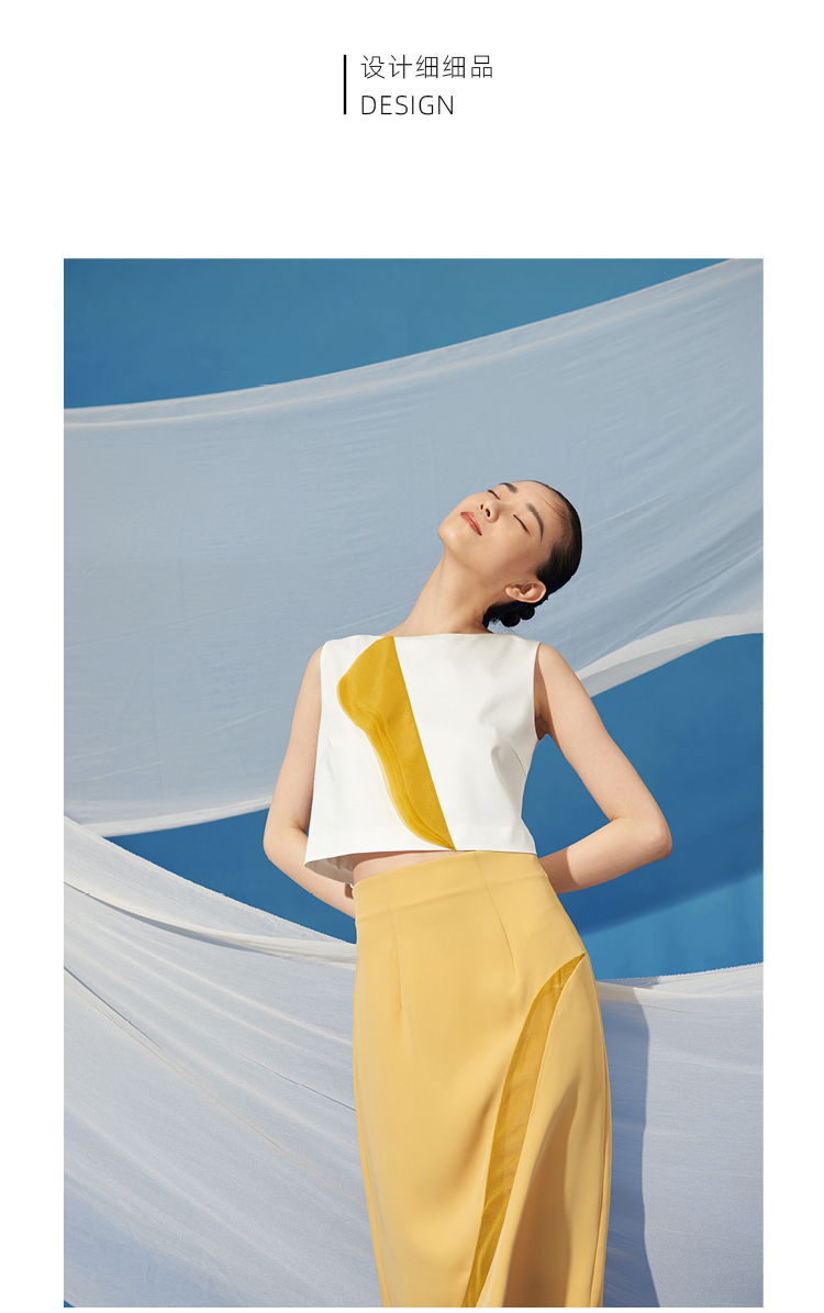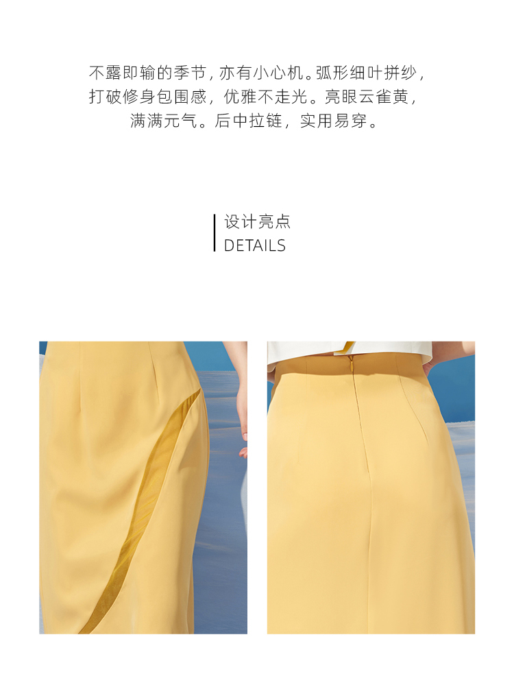【星月叶】少女感弧形细叶拼纱云雀黄高腰半裙/000100A