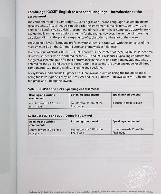 使用带有答案的剑桥 IGCSE™ 英语作为第二语言实践测试资源帮助您的学生自信地准备评估。 该产品包含四个更新的模拟测试,使学生能够在学习期间培养技能,并在考试前提高他们的阅读、写作、口语和听力能力。 通过 Cambridge GO 可以获得答案、额外的口语测试、音频和音频脚本。 打印资源中也提供了答案。