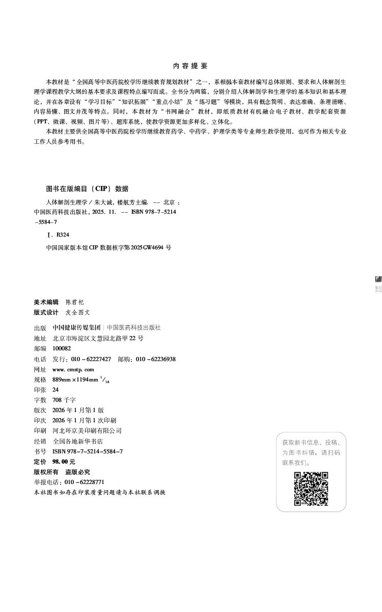 人体解剖生理学 全国高等中医药院校学历继续教育规划教材 朱大诚 楼航芳 主编 供药学 中药学 护理类等专业用 中国医药科技出版社