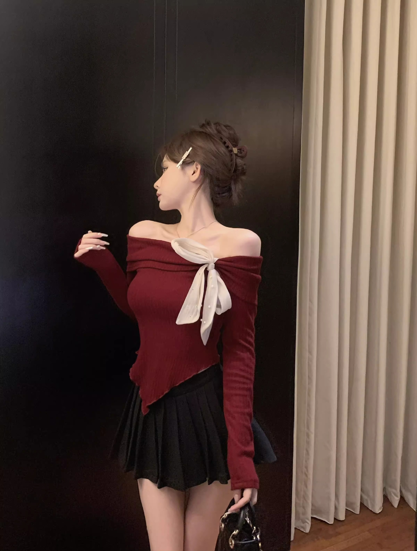 【敲好看!百搭一字肩T恤】秋季蝴蝶结一字领露肩长袖T恤辣妹修身显瘦收腰小众独特上衣ins女。rc