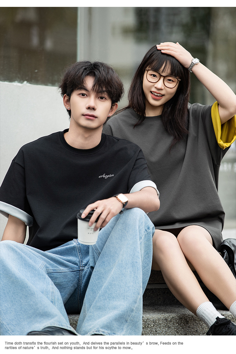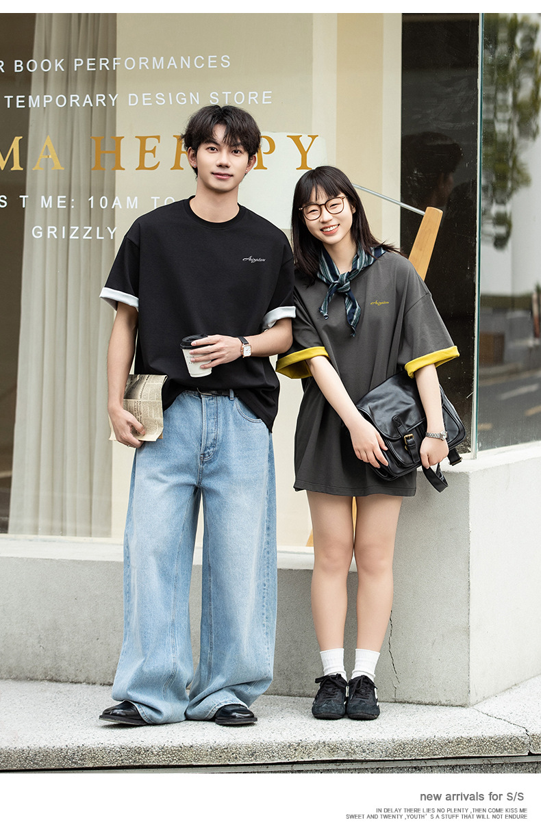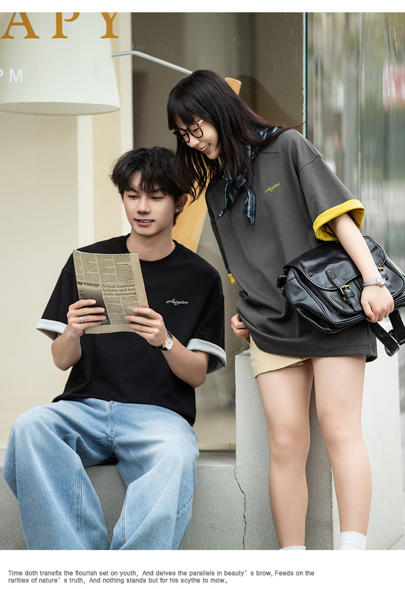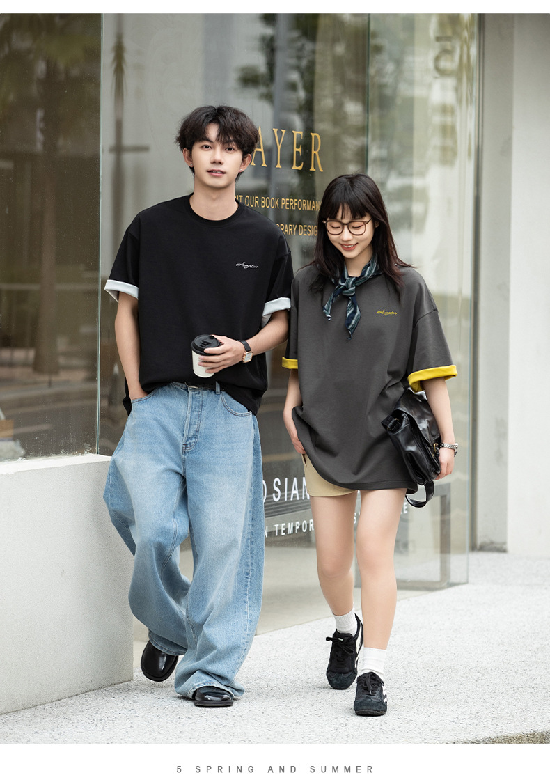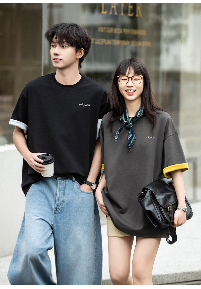 【YW】无忧购“清仓大促”轻奢老钱撞色字母刺绣情侣宽松休闲半袖体恤衫MT7214(截单后3-5天发货)