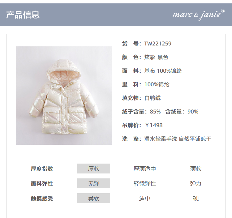 马克珍妮冬装新款 女童炫彩中长款加厚保暖羽绒服221259