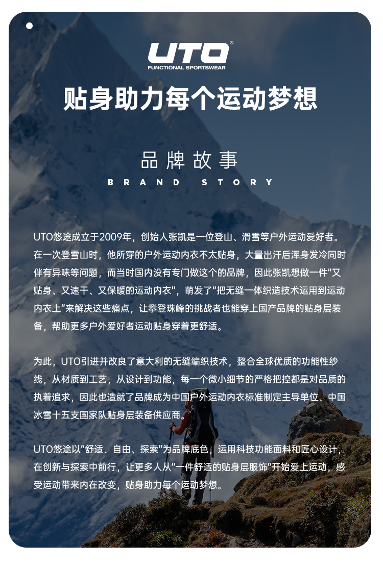 UTO悠途潜心于贴身运动装备的研发、设计和生产。从纤维到组织,从设计到工艺,在无缝贴身运动装备领域,树立国内标杆。 UTO着力于品牌互联网化,不断采集大量运动数据,为跑步、健身、滑雪等不同类型的运动爱