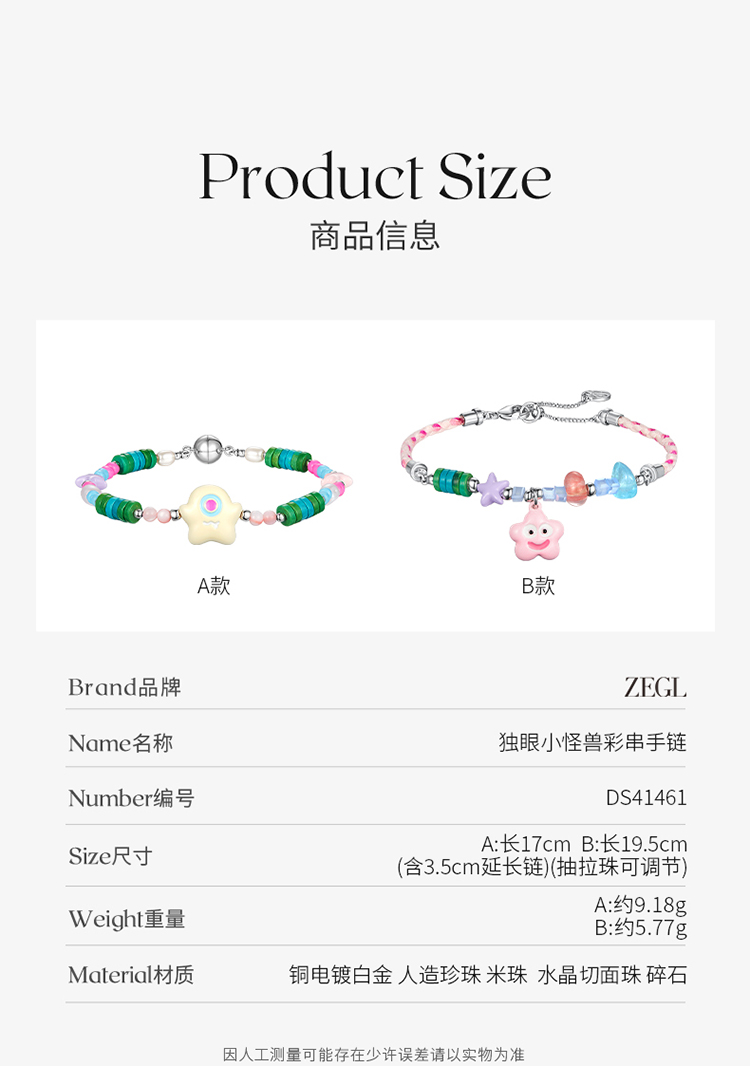 ZEGL设计师小怪兽多巴胺串珠笑脸手链女轻奢小众精致可爱彩色手饰