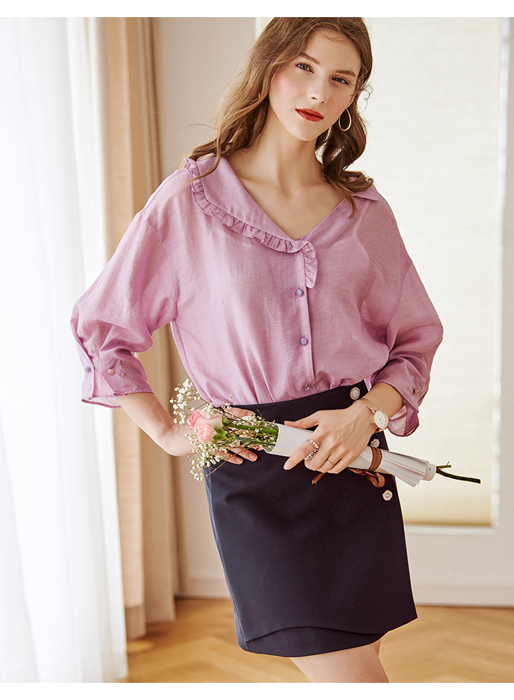 欧芮儿莱赛尔抽绳领口印花设计2026年新款夏季紫色休闲风短袖T恤
