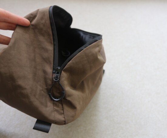 当物品不多时 可沿拉链下的位置 斜着盖下来 包身就瘪了 哈~