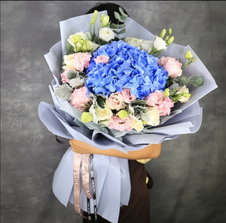 花材: 1个蓝色绣球,19朵混搭玫瑰,尤加利,桔梗搭配!
