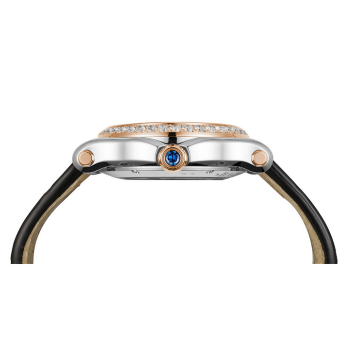 镜面材质 | 蓝宝石水晶玻璃 | 表盘 | 精钢18K玫瑰金镶钻表壳 银色与玑镂饰纹中心表盘 罗马文及条形时标,7钻快乐钻石 日期显示 透底 |