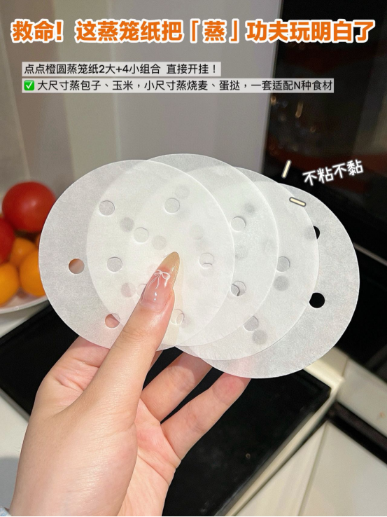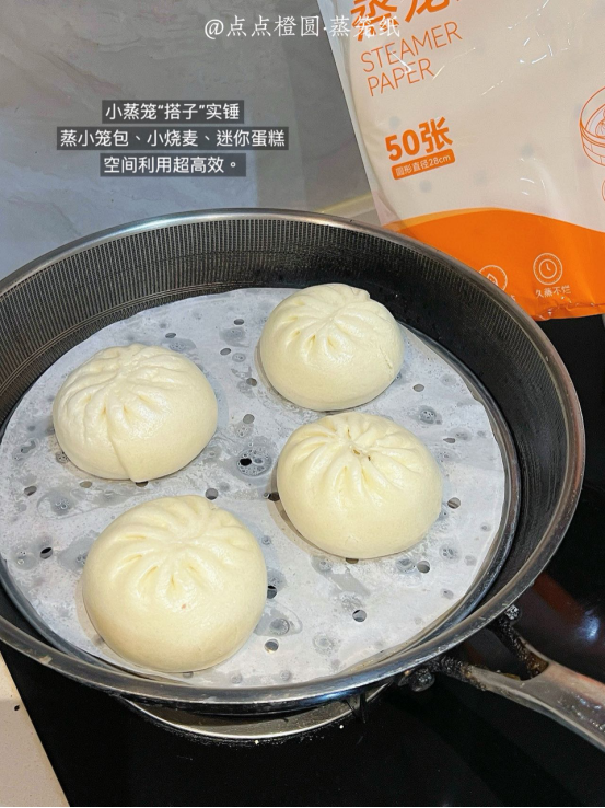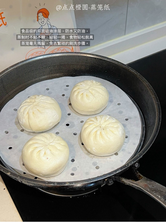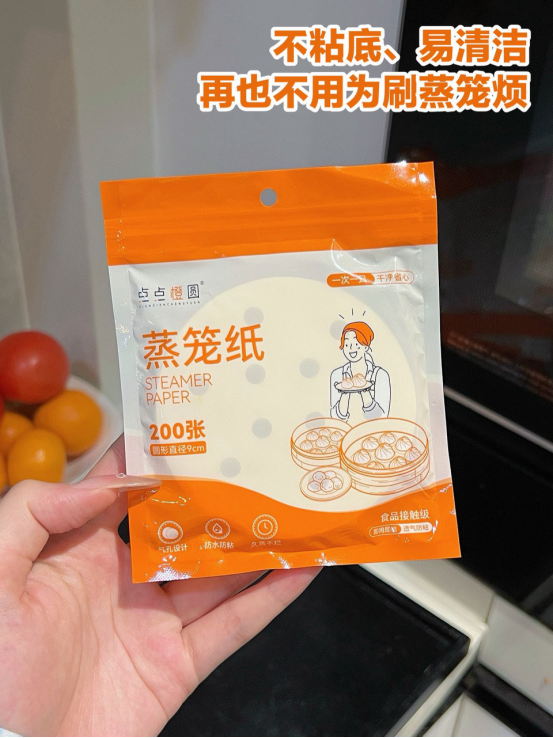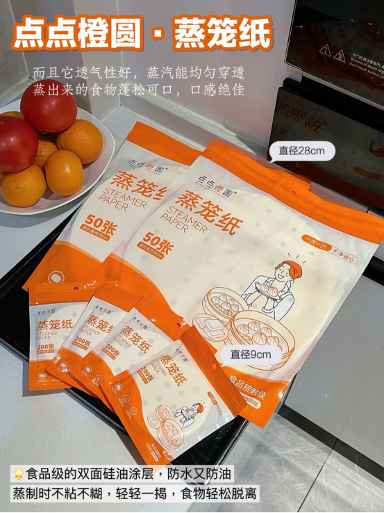 厨房小白还在为蒸包子、蒸玉米粘锅而烦恼 点点橙圆蒸笼纸来救场啦! 它直径28cm,完美适配家中常见的中型蒸锅。