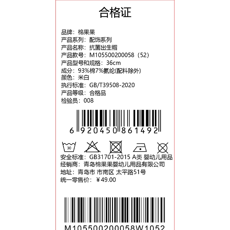 棉果果春季新品商场同款男童女童纯棉新生儿婴儿抗菌出生帽M105500200058